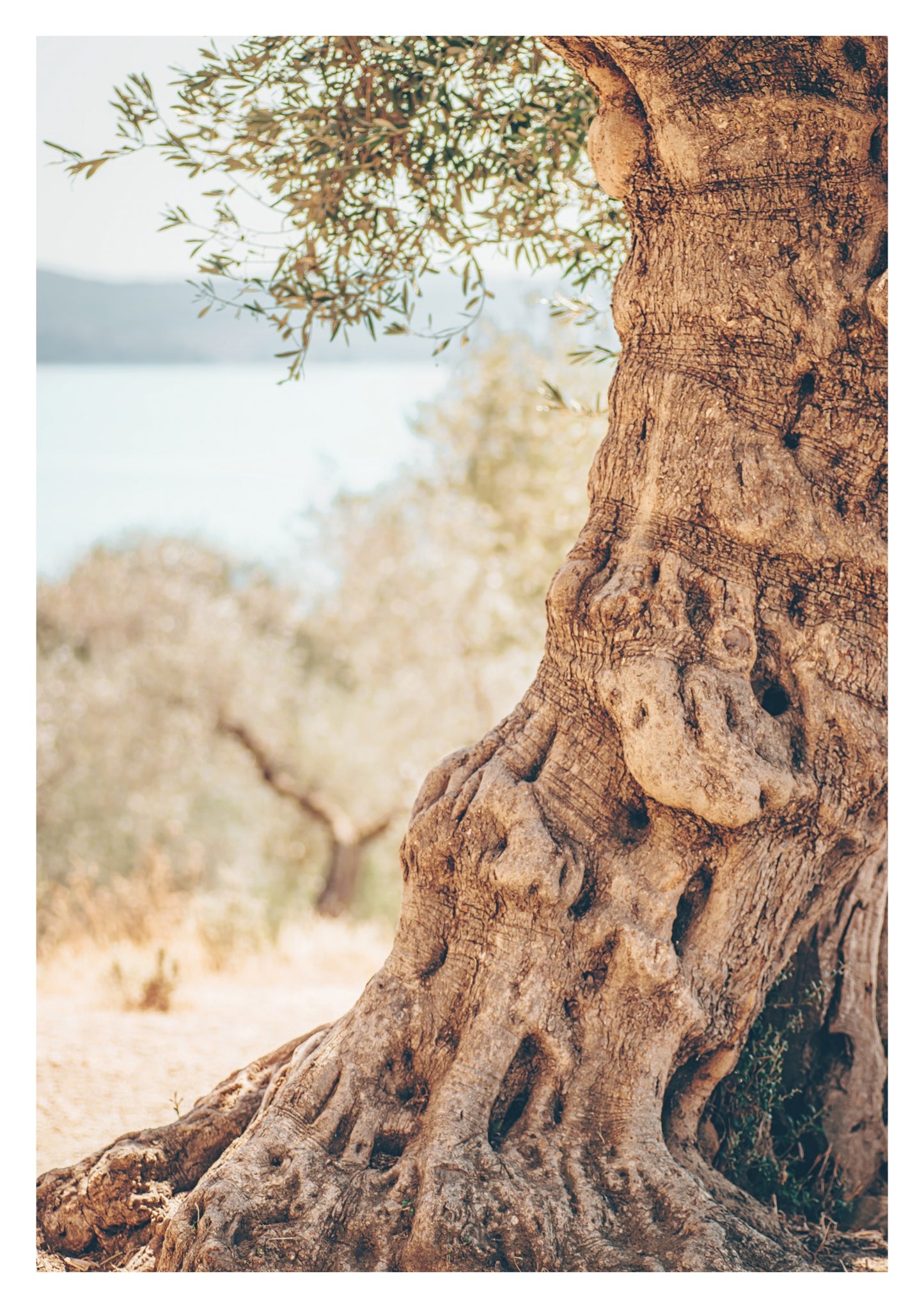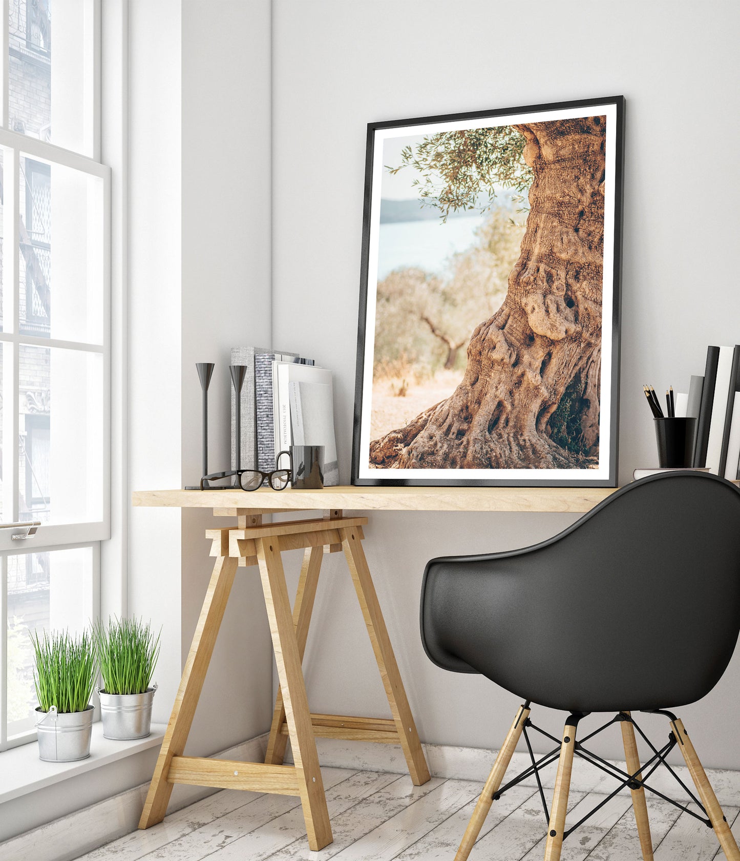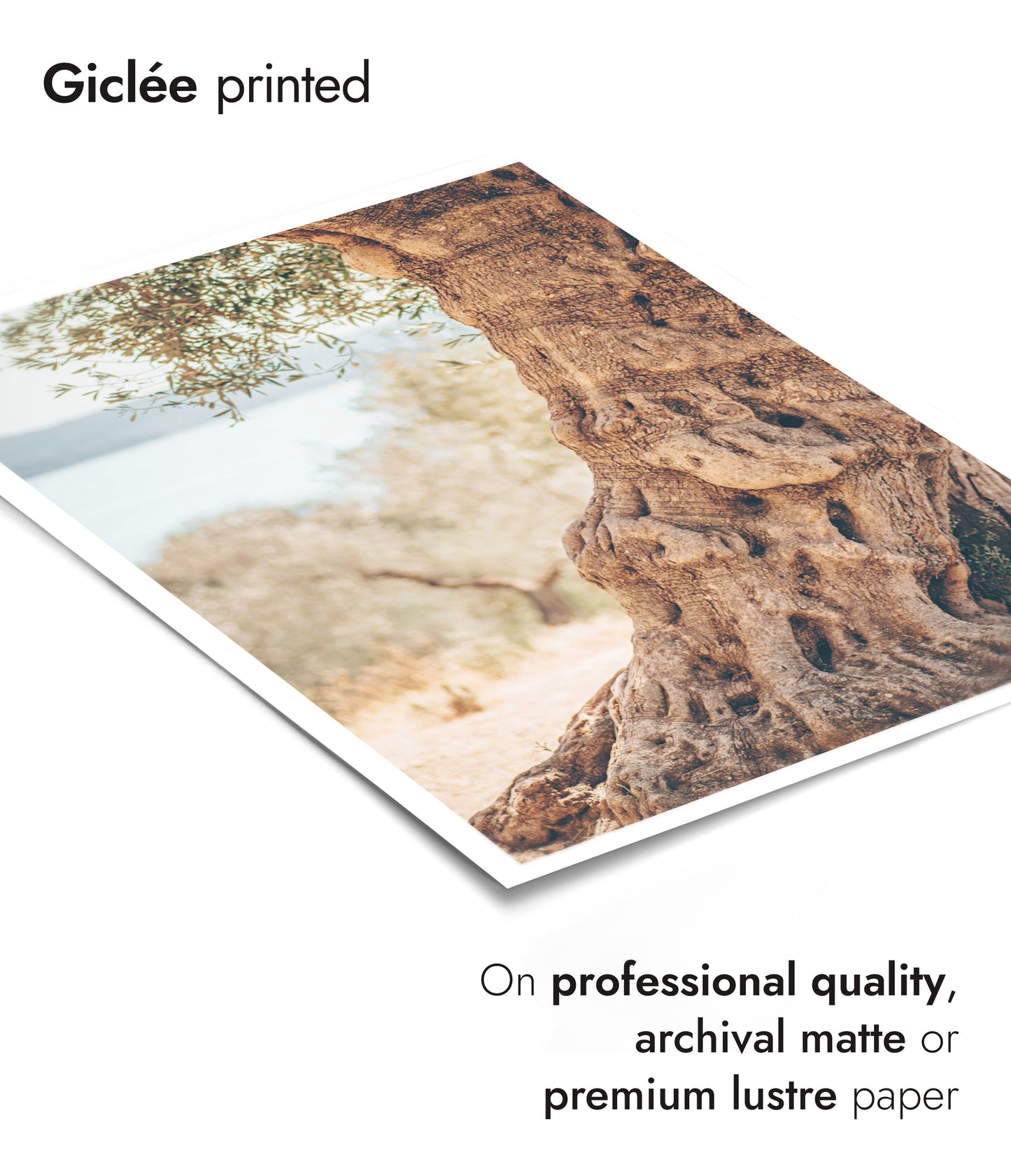 This photographic poster, titled "Olive Tree," captures the intricate texture of an ancient olive tree trunk against a serene natural backdrop. The detailed close-up showcases the tree's gnarled bark and the subtle play of light and shade, evoking the timeless beauty of nature. Perfect for adding a touch of organic elegance to any space.