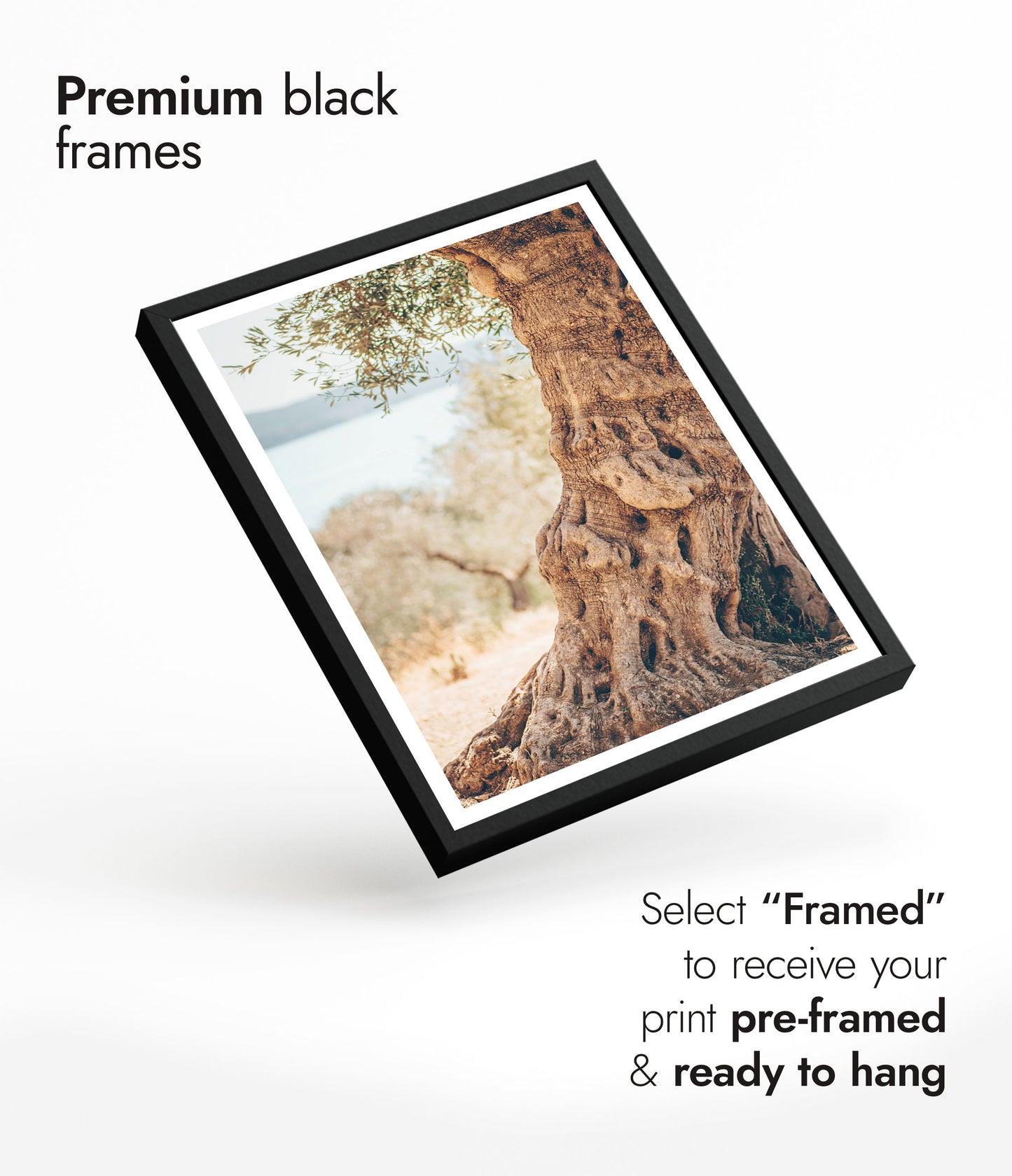 Solid wood frames available in black stained or natural finishes, with UV resistant acrylic glass. Framed orders arrive pre-installed with your choice of print, ready to hang. Available in all print sizes.
