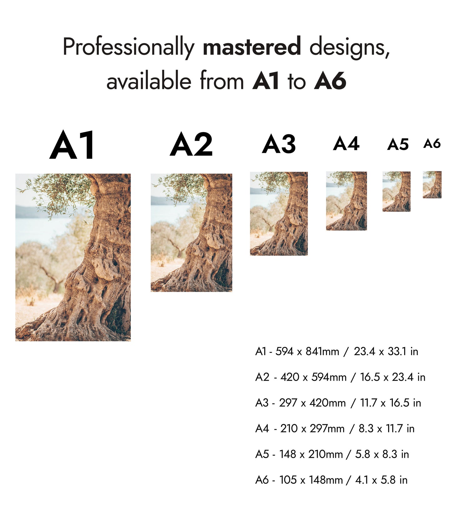 8 colour giclée print process on high-quality 230gsm archival matte paper. All our paper is FSC Certified and prints come with a lifetime fade-resistance guarantee.