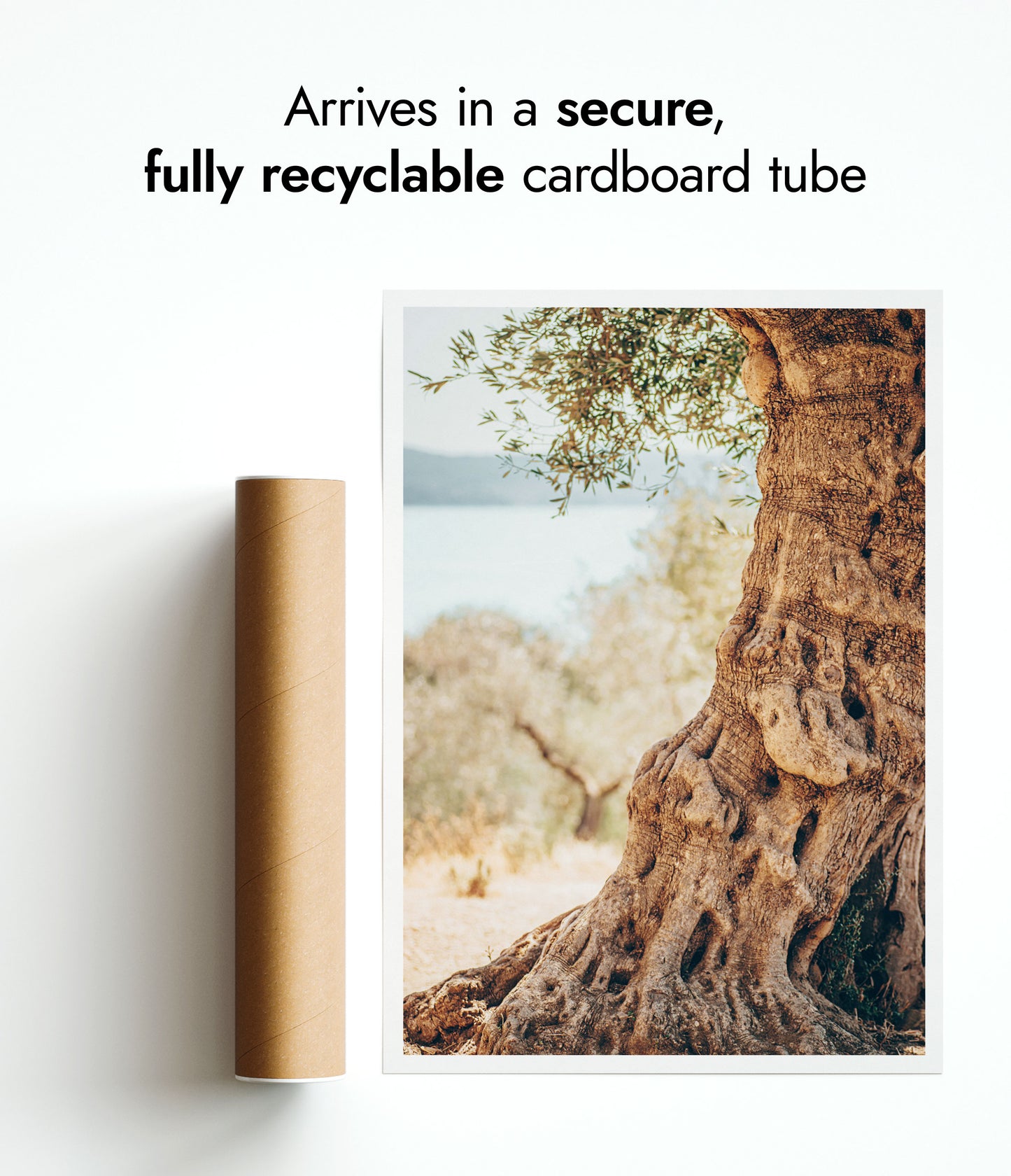 All orders are securely packed in recyclable, eco-friendly solutions. Frames are protected with sustainable bubble wrap alternatives inside thick boxes. Print only orders are shipped in heavy-duty cardboard tubes or protective hard-backed envelopes.