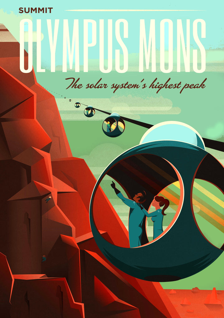 This vintage-styled Olympus Mons poster showcases the solar system’s highest peak in an illustrative, graphic design. Set under a green sky, it features bold red mountain cliffs with futuristic tourists ascending in a panoramic pod. Perfect for space and sci-fi enthusiasts, this art print beautifully blends retro aesthetics with celestial exploration themes. Ideal for adding character to any room.