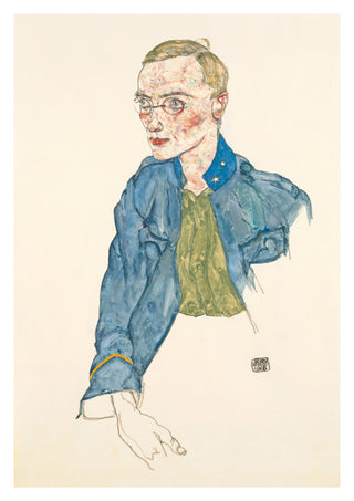 This "One-Year Volunteer Private" poster by Egon Schiele captures an expressionist portrait of a soldier. The artwork features a man in a uniform with a blue jacket and a contemplative expression, highlighted by Schiele's distinctive use of bold lines and muted tones. This intriguing piece exudes a sense of introspection and historical depth, typical of Schiele's style. Perfect for art and history enthusiasts.