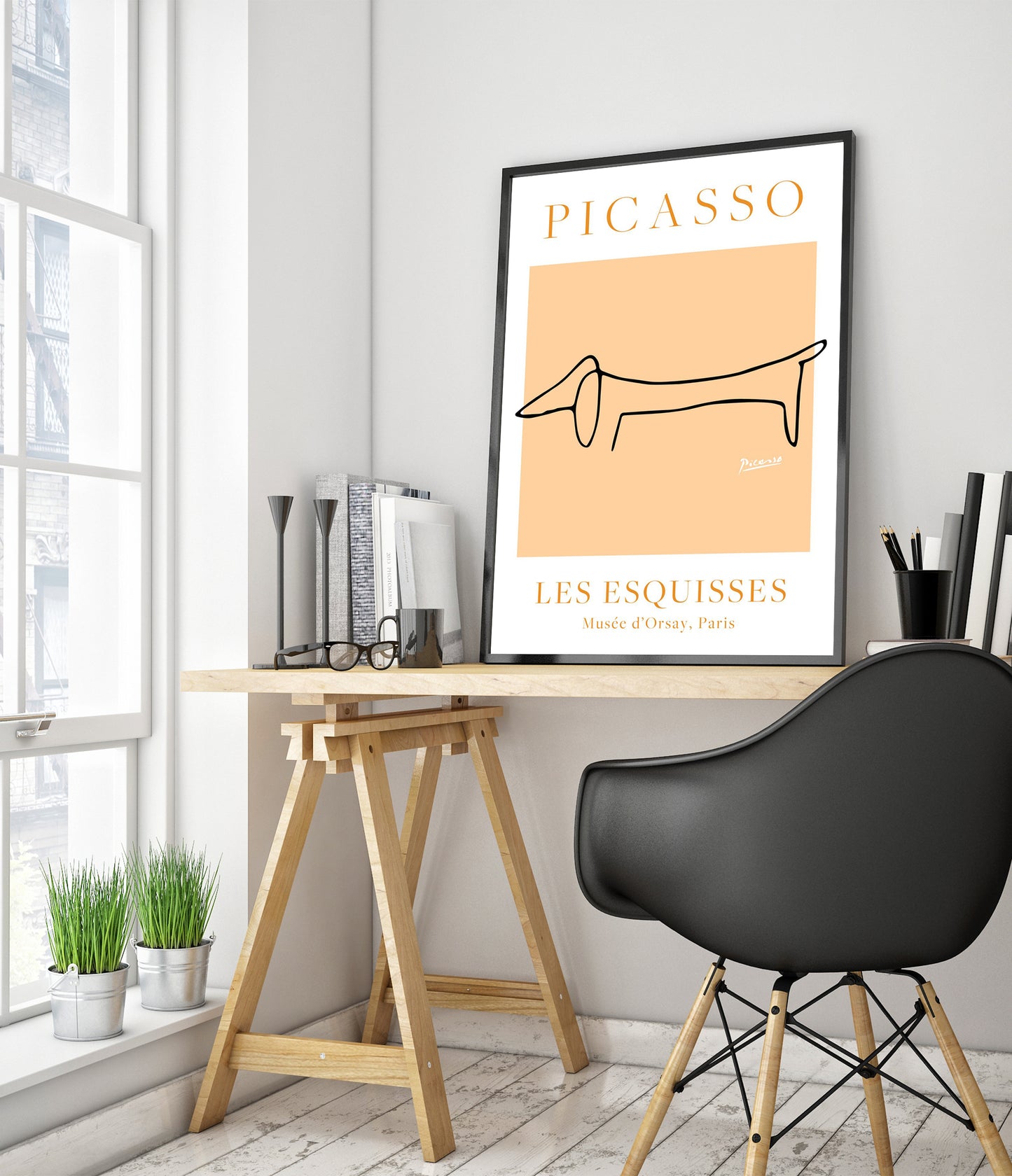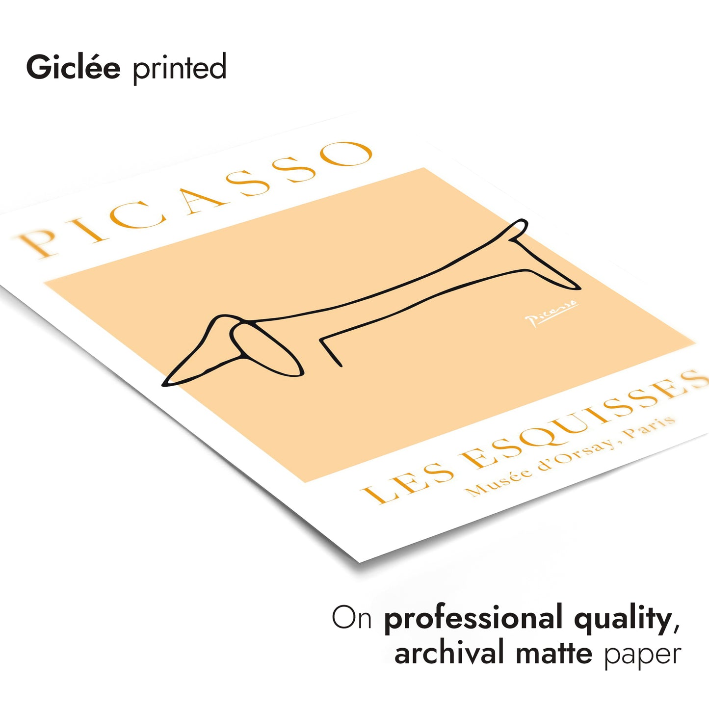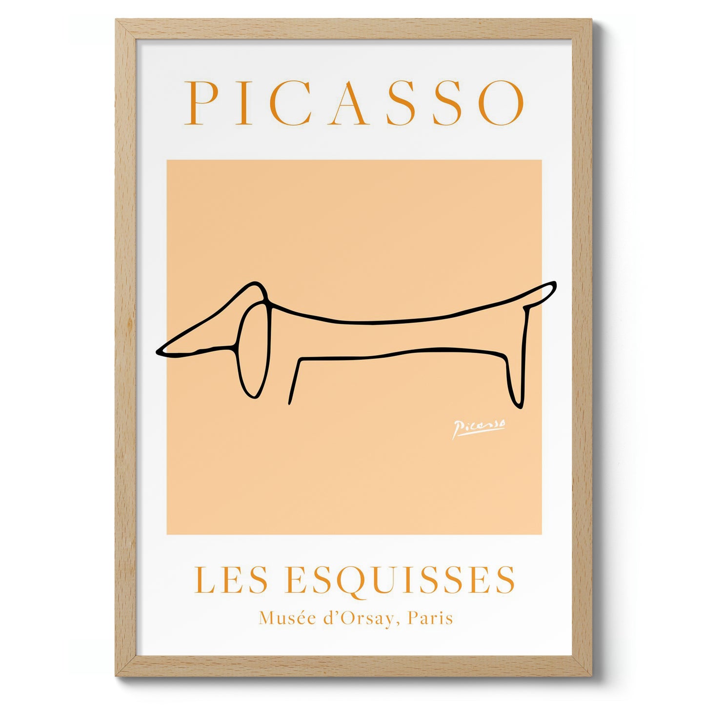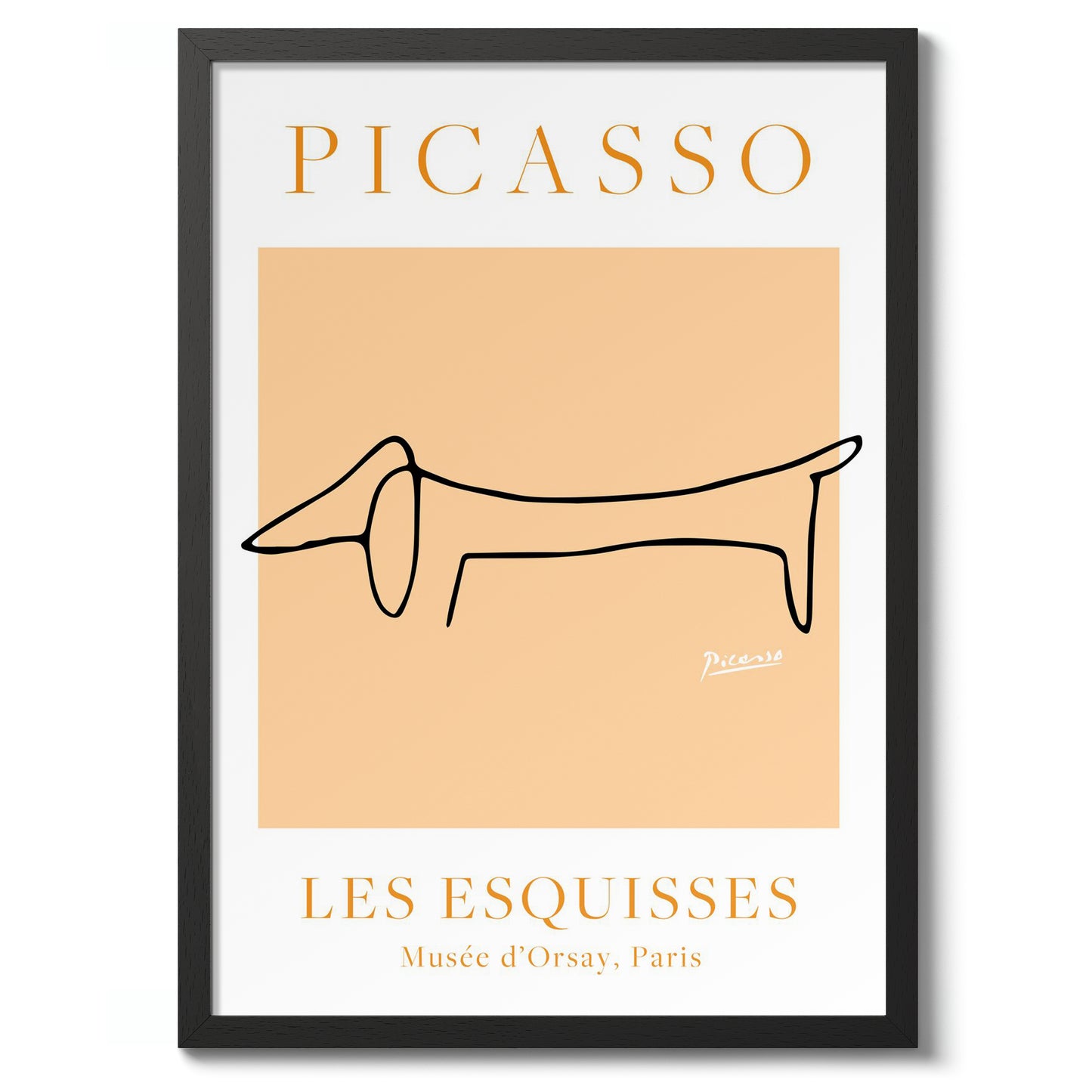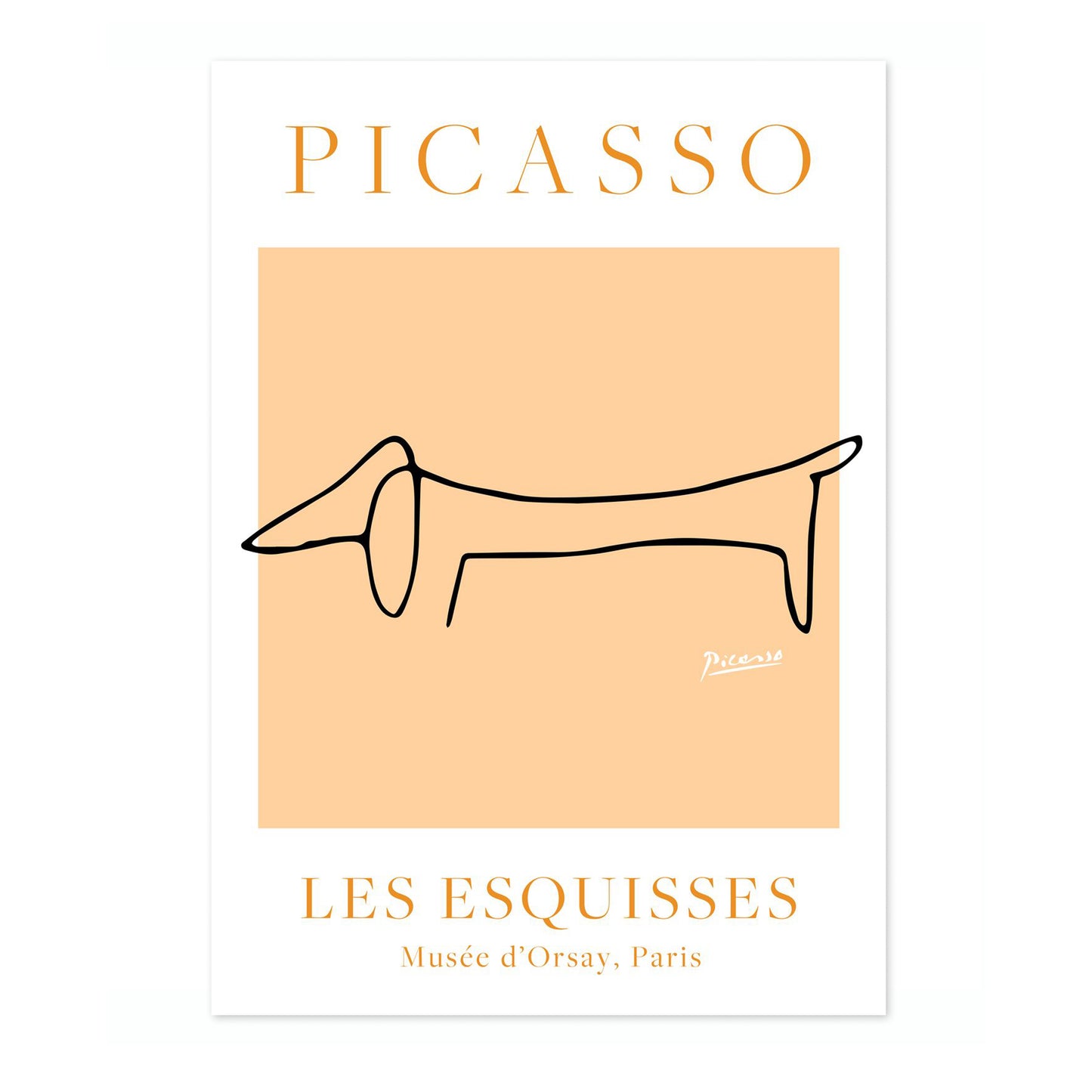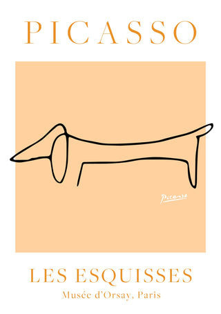 This minimalist poster showcases Picasso's iconic line art featuring a stylized dachshund. The simple, continuous black line on an orange background captures the dog's essence with elegant precision. Part of the "Les Esquisses" collection, this art poster highlights Picasso's mastery of form and simplicity. Ideal for those who appreciate modern, abstract interpretations and animal themes in art.