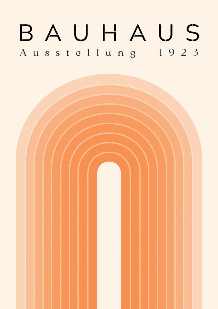 This "Orange Arches" poster showcases a striking geometric design characteristic of Bauhaus aesthetics. Featuring layered, ascending orange arches against a light background, it highlights mid-century modernism's clean lines and contemporary style. Ideal for adding a touch of abstract elegance to any space, this exhibition poster captures classic, graphic elements with a modern twist.