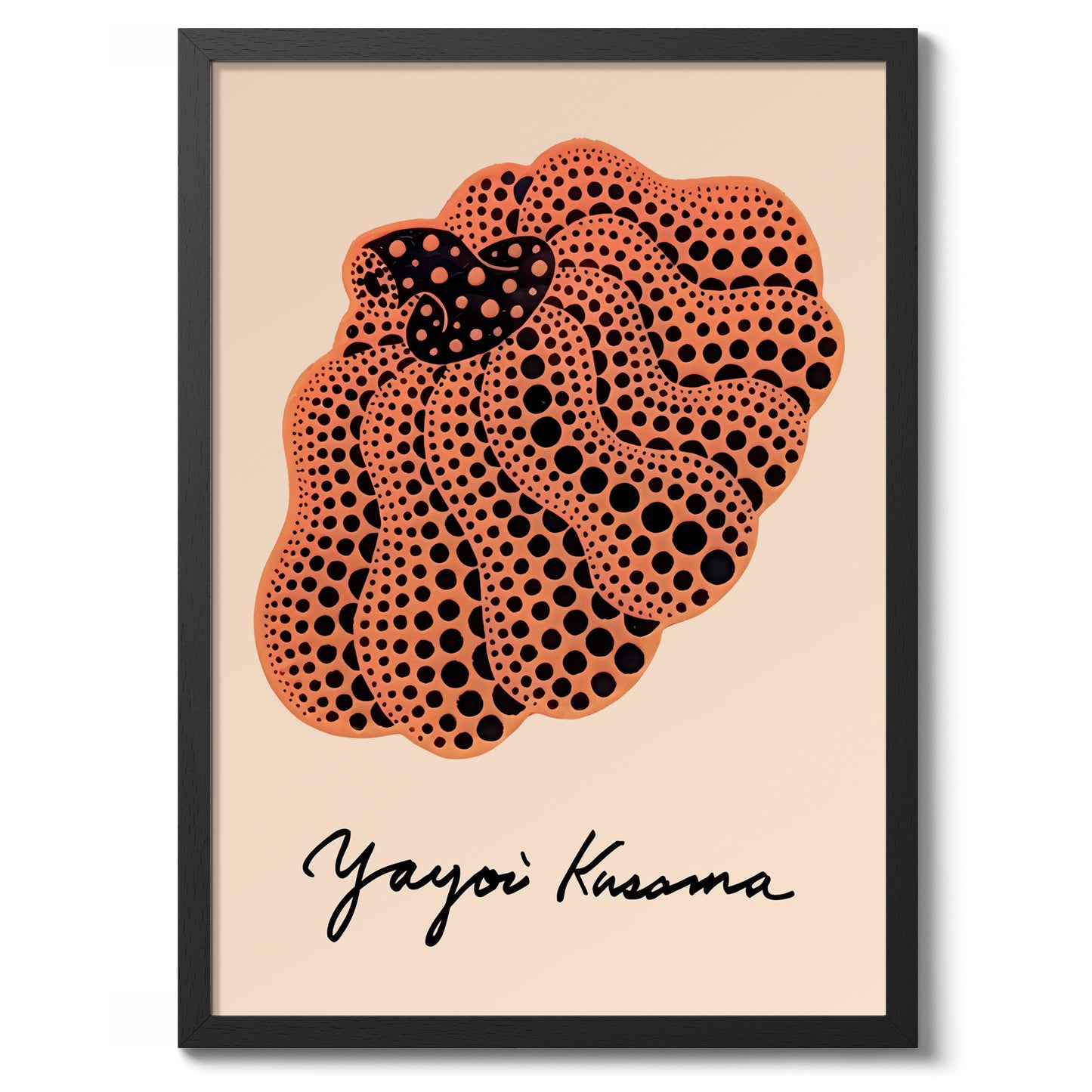 This "Orange Pumpkin Beige" poster by Yayoi Kusama features a striking depiction of an orange pumpkin adorned with black polka dots, set against a beige background. The minimalist, modernist design highlights bold contrasts and embodies Kusama's iconic style. This abstract art print evokes themes of Japan and modernism, making it a captivating addition to any contemporary space.