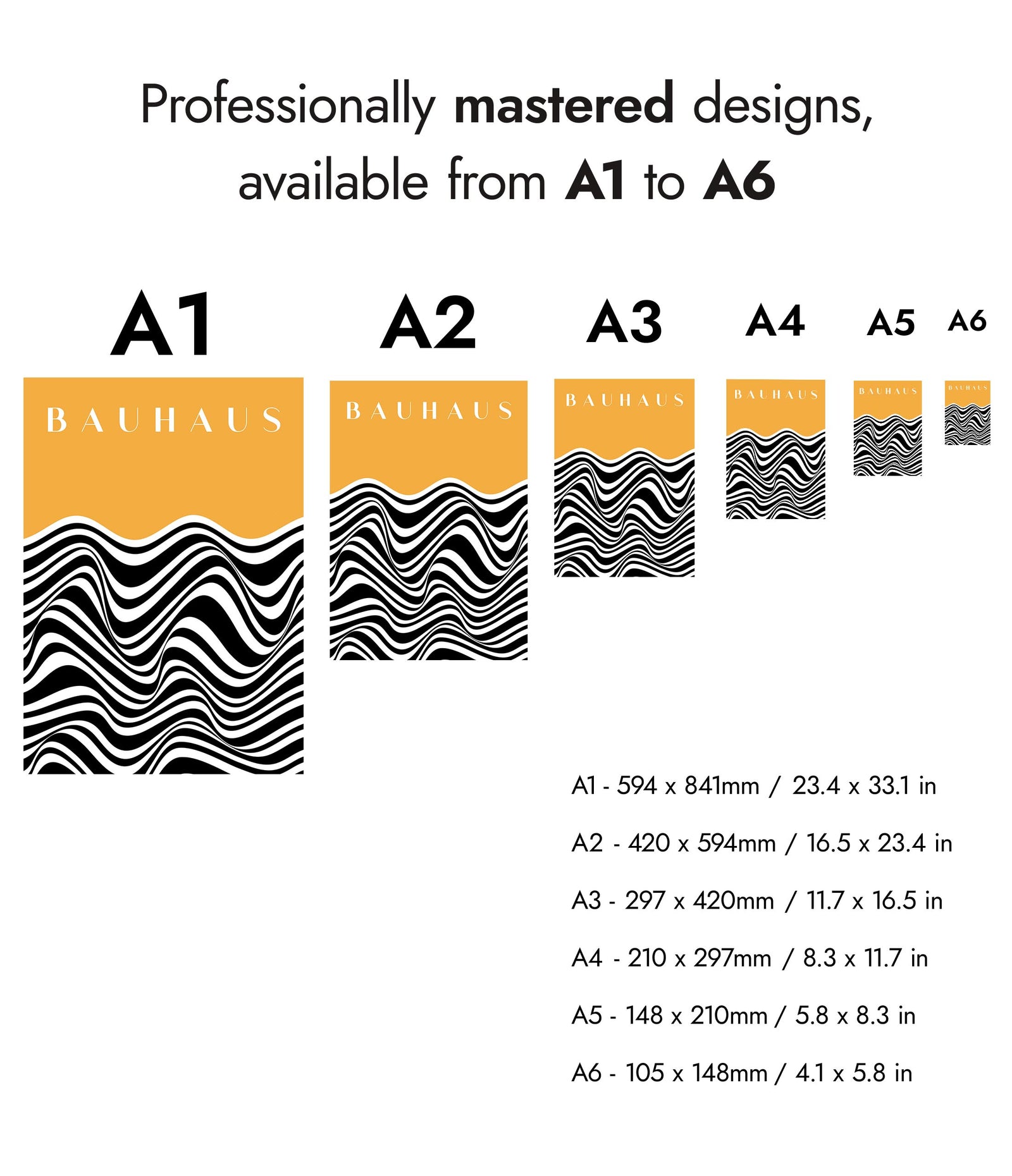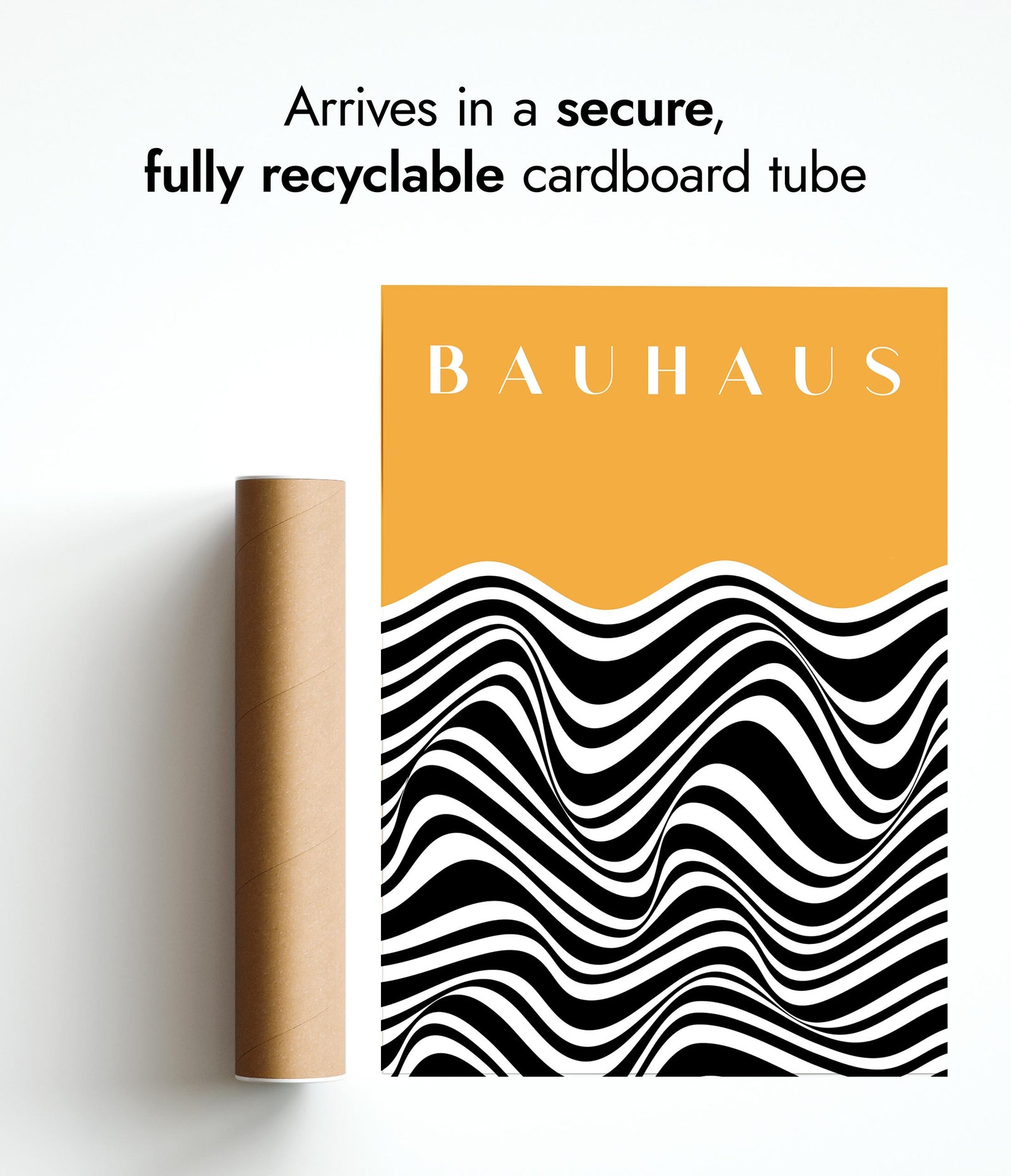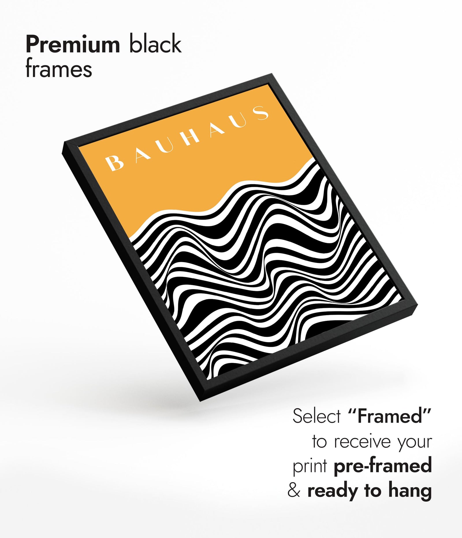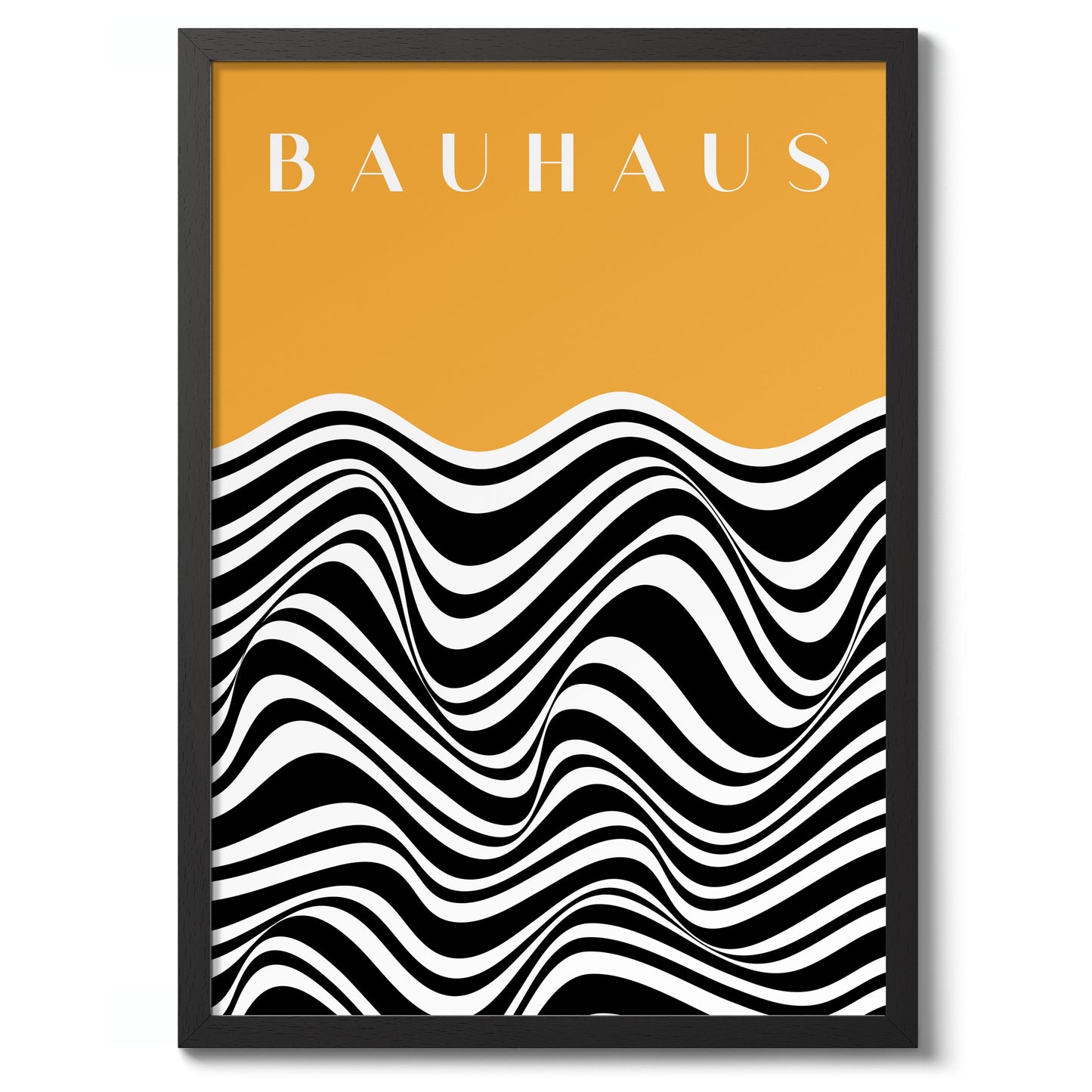 This Bauhaus poster, titled "Orange Swirls," features a striking abstract design combining the vivid contrast of a bold orange background with dynamic black and white wave patterns. Perfect for fans of mid-century graphic and abstract styles, this portrait print adds a modern, artistic touch to any space, highlighting its iconic shapes and swirl themes.