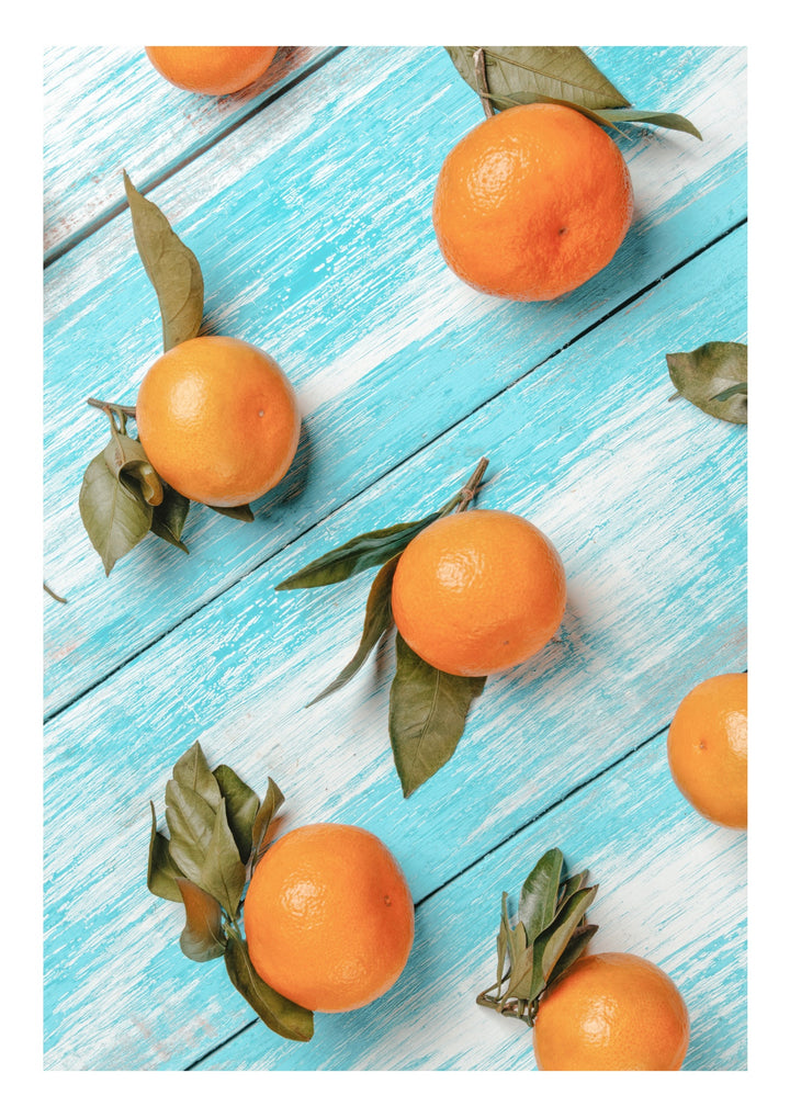 This vibrant photographic poster features fresh, juicy oranges artfully arranged on a rustic turquoise wooden background. The still life composition highlights the bright citrus fruits with their leafy stems, creating a refreshing and dynamic contrast. Perfect for adding a splash of colour and a touch of nature to any kitchen or dining space. Ideal for citrus and fruit-themed décor.