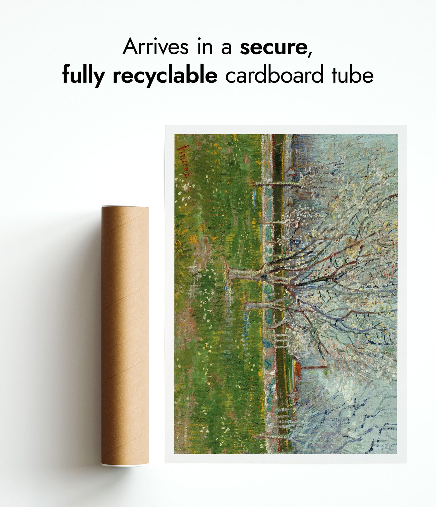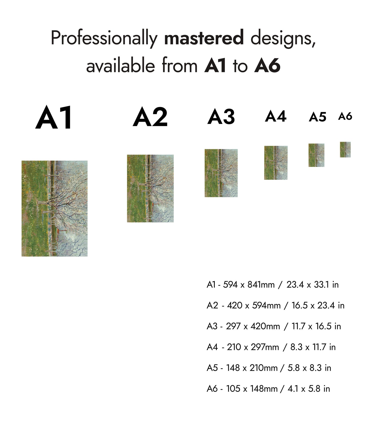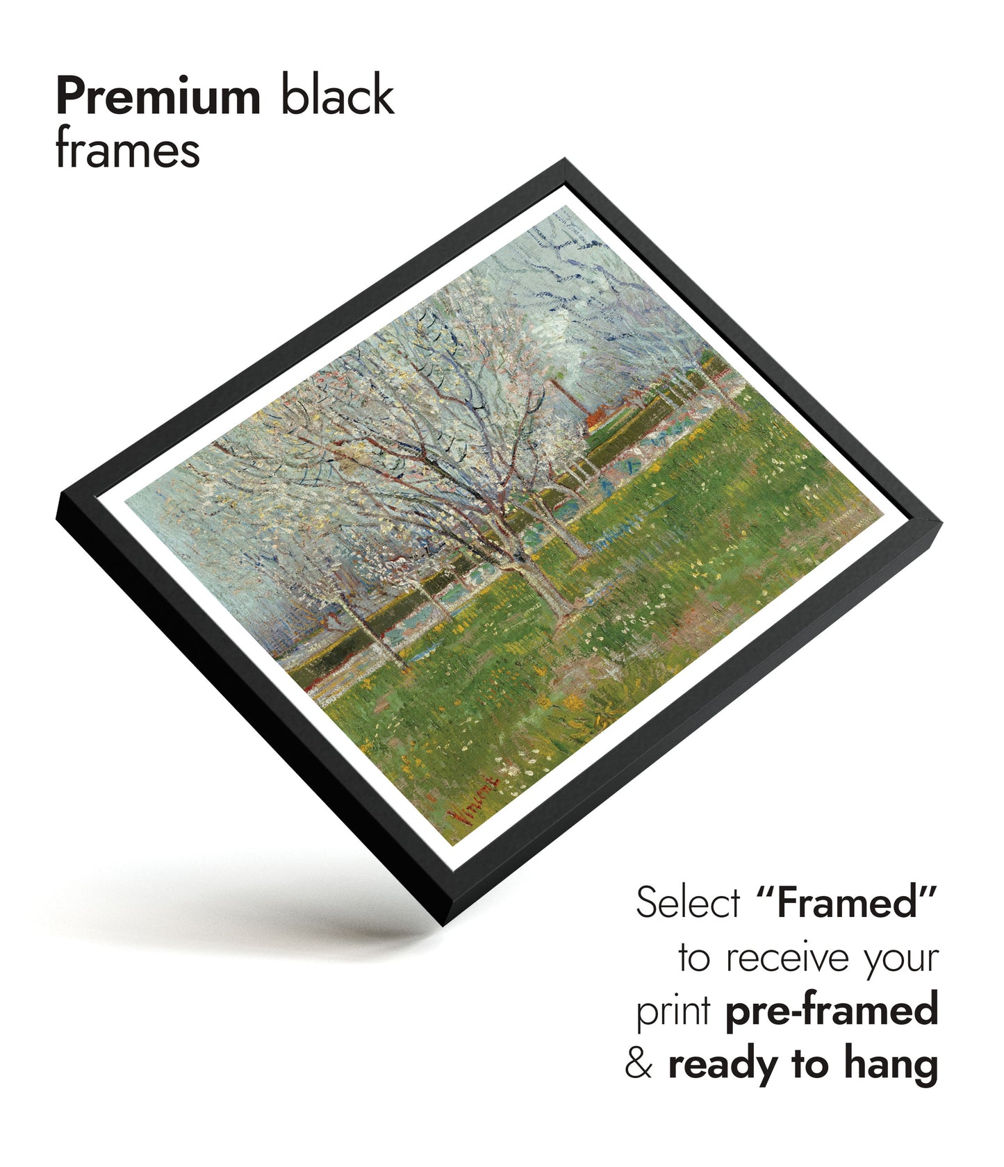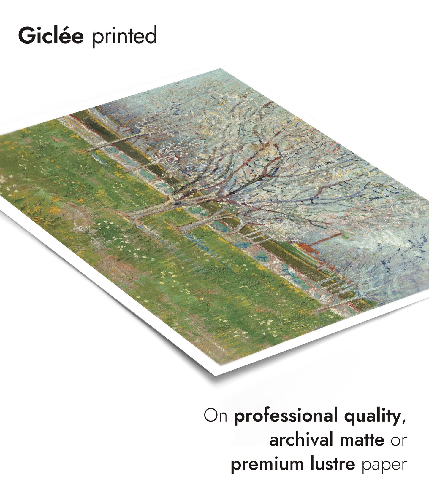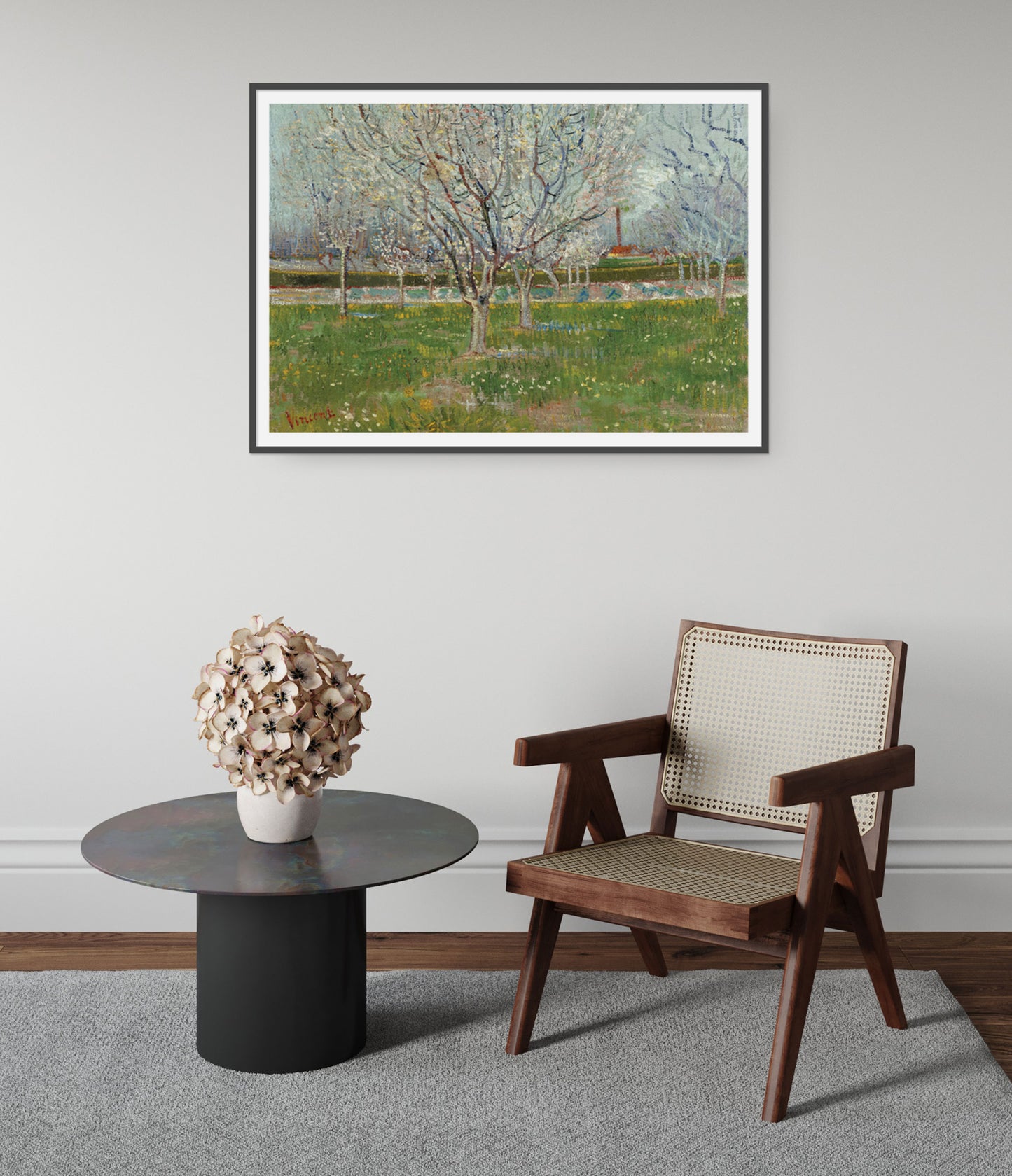 The "Orchard in Blossom" poster by Vincent Van Gogh vividly captures a serene spring scene with blossoming trees set against a backdrop of a peaceful landscape. This Post-Impressionist artwork features delicate blossoms and lush greenery, embodying Van Gogh's dynamic brushwork and vibrant colour palette, perfect for nature enthusiasts and art lovers seeking to bring a touch of spring indoors.