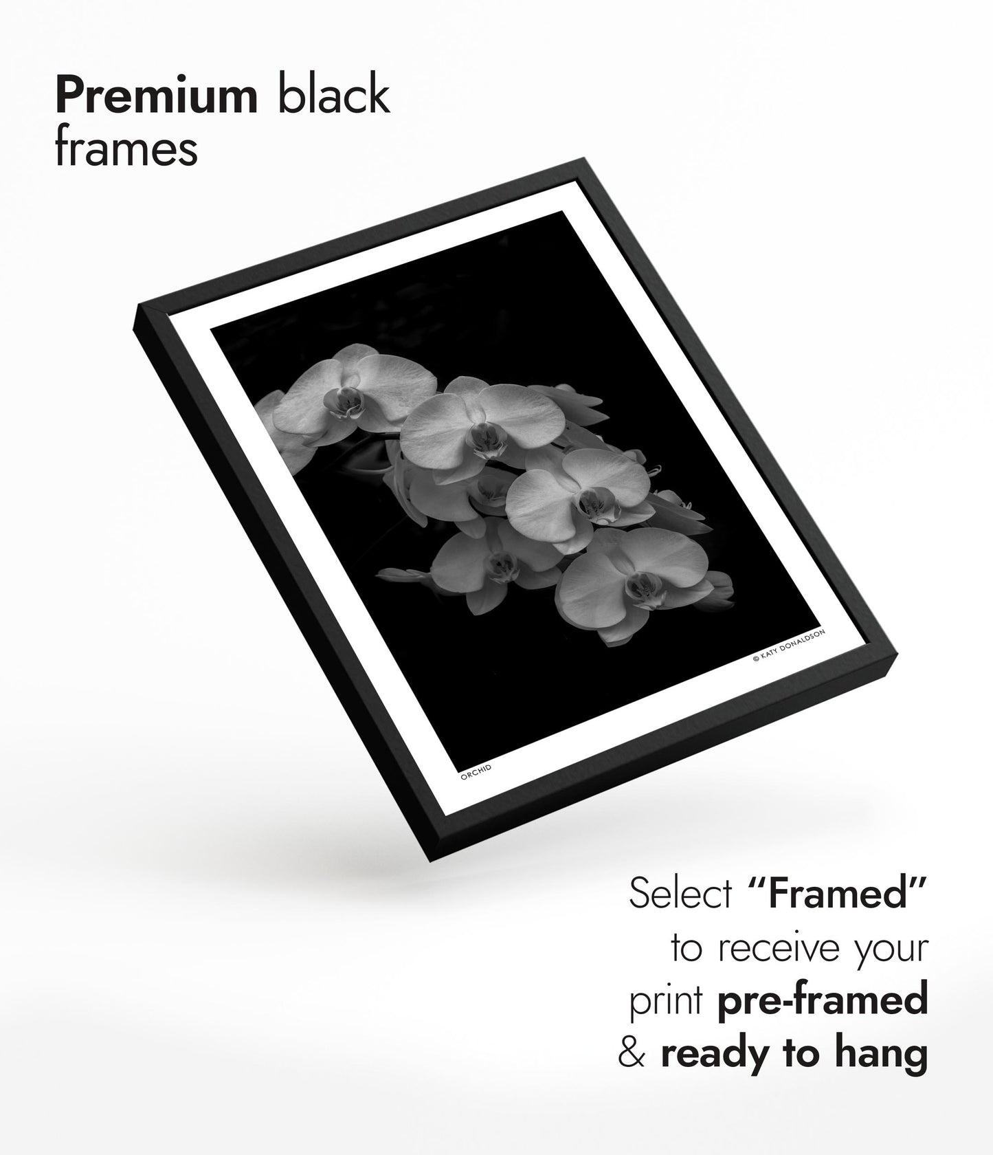 Solid wood frames available in black stained or natural finishes, with UV resistant acrylic glass. Framed orders arrive pre-installed with your choice of print, ready to hang. Available in all print sizes.