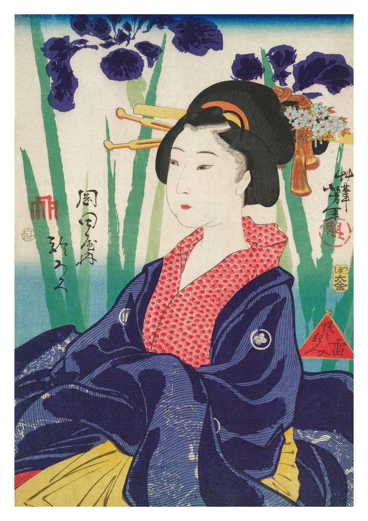This "Oroku" poster by Tsukioka Yoshitoshi captures a traditional Japanese woodblock portrait of a serene woman in a blue kimono. Illustrative details like the vibrant iris flowers and her ornate hairpiece highlight the Ukiyo-E style. This art print makes a striking addition to any collection, embodying the grace and beauty of historical Japanese courtesans.