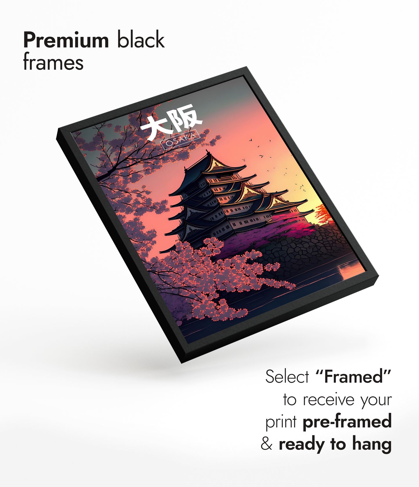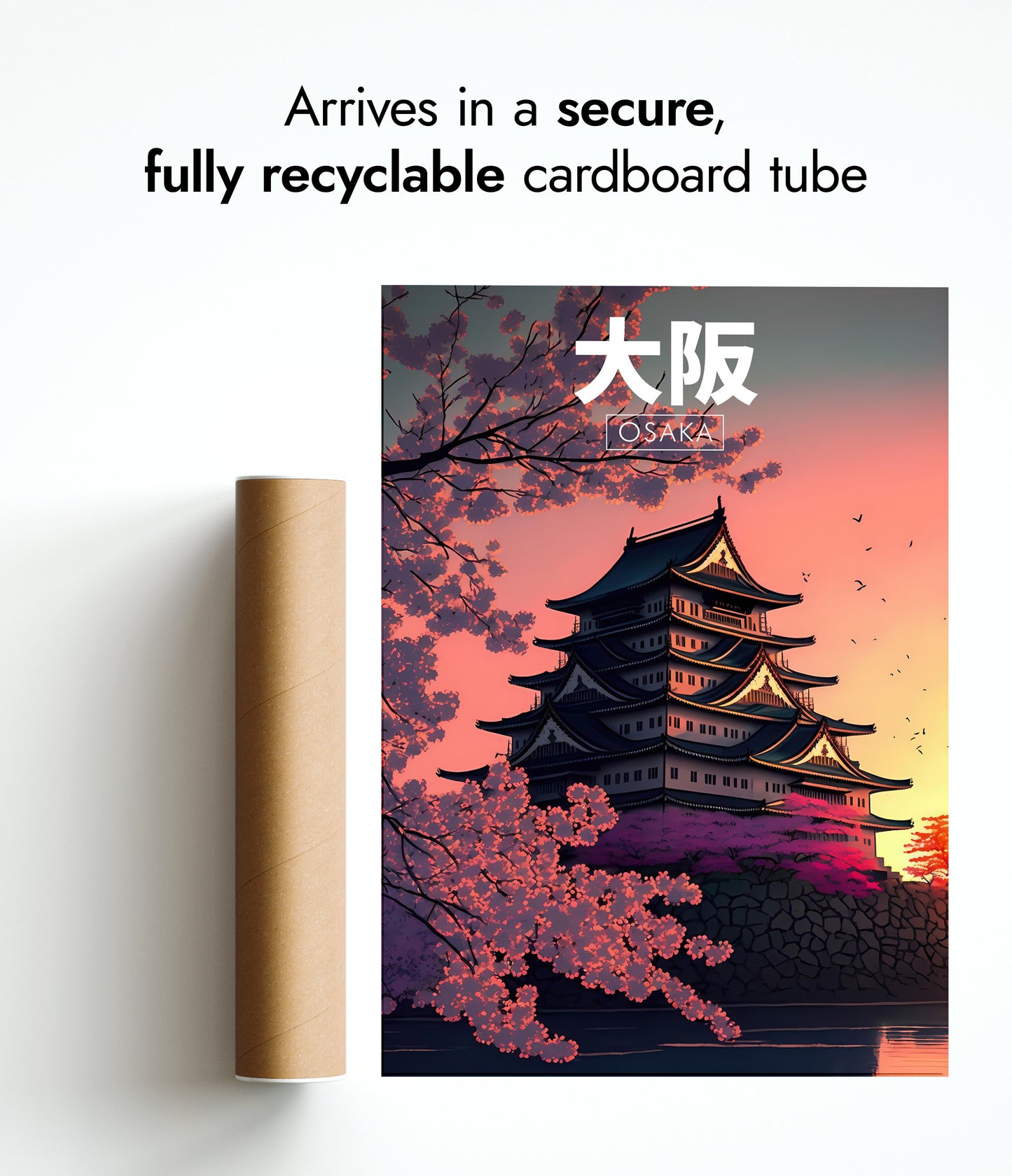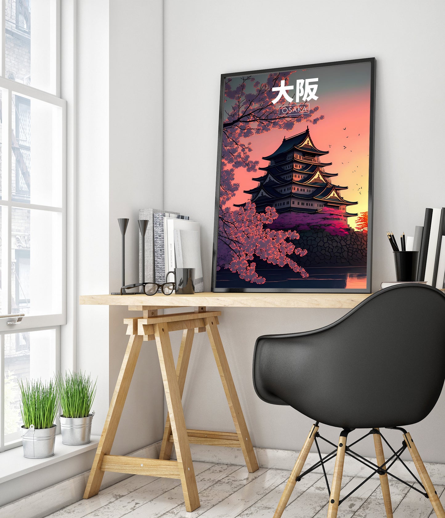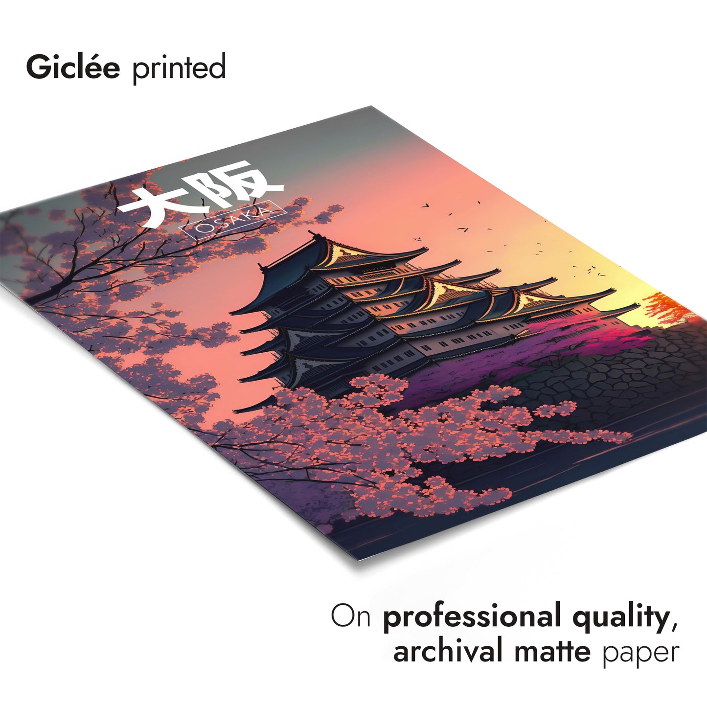 This vibrant anime-style poster features a serene evening scene in Osaka, showcasing a traditional Japanese pagoda surrounded by blooming cherry blossoms. The sky transitions from pink to purple hues, capturing the tranquil atmosphere. The detailed illustration combines modern aesthetics with cultural elements, making it a captivating piece for any space celebrating Japanese architecture and natural beauty.