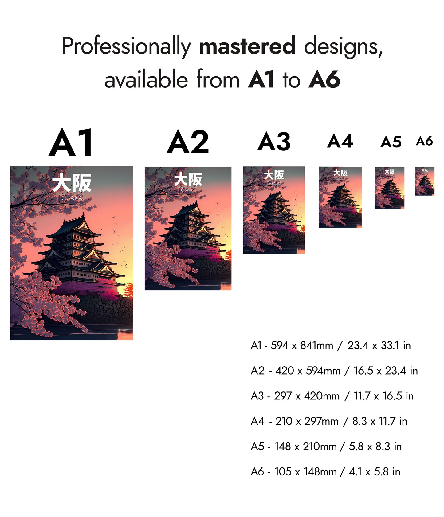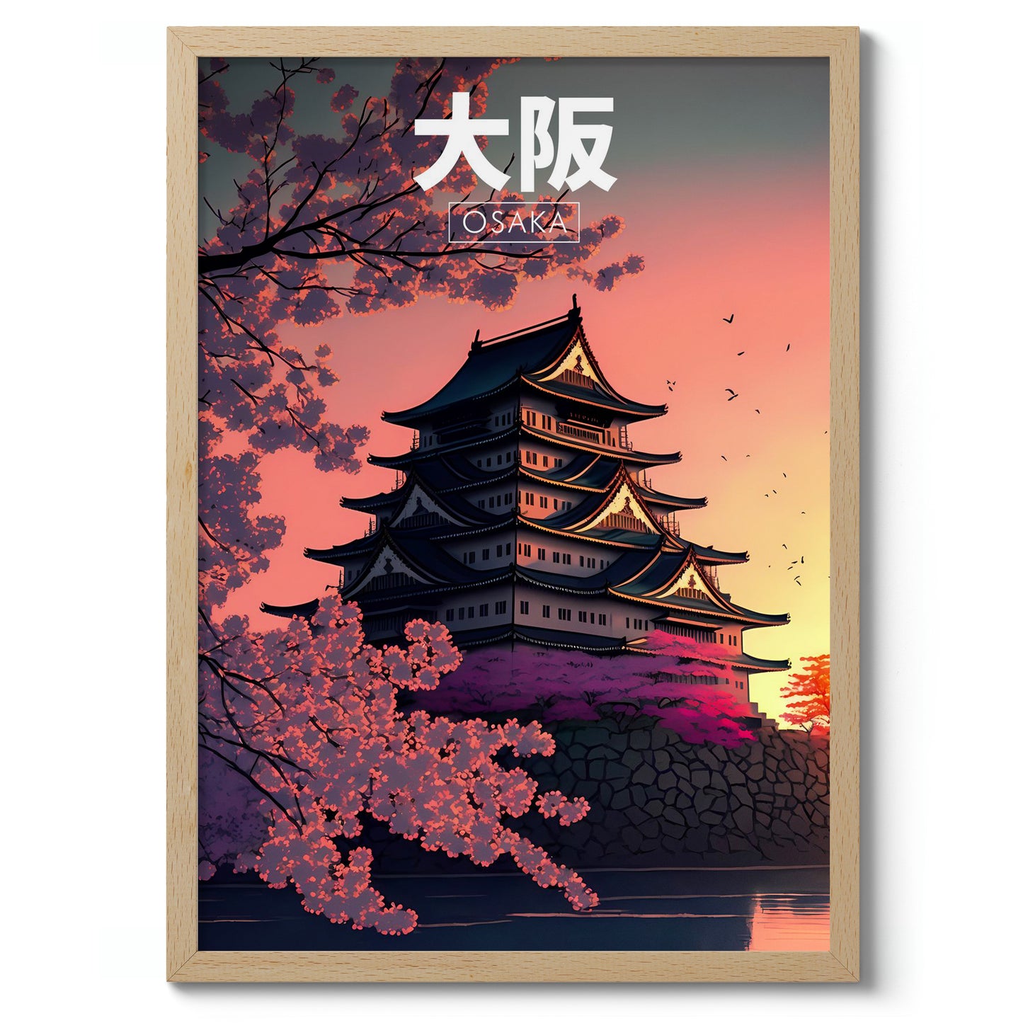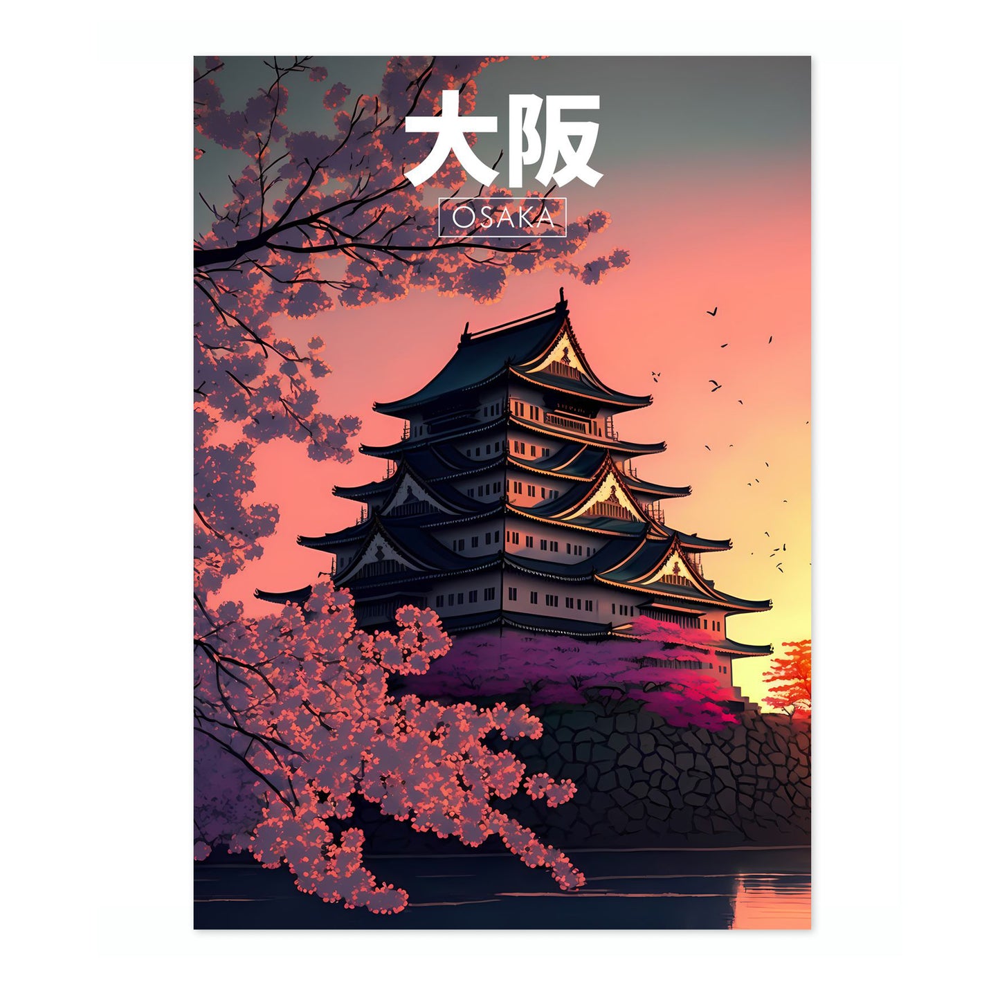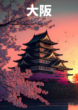 This modern illustration poster captures an Osaka pagoda at sunset, framed by vibrant cherry blossoms. The iconic style highlights the structure's intricate architecture, silhouetted against a colorful sky. Birds in flight add a sense of serene motion. Perfect for those drawn to Japanese culture and evening landscapes, this artwork is both elegant and tranquil, ideal for home or office decor.