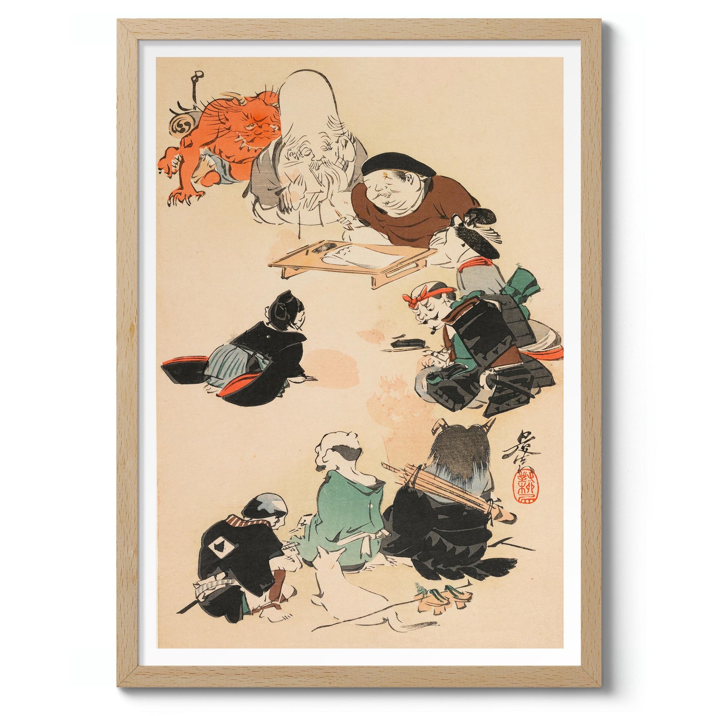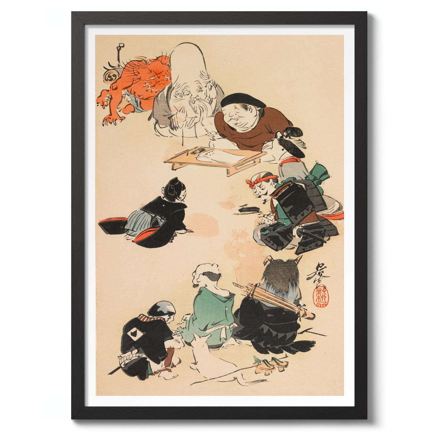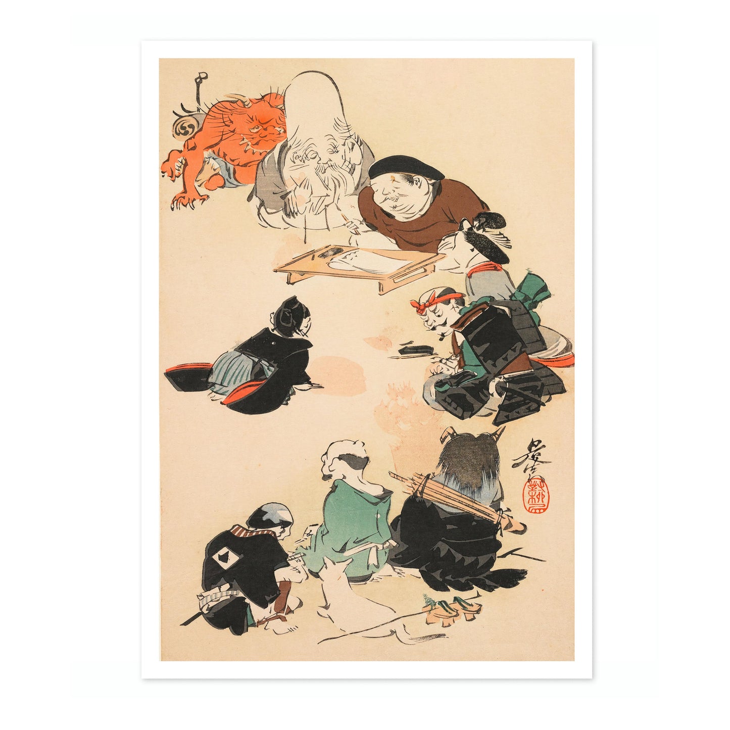 The "Otsu-e Style" poster by Shibata Zeshin captures a captivating traditional Japanese woodblock scene. The artwork depicts a group of samurais and mythical figures gathering around a seated elder. The intricate details and dynamic composition bring this Ukiyo-E illustration to life, showcasing themes of gods, warriors, and mythical tales. This exquisite piece illustrates the rich heritage of Japanese artistry.