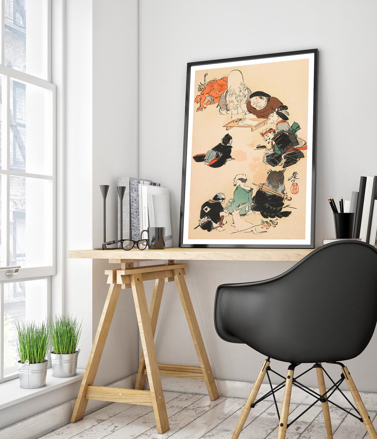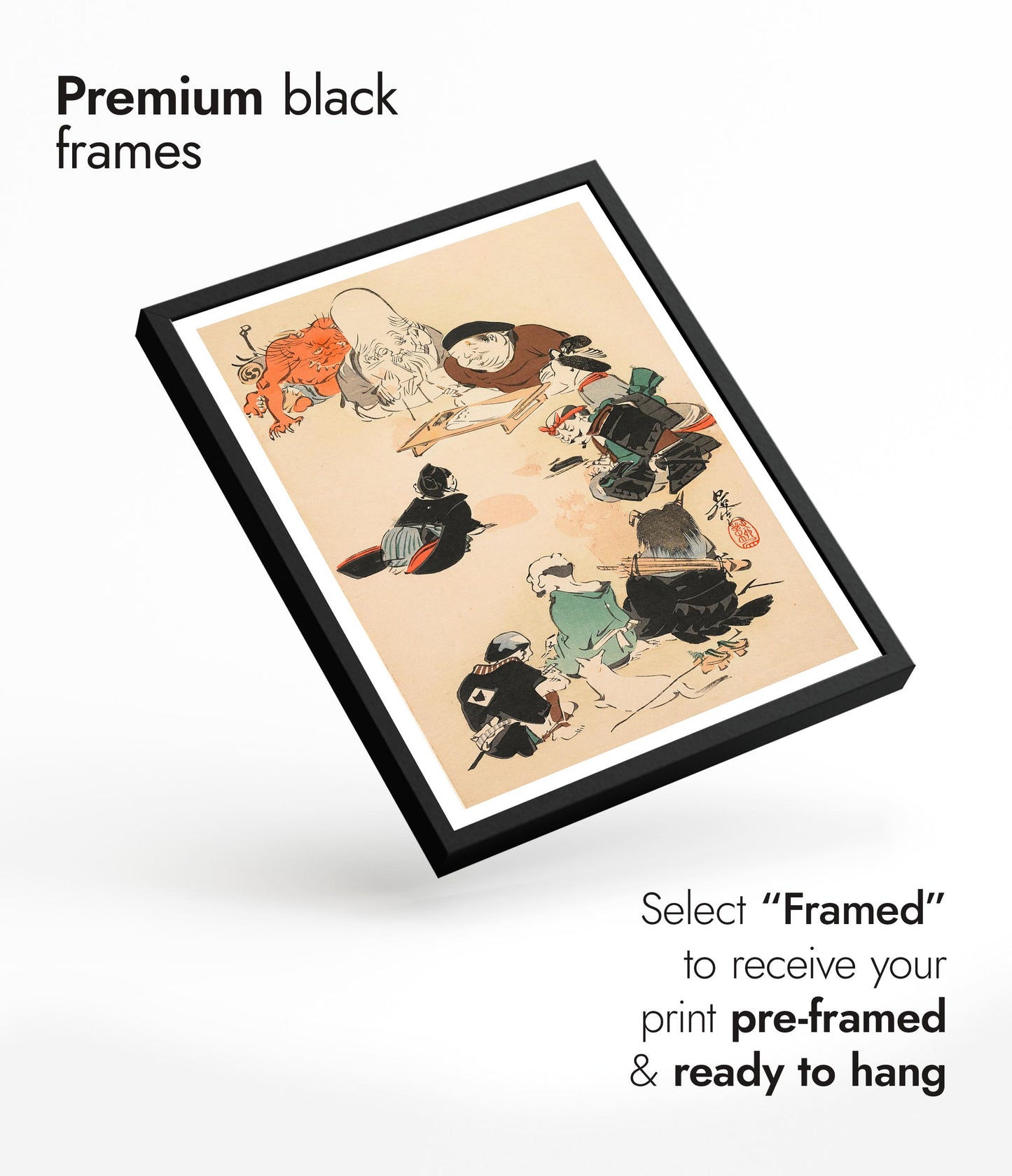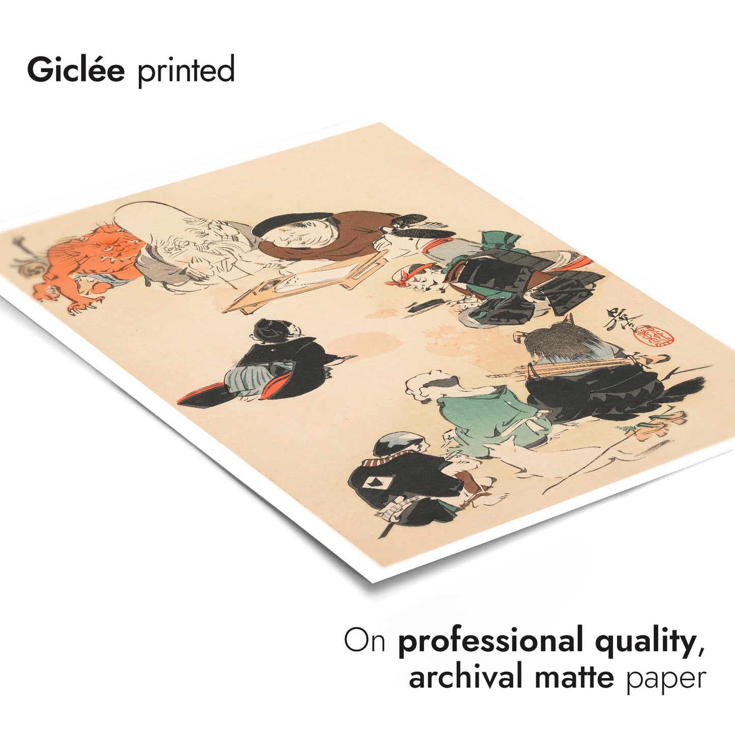 The "Otsu-e Style" poster by Shibata Zeshin captures a captivating traditional Japanese woodblock scene. The artwork depicts a group of samurais and mythical figures gathering around a seated elder. The intricate details and dynamic composition bring this Ukiyo-E illustration to life, showcasing themes of gods, warriors, and mythical tales. This exquisite piece illustrates the rich heritage of Japanese artistry.