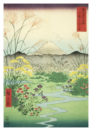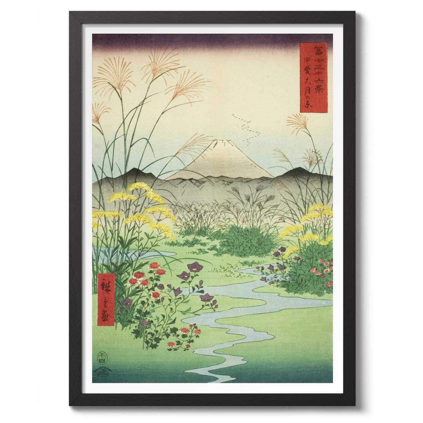 The "Otsuki Plain in Kai Province" poster by Utagawa Hiroshige beautifully depicts a tranquil meadow scene, showcasing delicate wildflowers and soft grasses leading towards the imposing silhouette of Mount Fuji in the background. This traditional Japanese woodblock art uses calming greens, yellows, and beiges to capture the serene essence of nature, making it an ideal choice for a peaceful home decor.