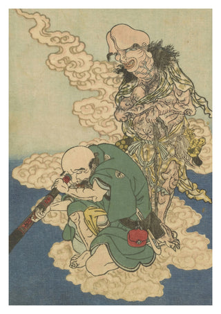 Experience the intricate artistry of Keisai Eisen with this traditional woodblock print, "Page from an Illustrated Book." This Japanese Ukiyo-E poster vividly depicts mythical figures enveloped in swirling clouds. The detailed illustration highlights the rich cultural heritage and fantasy themes, making it a timeless piece for enthusiasts of traditional Japanese art and mythical narratives.