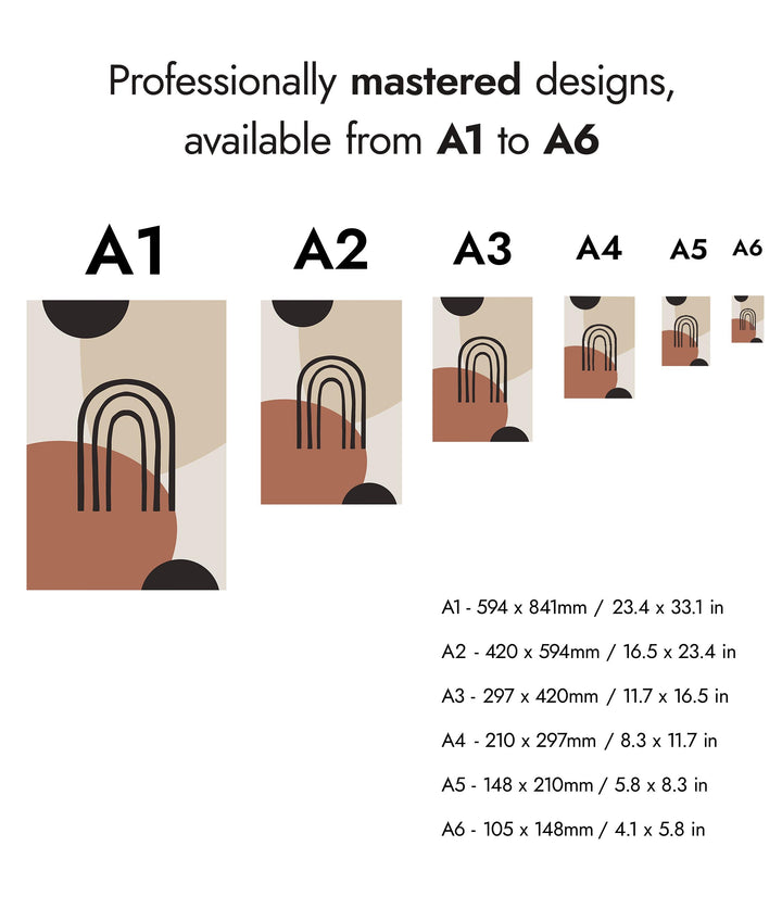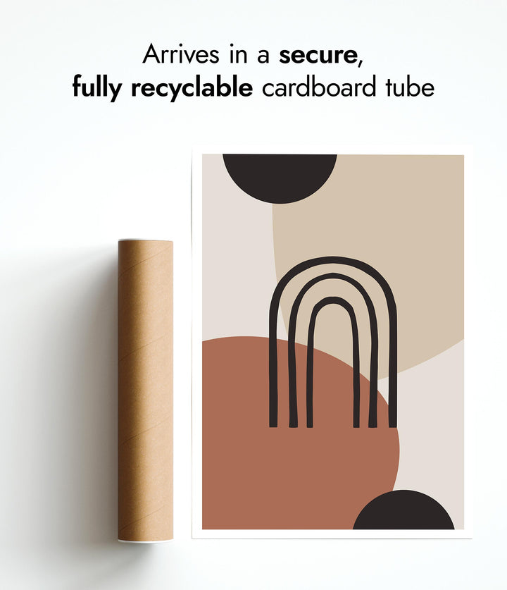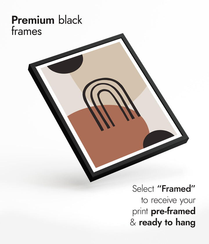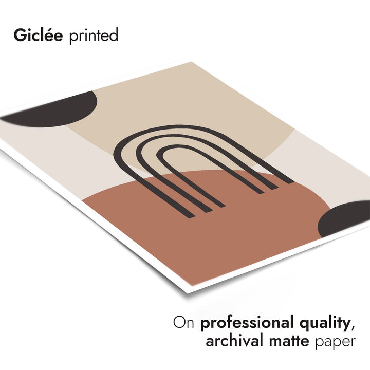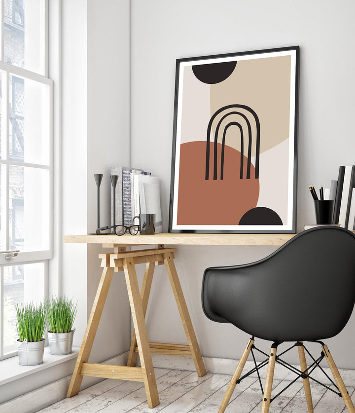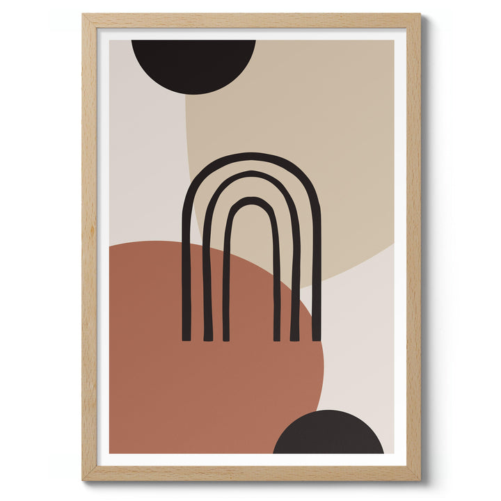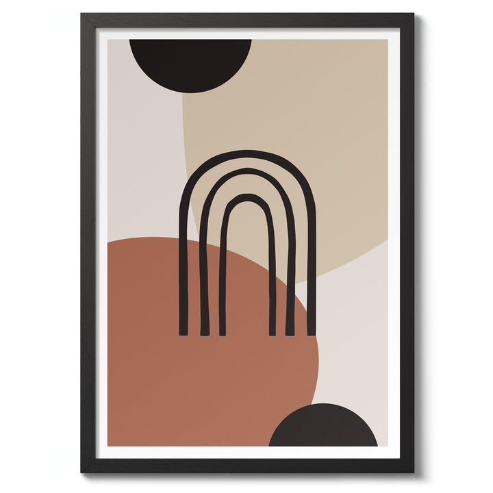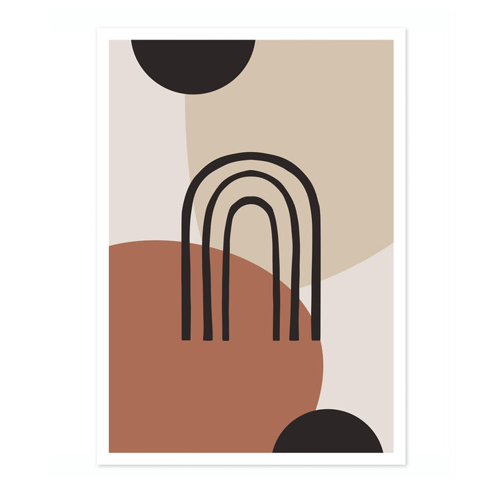 “Painted Arch” poster features a minimalist abstract design with overlapping geometric shapes in earthy tones. Central to the composition is a simple black arch set against a backdrop of circles and soft beige, brown, and black hues. Ideal for modern, boho-inspired interiors, this graphic piece brings a touch of contemporary artistry to any space.