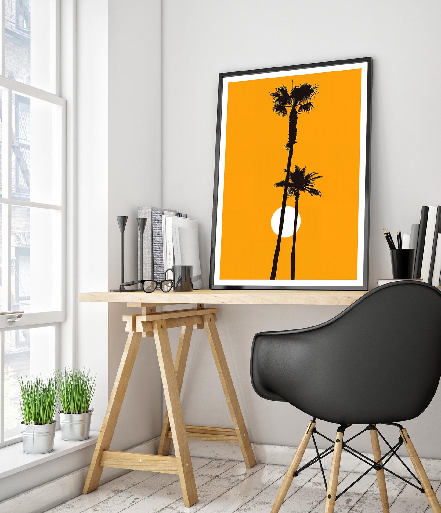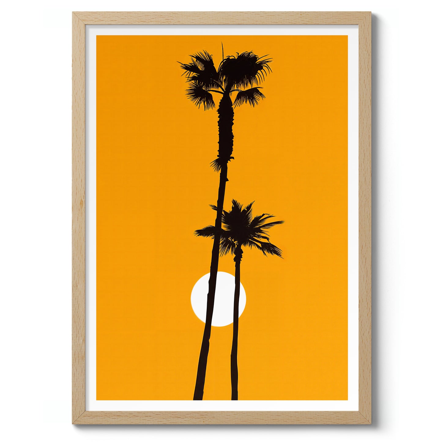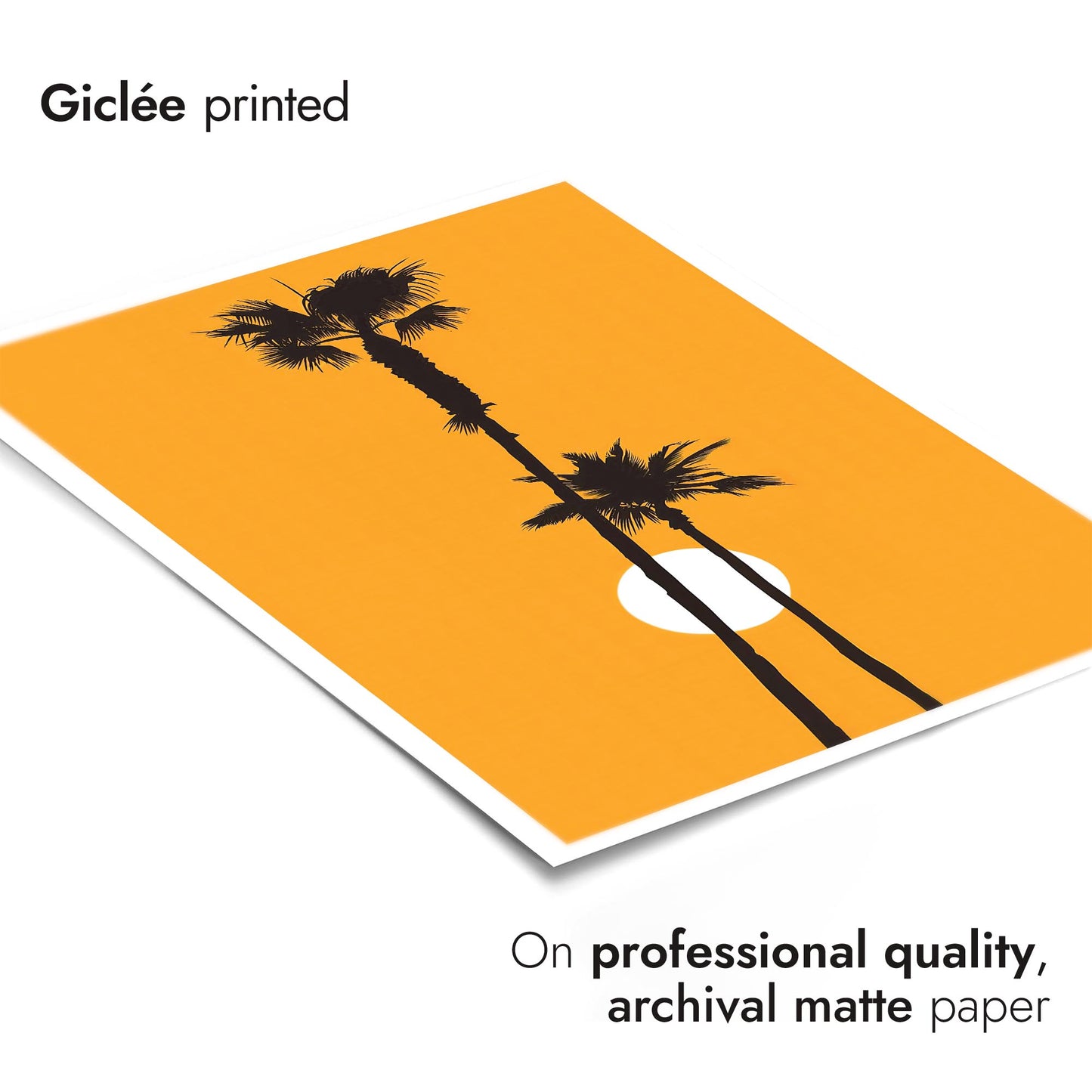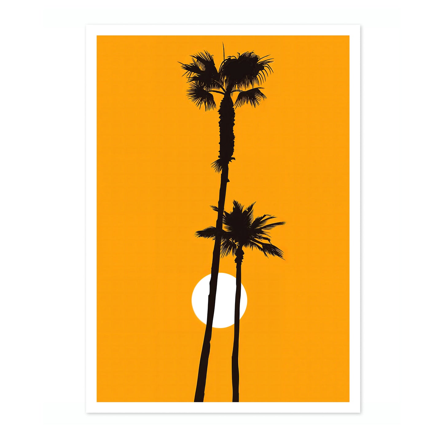 This "Palm Tree Sunset" poster captures the silhouettes of towering palm trees against a vibrant orange sunset backdrop. The minimalist design, with its striking contrast and graphic style, brings a modern touch to any space. Ideal for adding a hint of tropical warmth and relaxation to your decor, this photographic print emphasizes the serene beauty of sunset scenery.