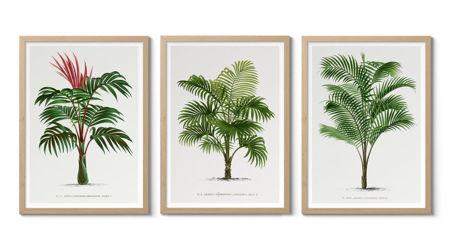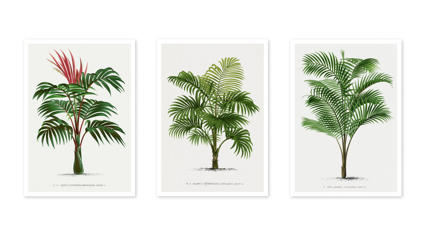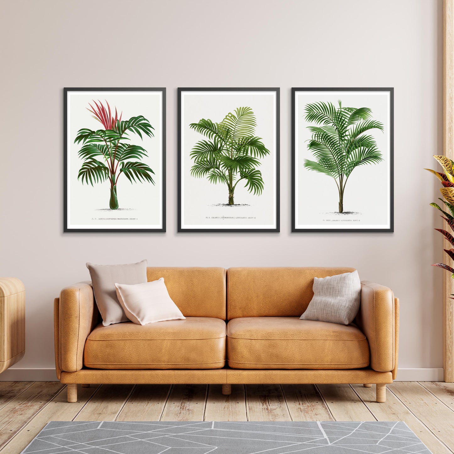 The "Palm Trees II" print poster set beautifully captures vintage botanical illustrations of three palm trees. Each poster showcases detailed foliage in lush shades of green, embodying nature's elegance and diversity. Perfect for nature enthusiasts, these art prints bring a touch of the tropics indoors, making them an ideal centerpiece for botanical or vintage-themed decor spaces.