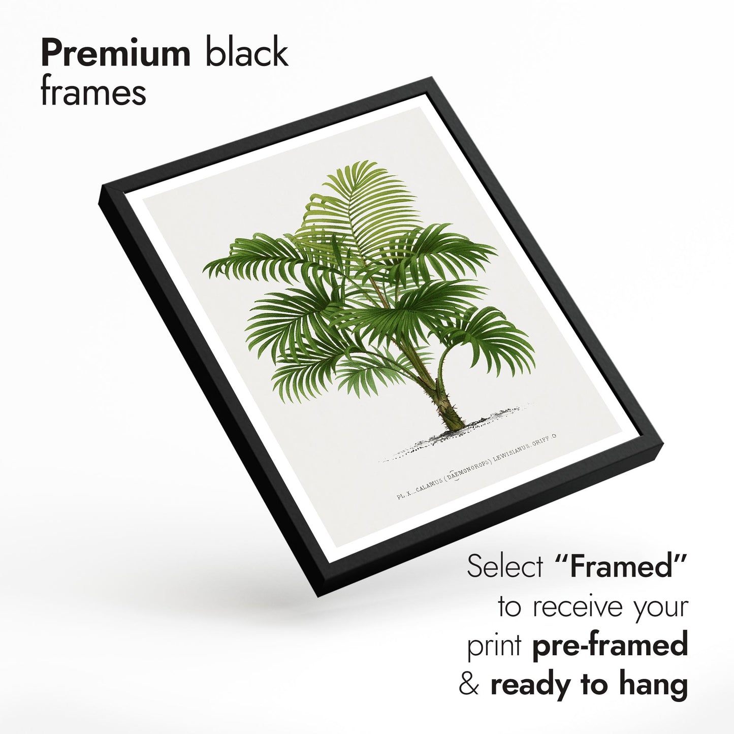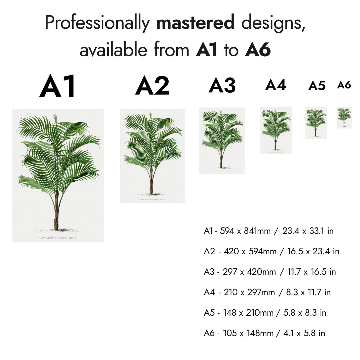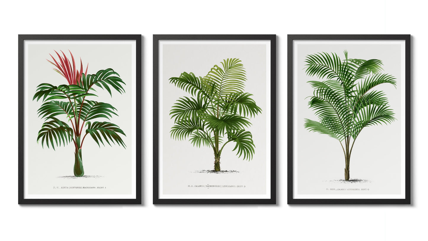 The "Palm Trees II" print poster set beautifully captures vintage botanical illustrations of three palm trees. Each poster showcases detailed foliage in lush shades of green, embodying nature's elegance and diversity. Perfect for nature enthusiasts, these art prints bring a touch of the tropics indoors, making them an ideal centerpiece for botanical or vintage-themed decor spaces.
