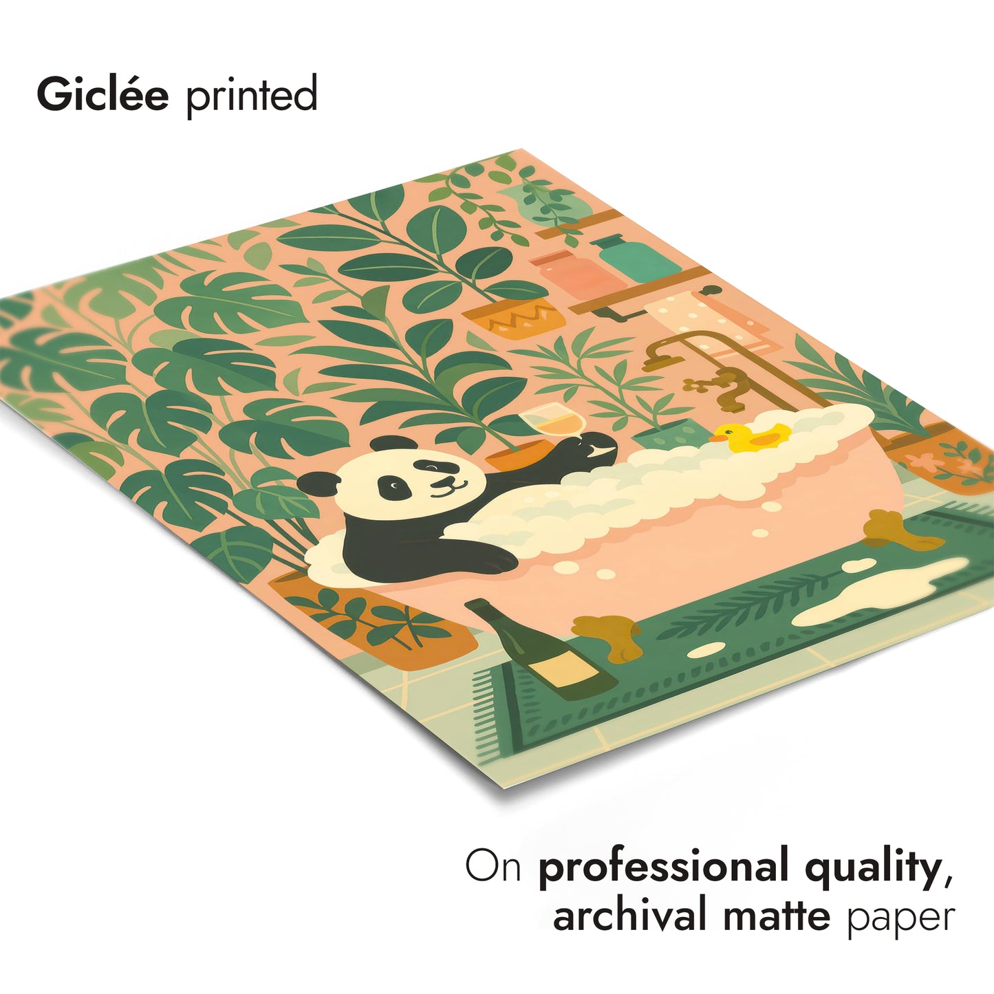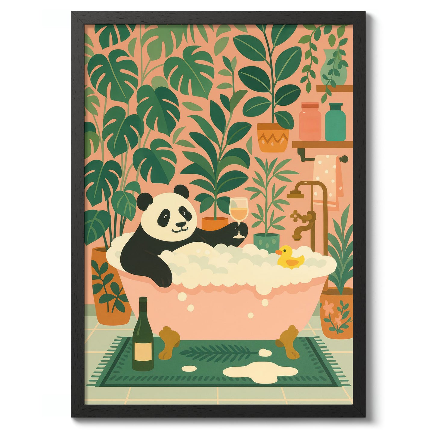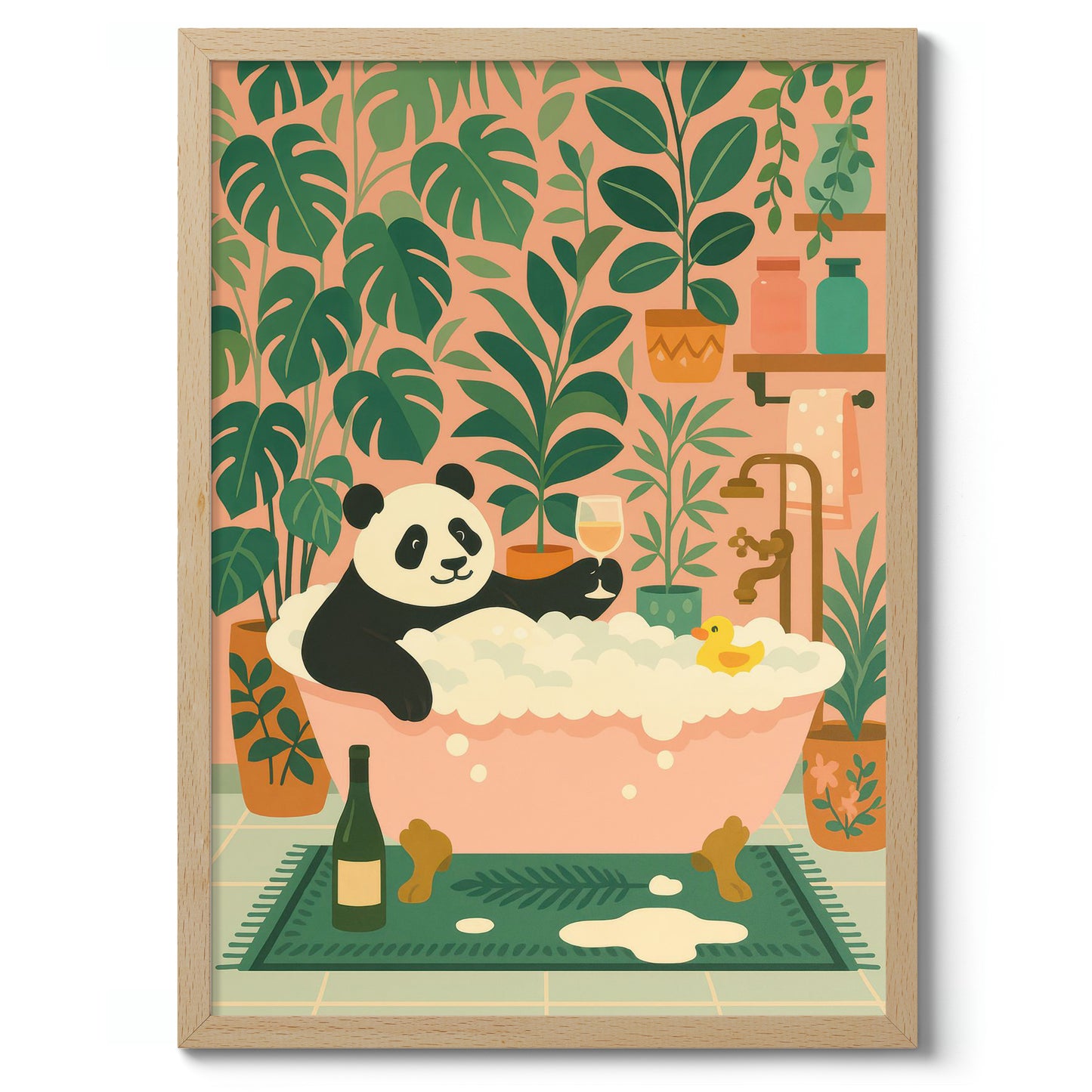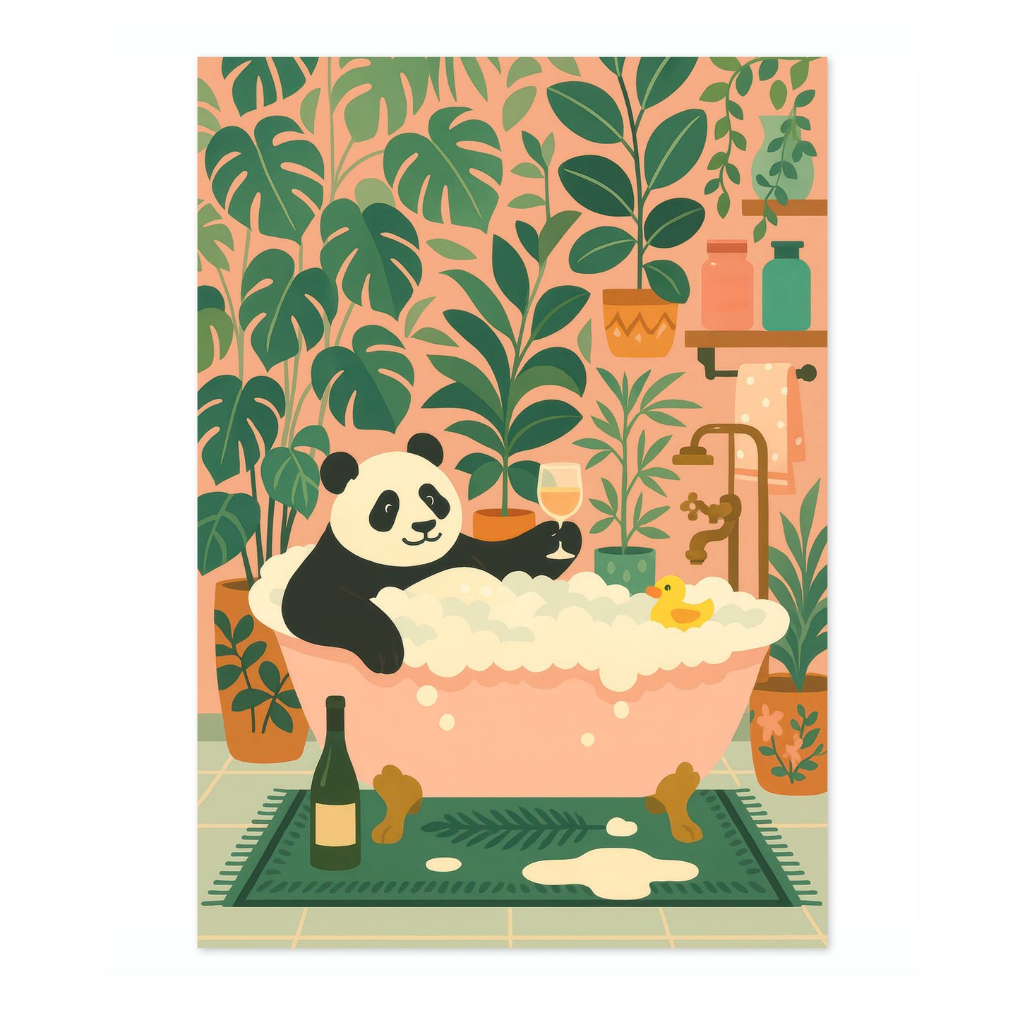 This charming "Panda Bath" poster captures a relaxed panda luxuriating in a bubble bath surrounded by lush, green plants. The whimsical illustration features a panda holding a wineglass, accompanied by a rubber duck, set against a pastel background that brings a playful, serene vibe to any space. Perfect for adding a lighthearted touch to bathroom decor.