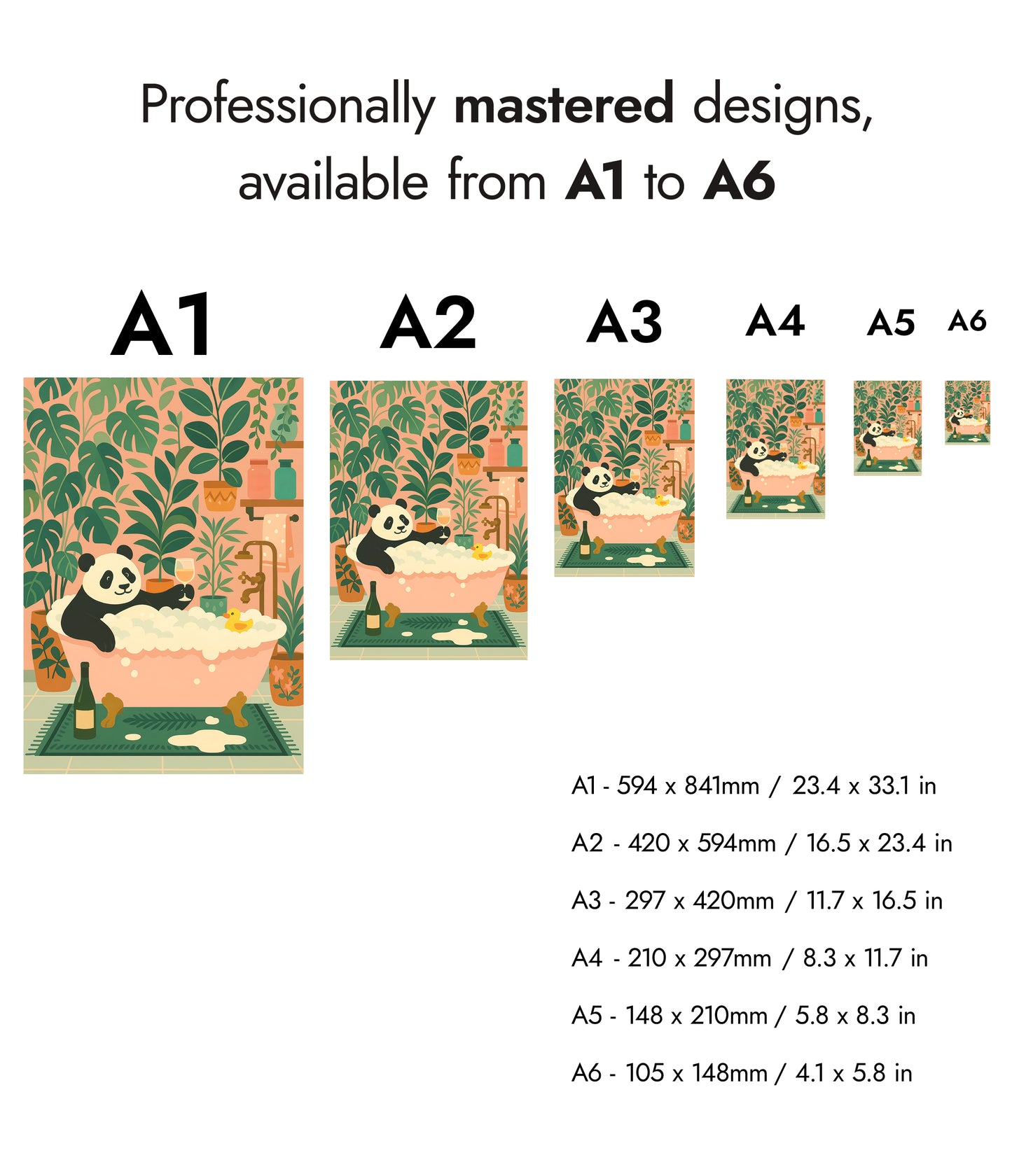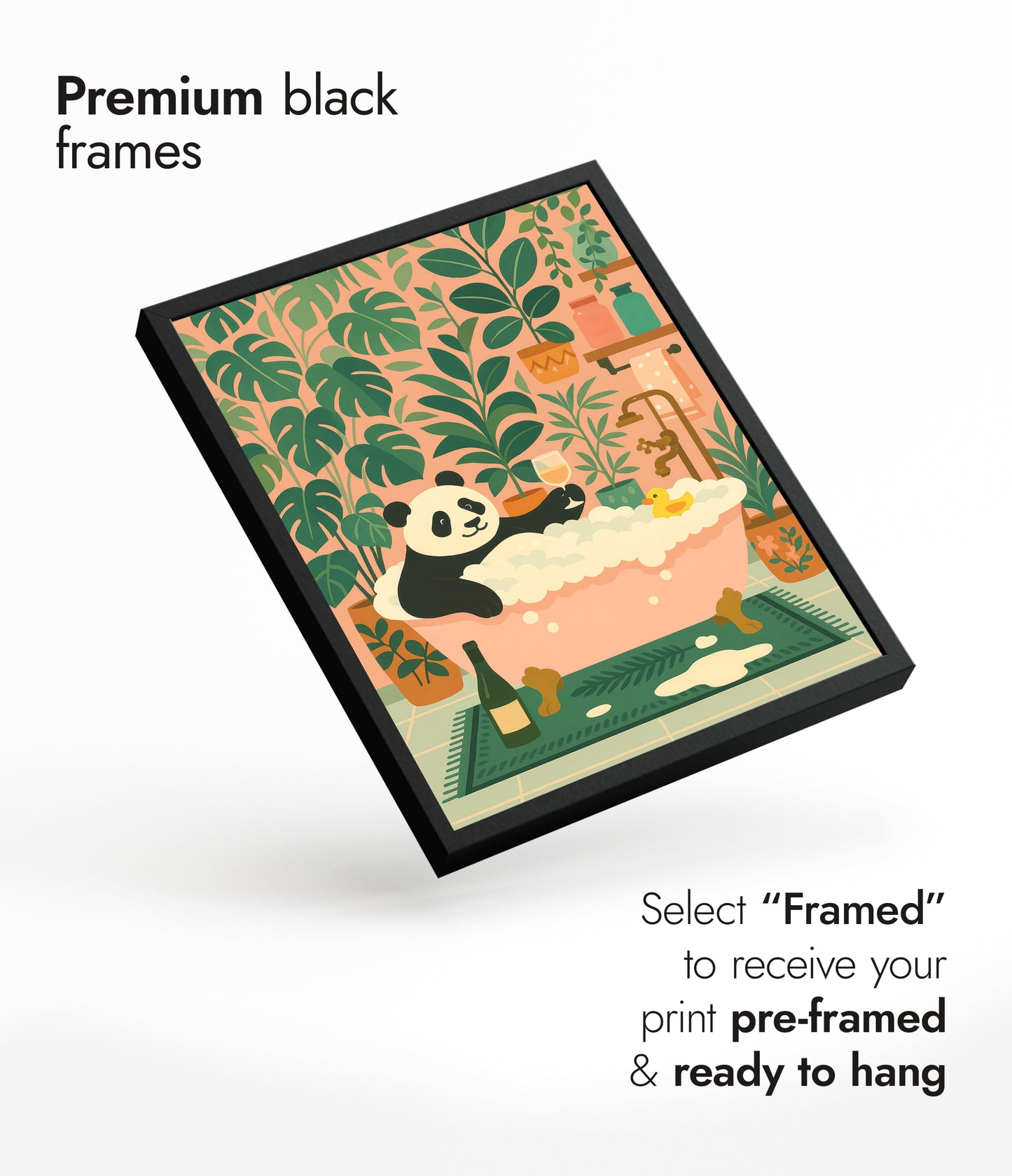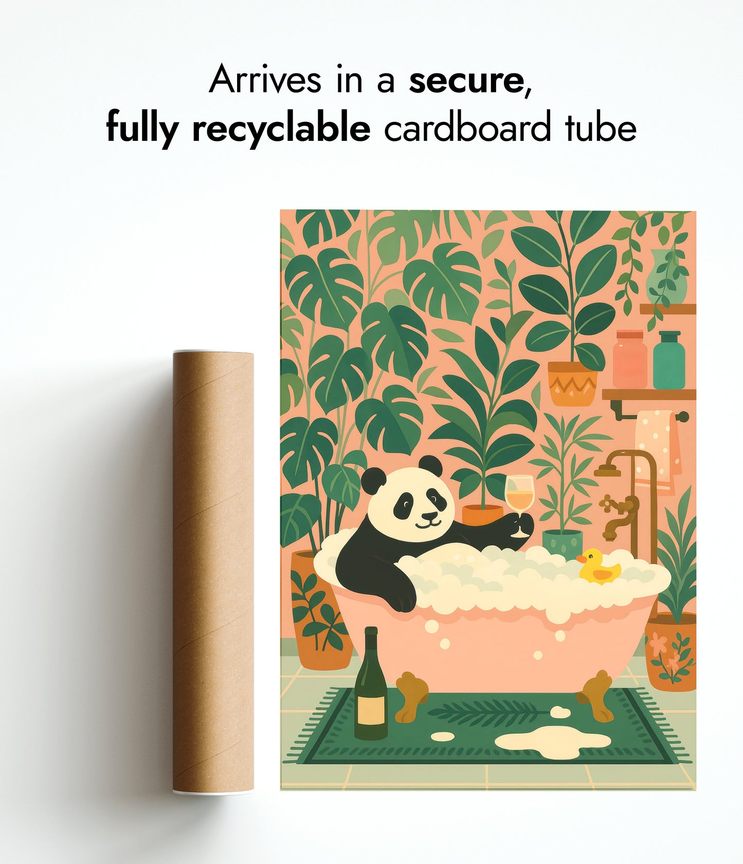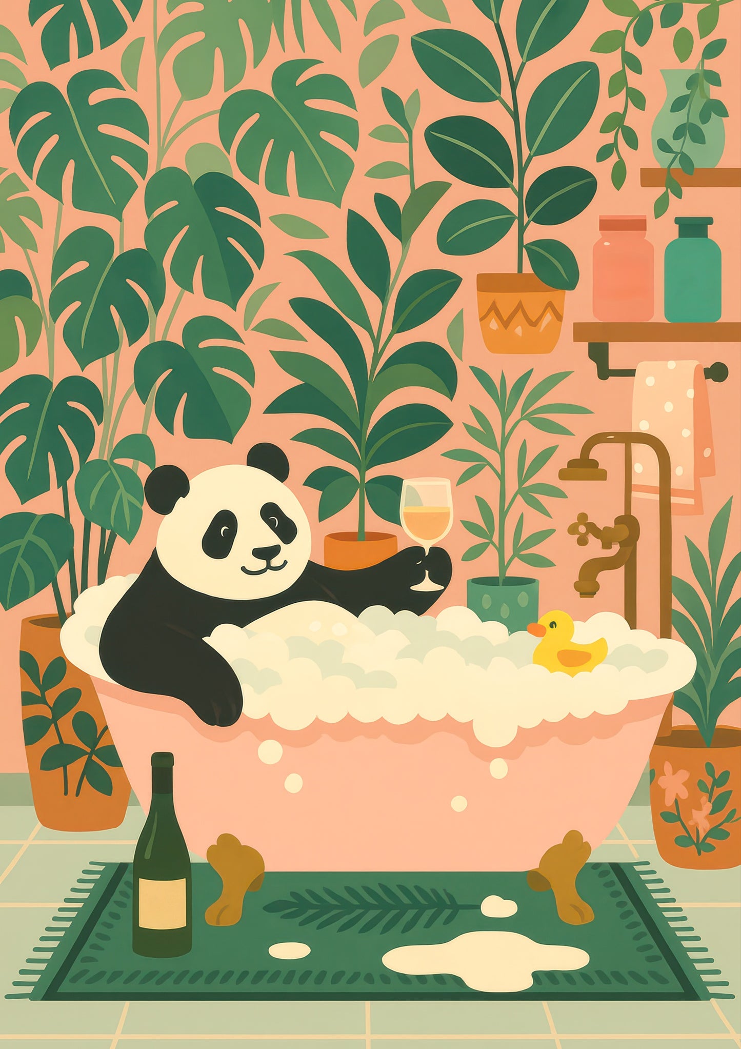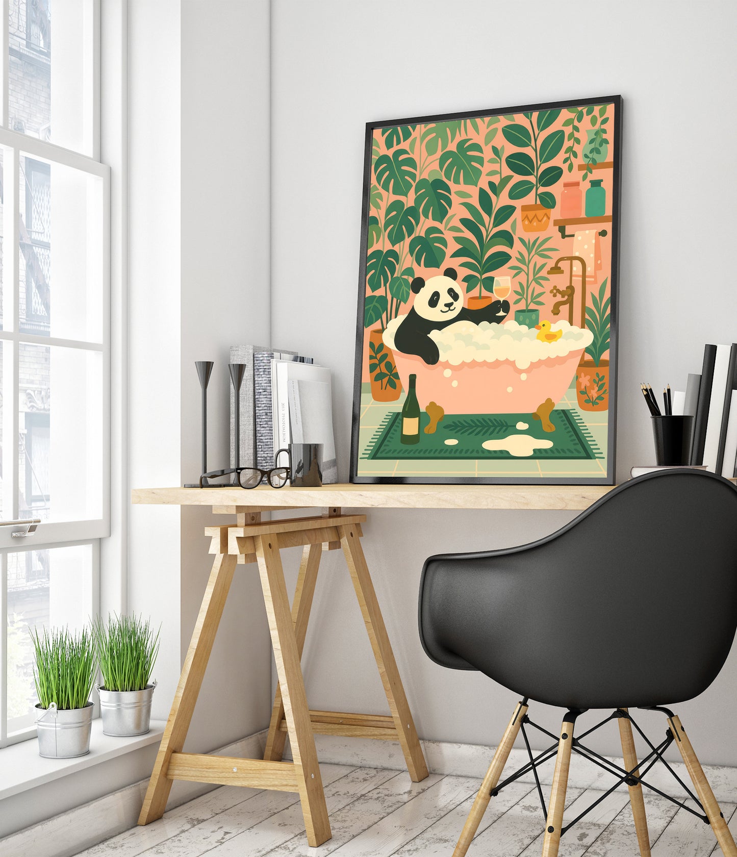 This charming "Panda Bath" poster captures a relaxed panda luxuriating in a bubble bath surrounded by lush, green plants. The whimsical illustration features a panda holding a wineglass, accompanied by a rubber duck, set against a pastel background that brings a playful, serene vibe to any space. Perfect for adding a lighthearted touch to bathroom decor.