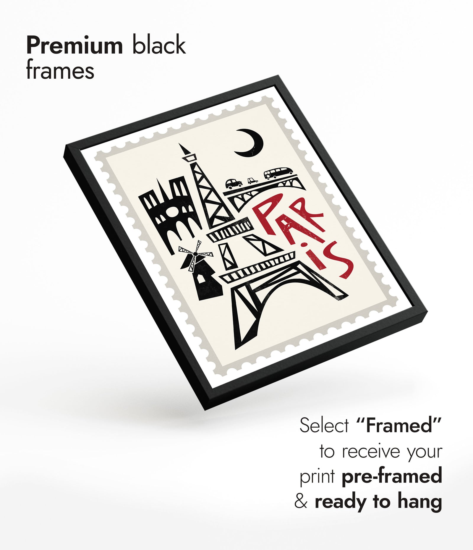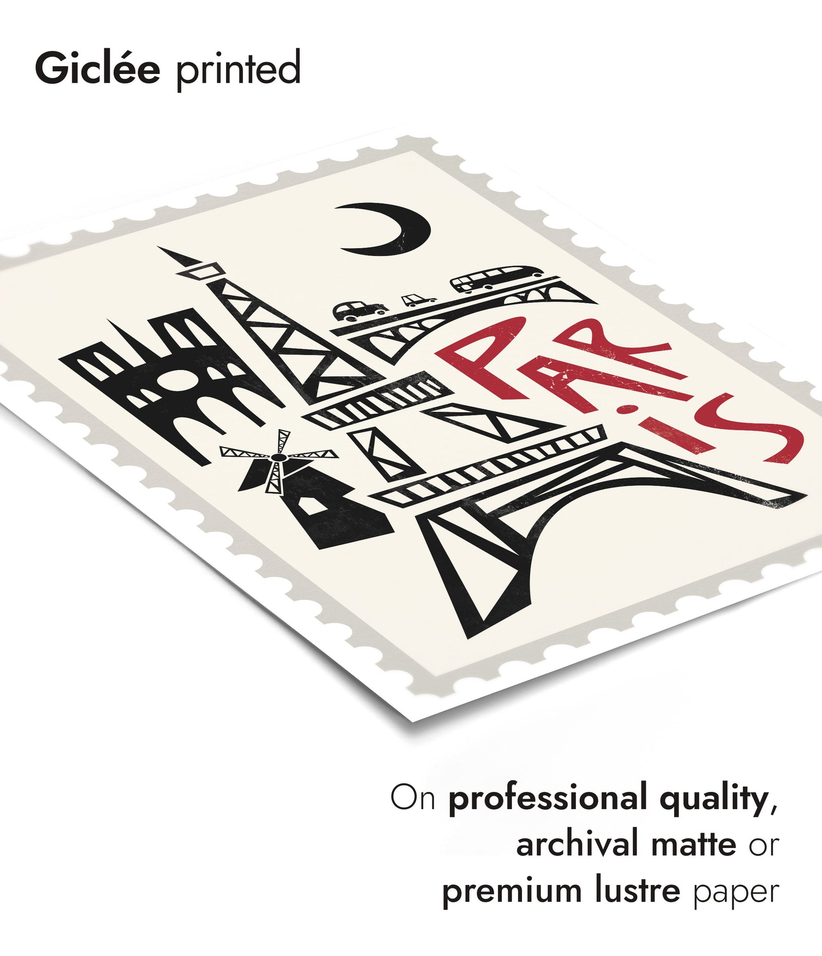 This striking "Paris" poster captures the essence of iconic Parisian landmarks through bold graphic collage art. Featuring the Eiffel Tower, a quaint windmill, a classic bridge with cars, and the famed Notre Dame silhouette, accented by the moon and the word "Paris" in vibrant red. Ideal for celebrating the timeless architecture and charm of France's capital.
