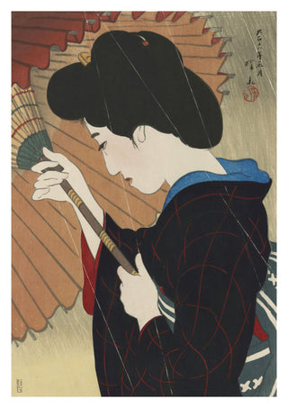 "Passing Rain" is a striking art poster by Shinsui Ito, created in 1917, showcasing a woman elegantly holding a parasol. Capturing the essence of traditional Japanese woodblock print techniques, this Ukiyo-e and Shin-Hanga masterpiece highlights the intricate details of the kimono and raindrops. The use of black and orange hues enhances the serene yet vibrant atmosphere, reflecting classical artistry.