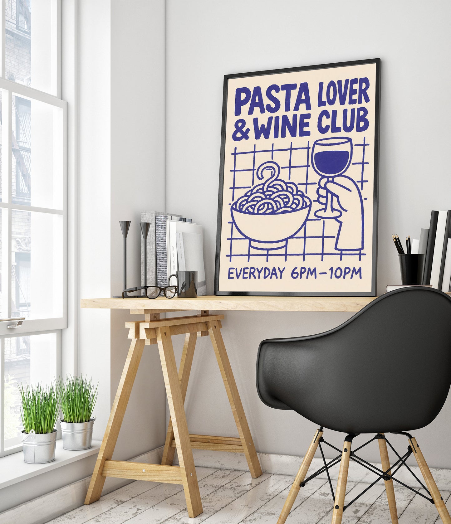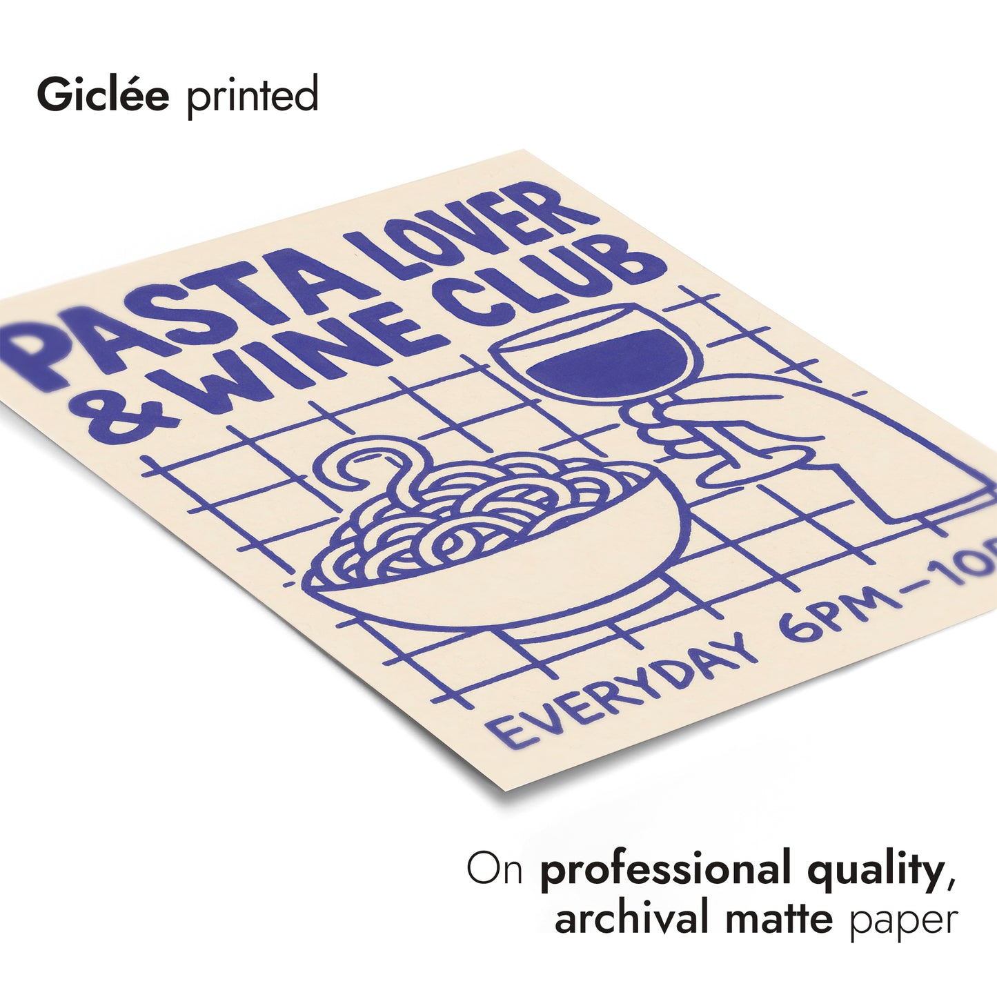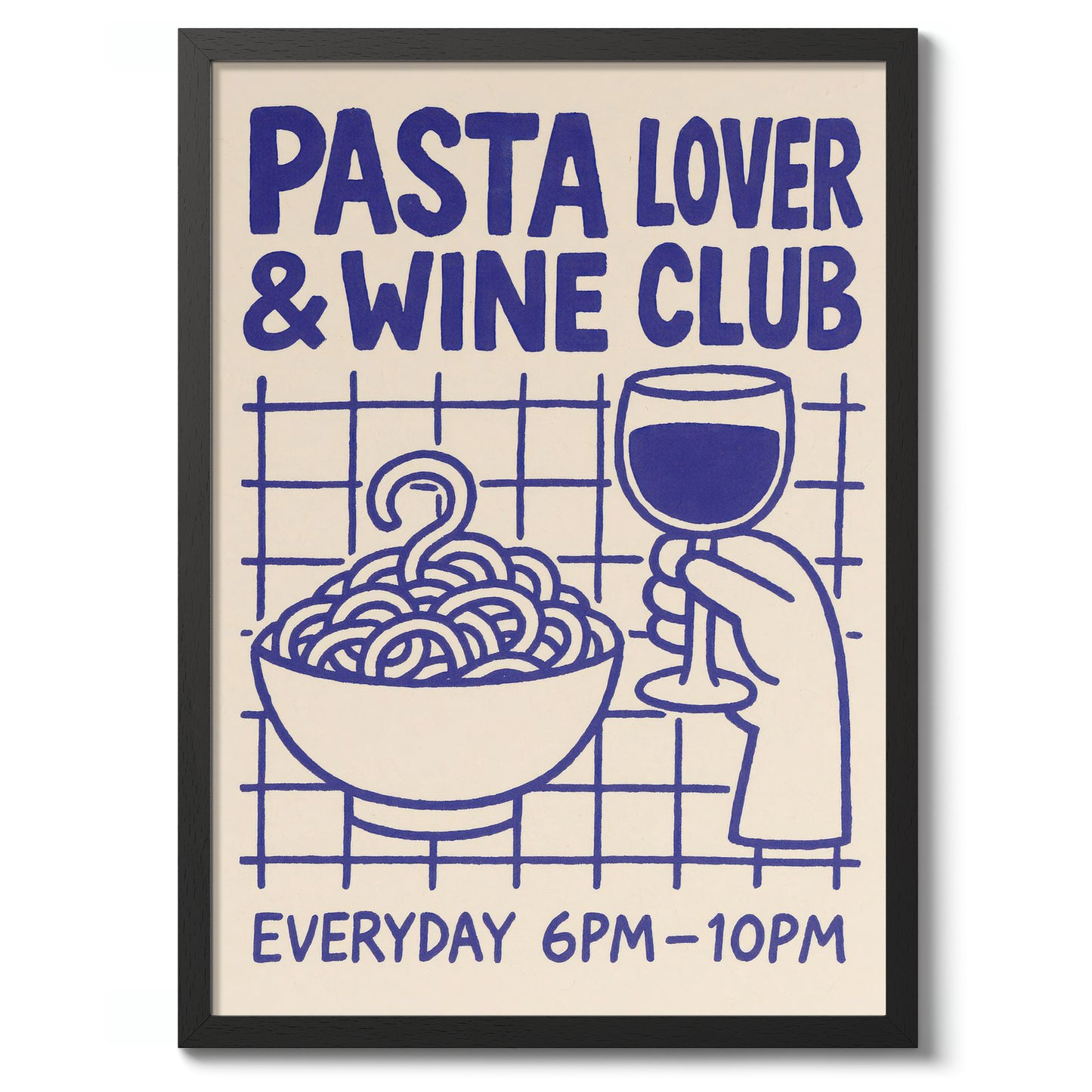 Celebrate culinary delights with the "Pasta Lover & Wine Club" poster. Featuring bold typographic elements in striking blue, this graphic illustration showcases a bowl of pasta and a glass of wine against a grid background. Perfect for kitchen decor or food enthusiasts, this poster embodies a convivial dining atmosphere with its playful design and inviting theme.
