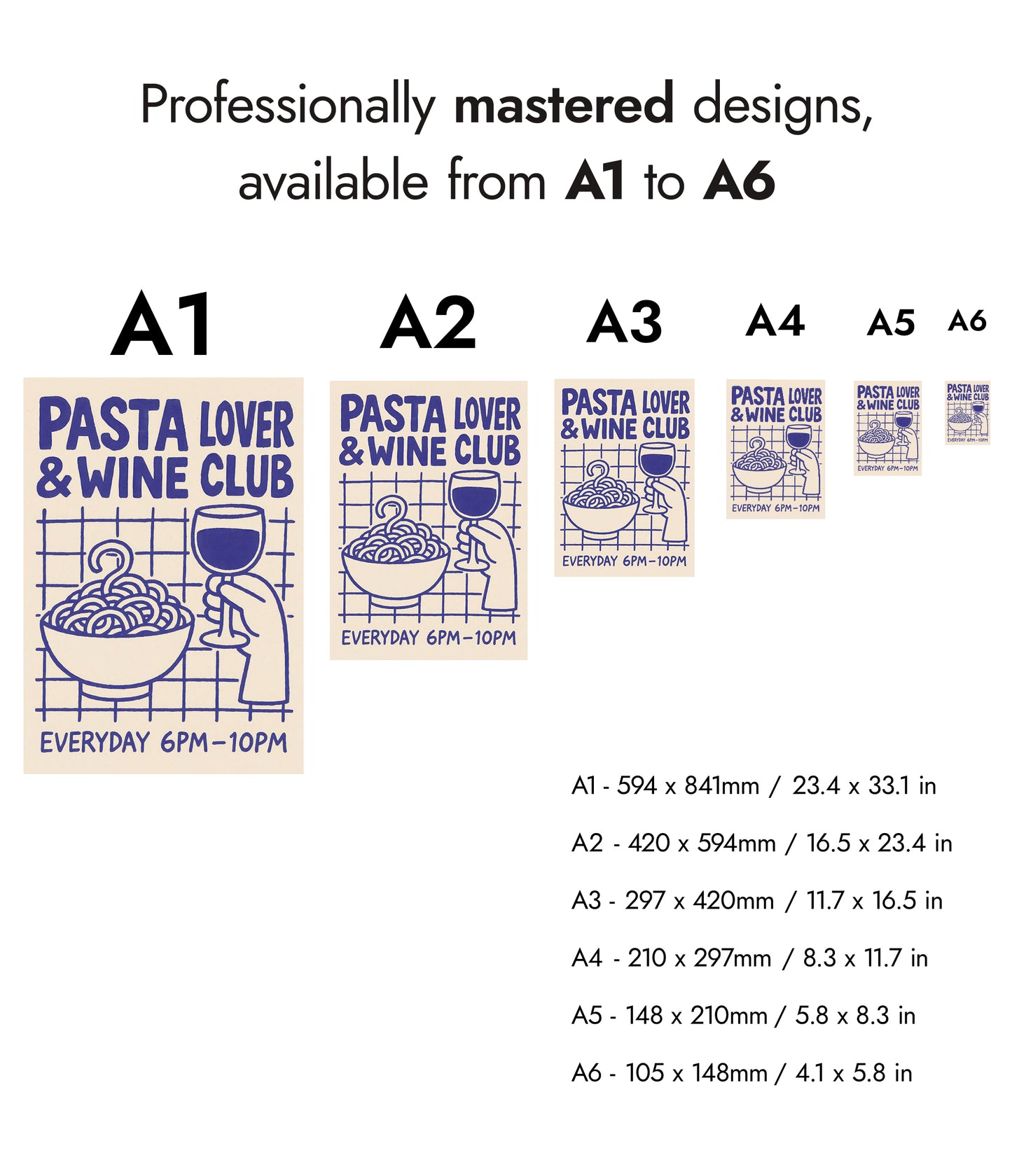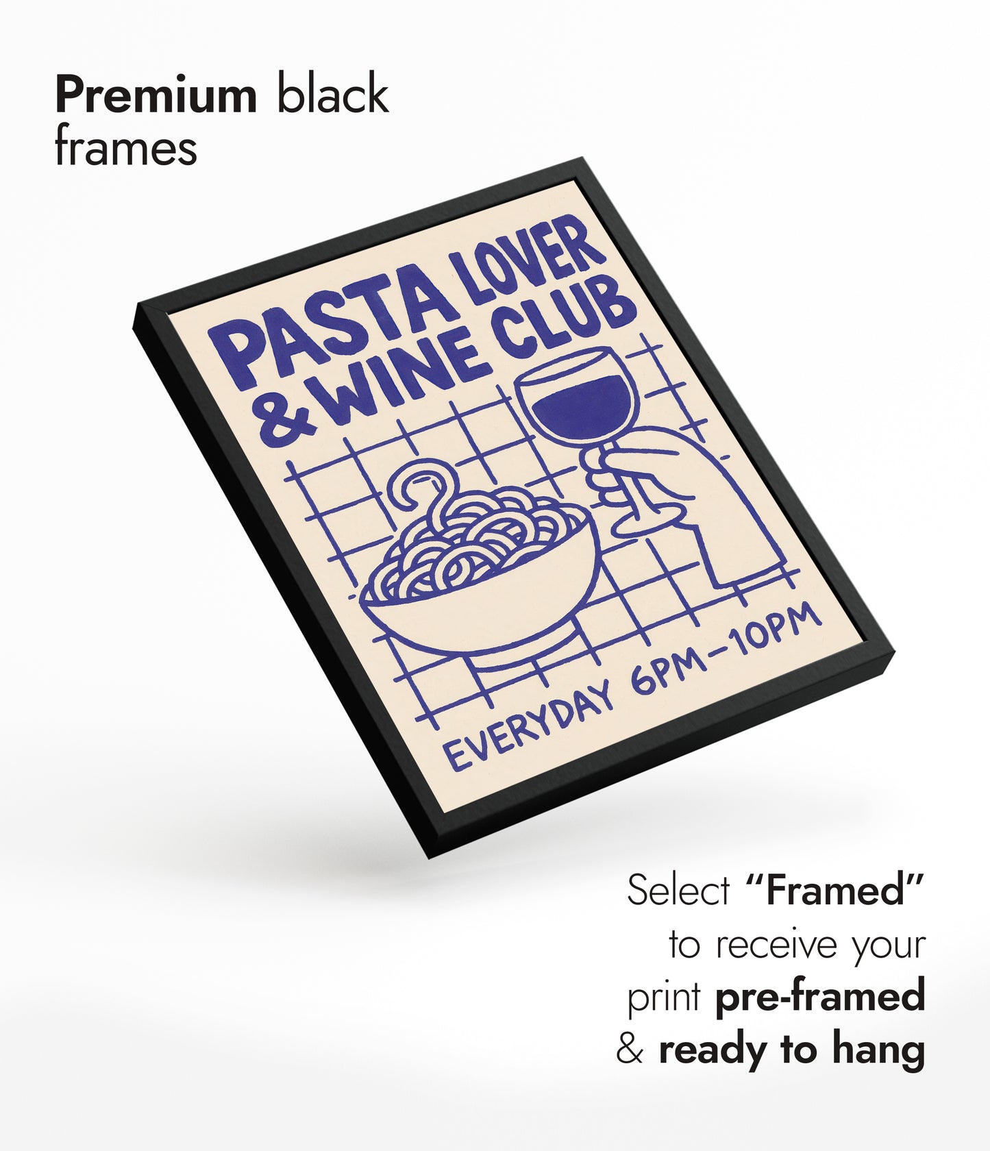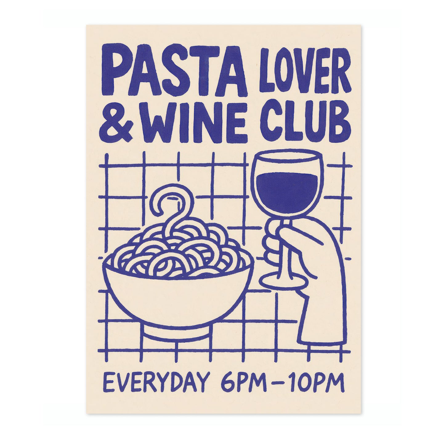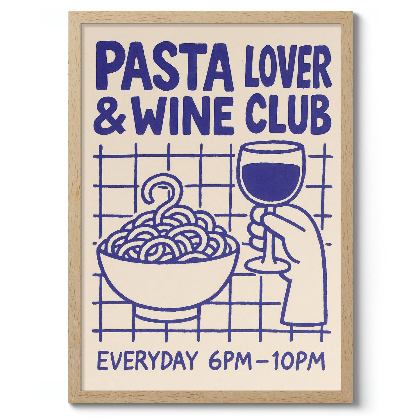 Celebrate culinary delights with the "Pasta Lover & Wine Club" poster. Featuring bold typographic elements in striking blue, this graphic illustration showcases a bowl of pasta and a glass of wine against a grid background. Perfect for kitchen decor or food enthusiasts, this poster embodies a convivial dining atmosphere with its playful design and inviting theme.
