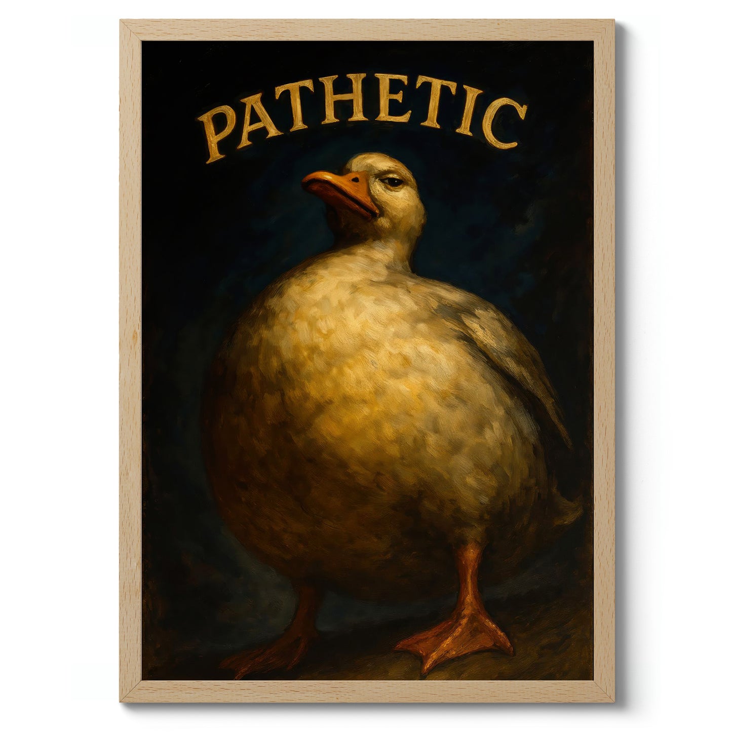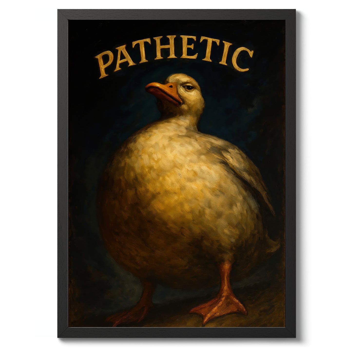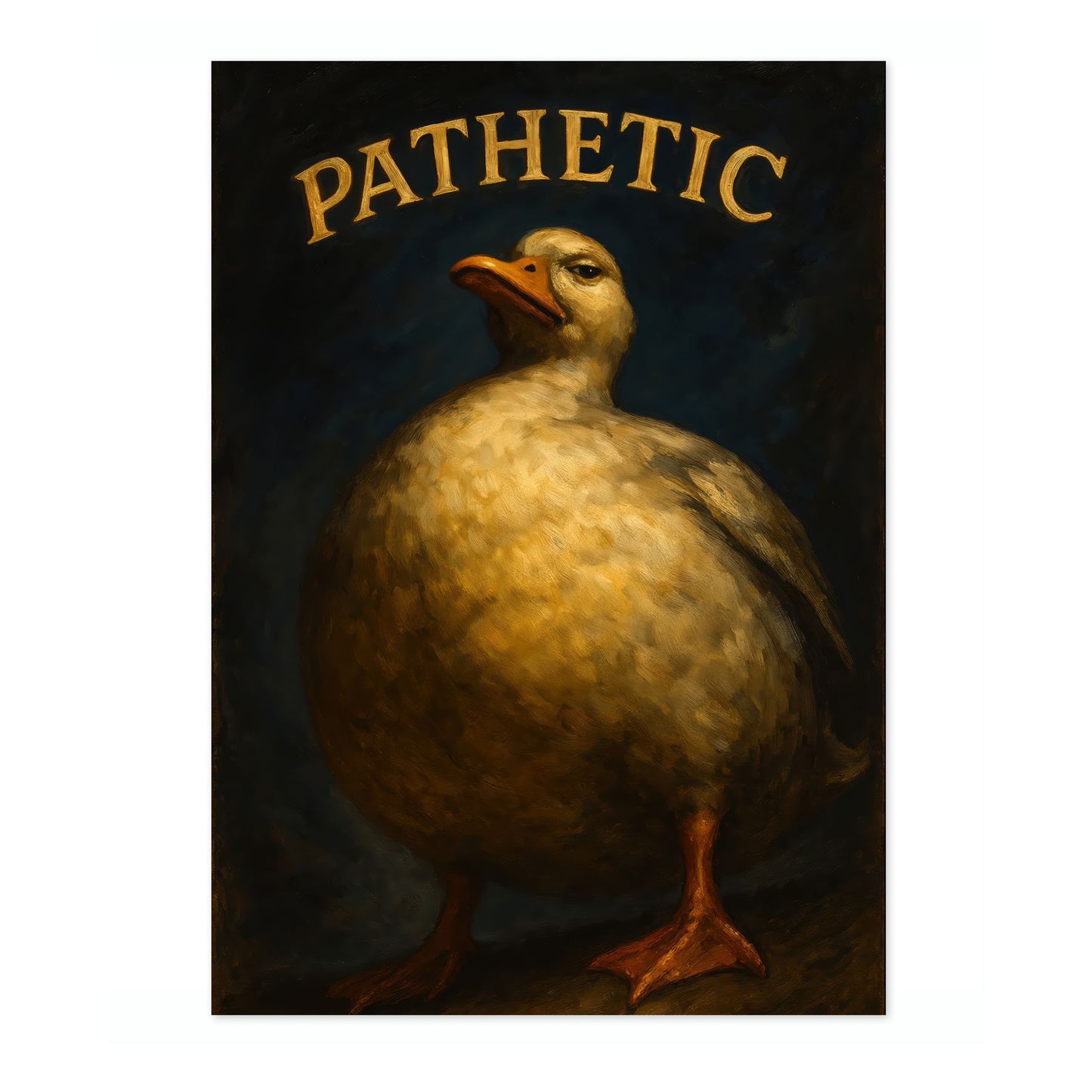 This humorous poster features a plump, stern-faced duck under the bold typographic word "PATHETIC." The duck's expressive demeanor and the rich, painterly texture create a striking contrast against the dark background. Perfect for adding a touch of wit and personality to any space, this poster deftly combines animal charm with graphic and typographic flair.