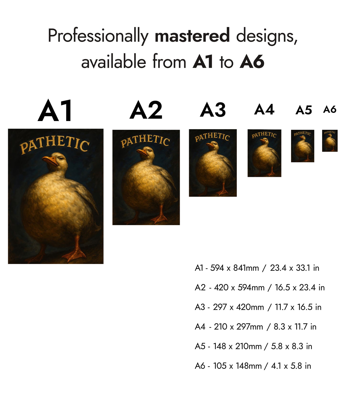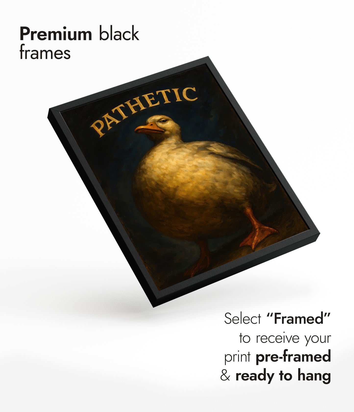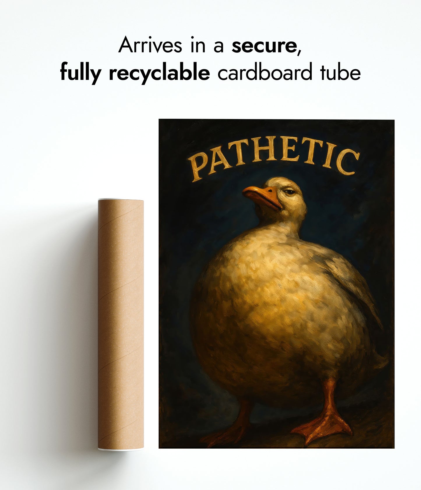 This humorous poster features a plump, stern-faced duck under the bold typographic word "PATHETIC." The duck's expressive demeanor and the rich, painterly texture create a striking contrast against the dark background. Perfect for adding a touch of wit and personality to any space, this poster deftly combines animal charm with graphic and typographic flair.