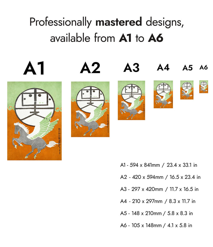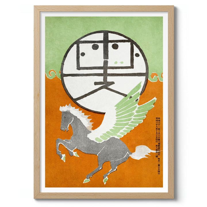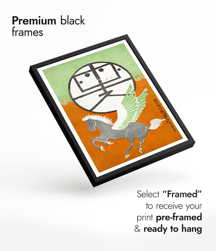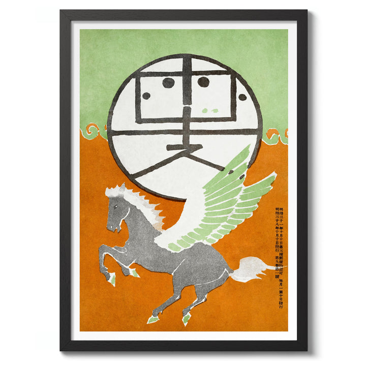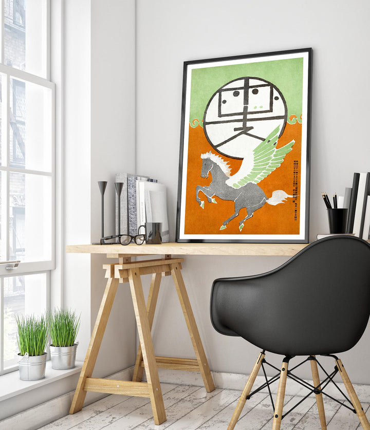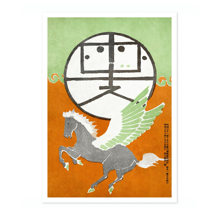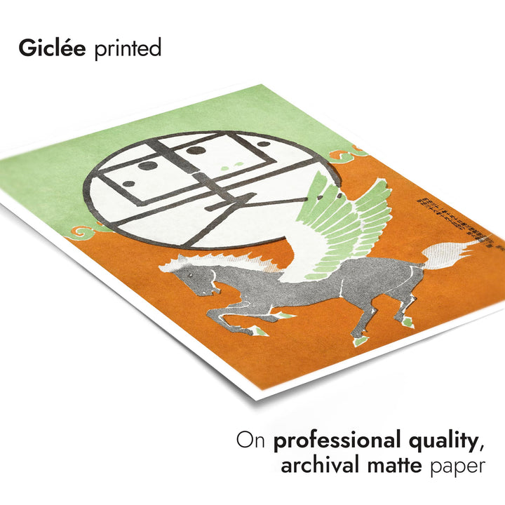 This Pegasus poster by Nakamura Fusetsu captures the mythical winged horse in traditional Japanese Sumi-E style. Rendered in soft grays and greens, the artwork blends fantasy with cultural elements, set against a bold, earthy backdrop. The intricate calligraphy adds authentic detail, making it a striking piece for fans of Japanese art and mythology.