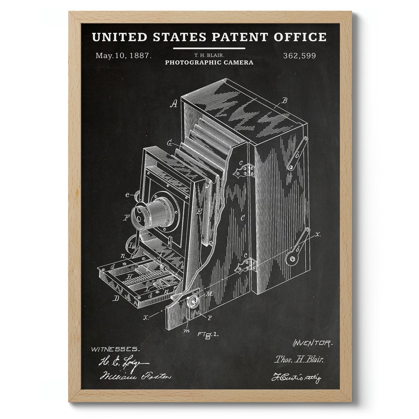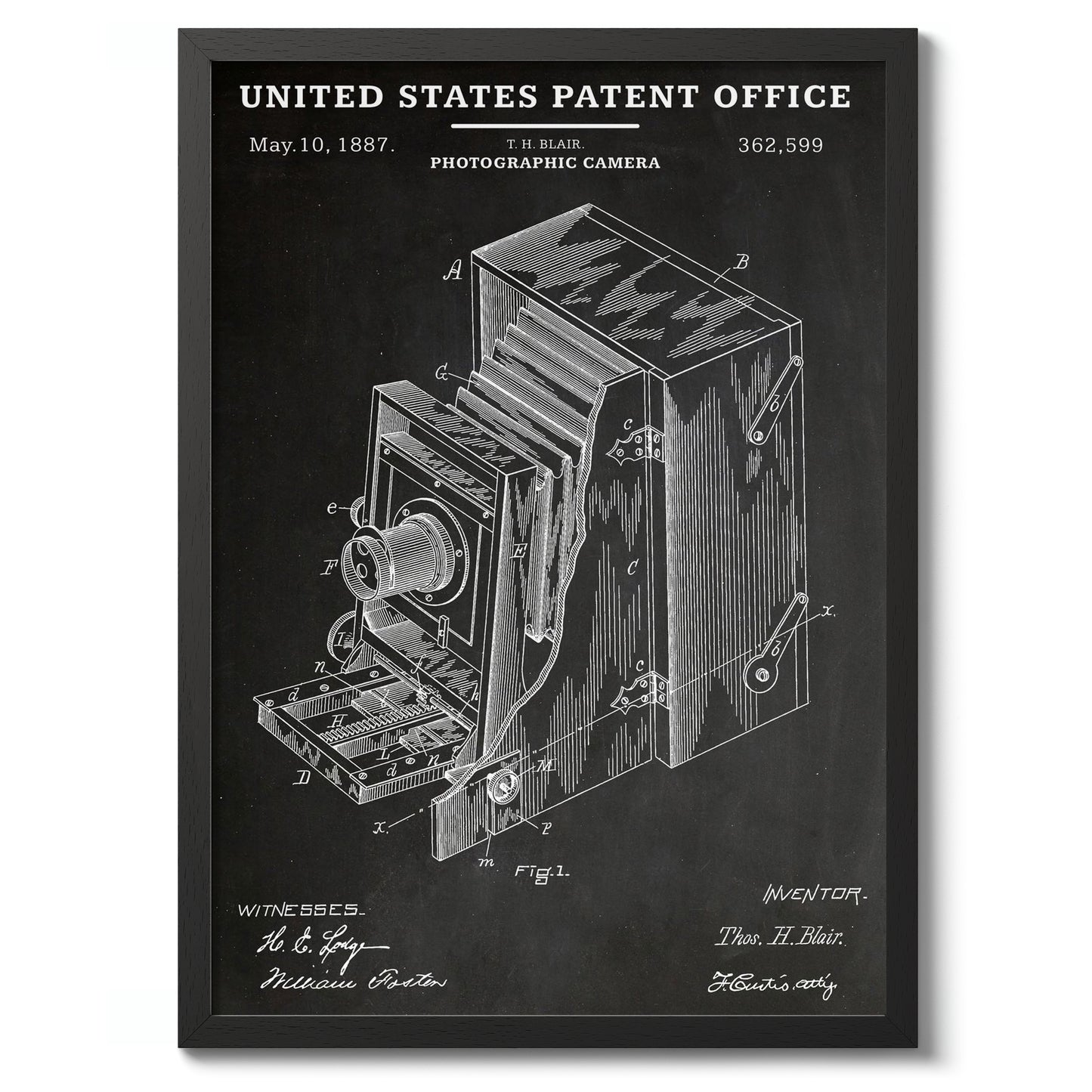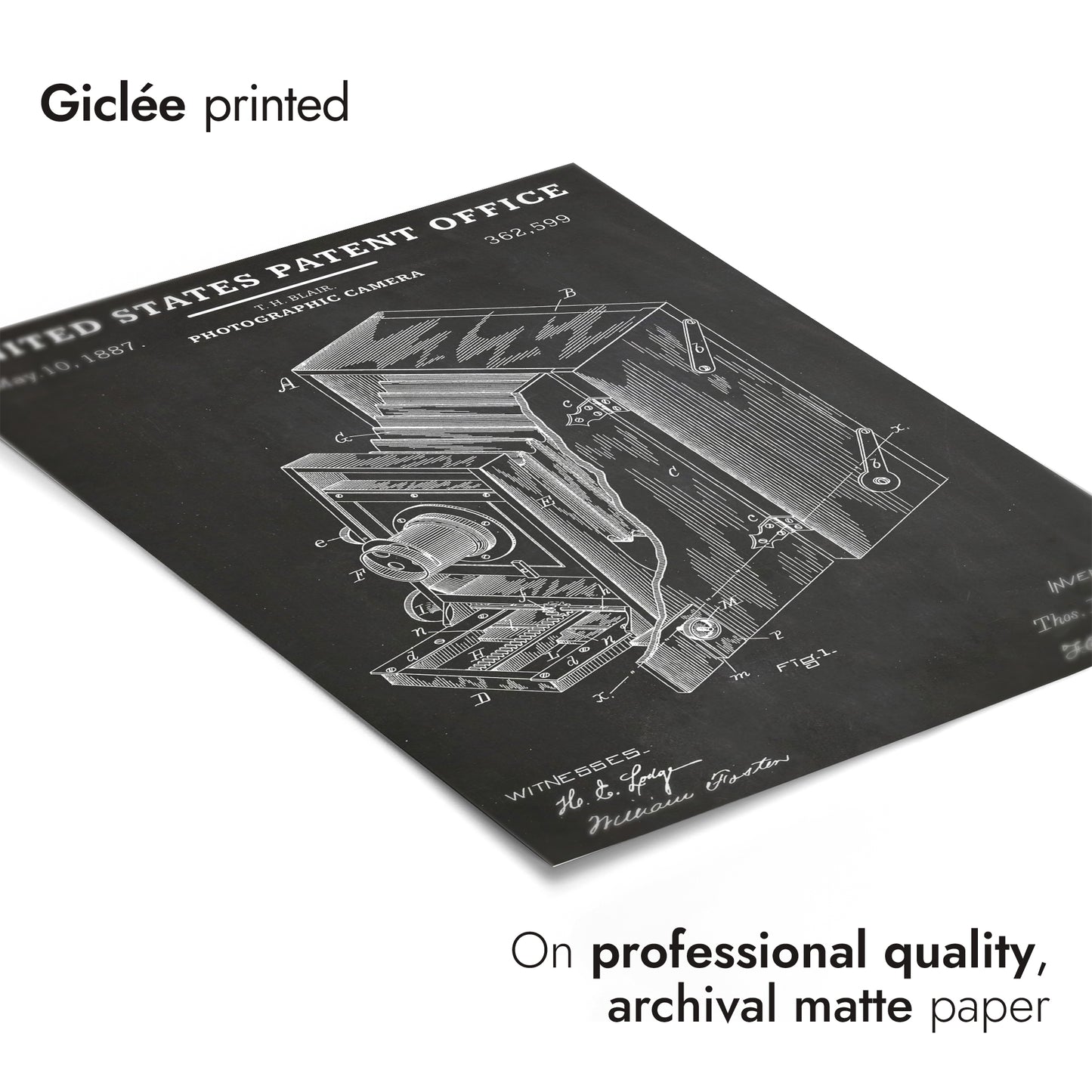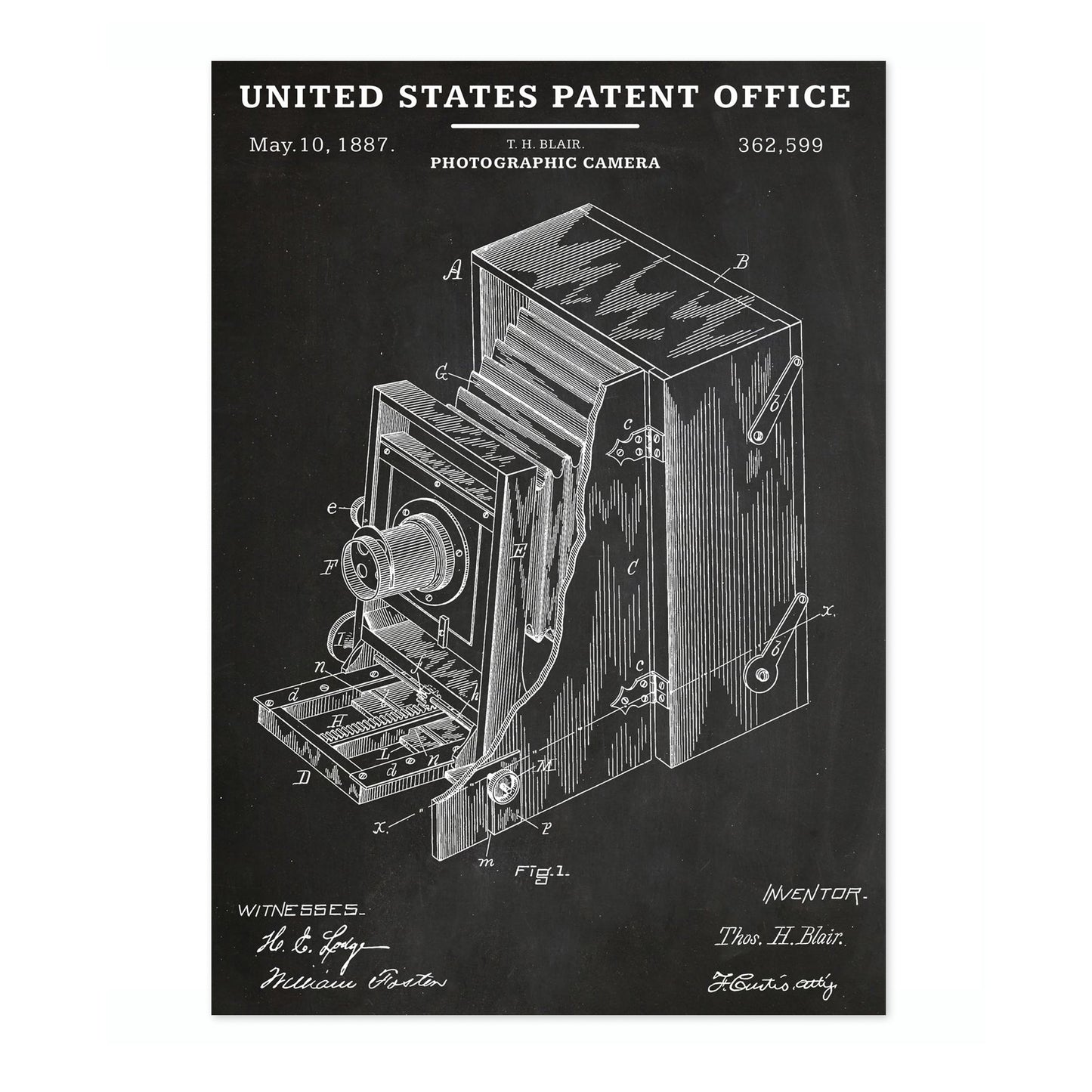 This vintage poster features an 1887 United States patent schematic for a photographic camera. Showcasing detailed line art in black and white, it highlights intricate mechanical elements and technical design notes typical of the era. Ideal for photography enthusiasts and historians, this poster celebrates the ingenuity of early camera technology in an educational and visually striking manner.