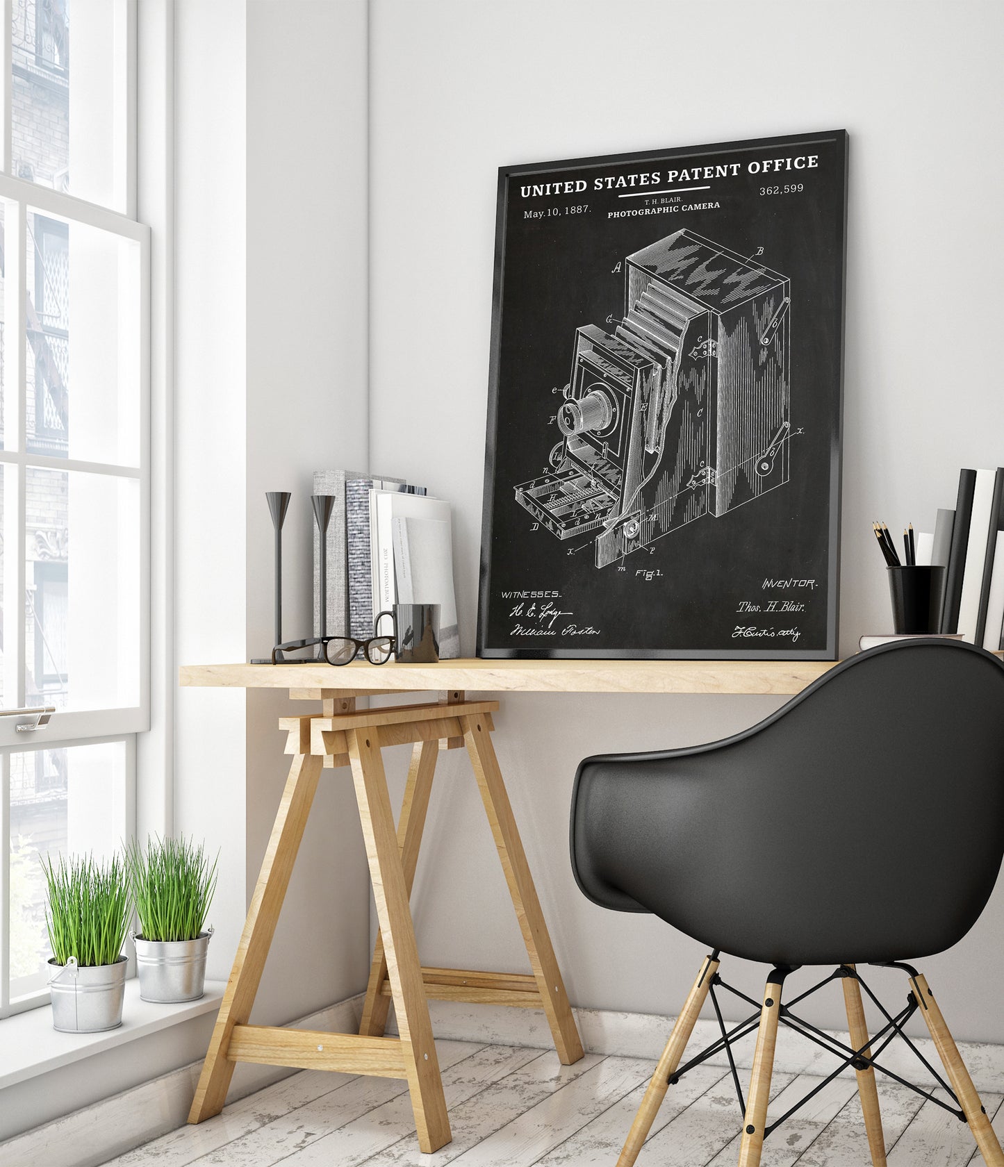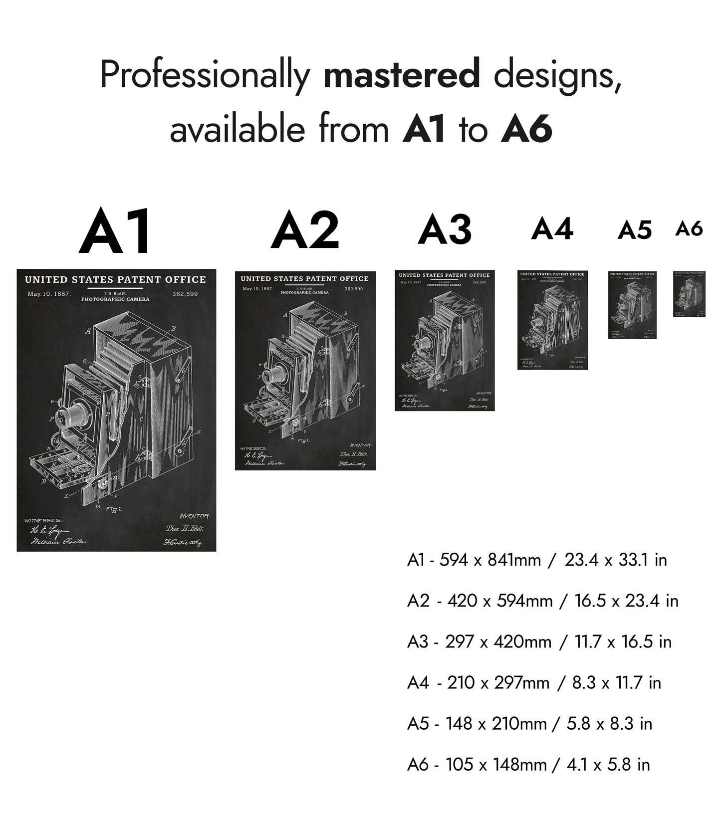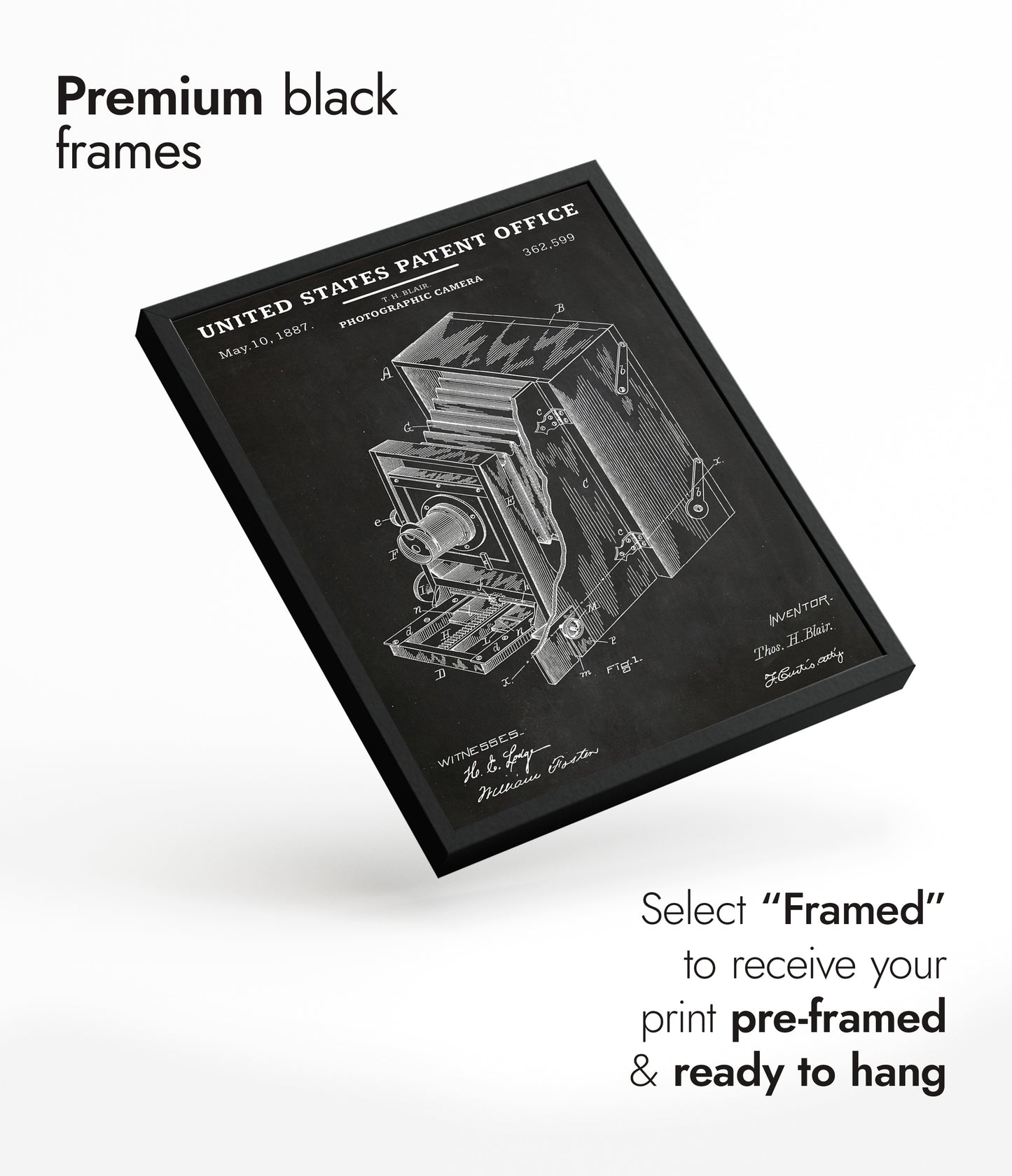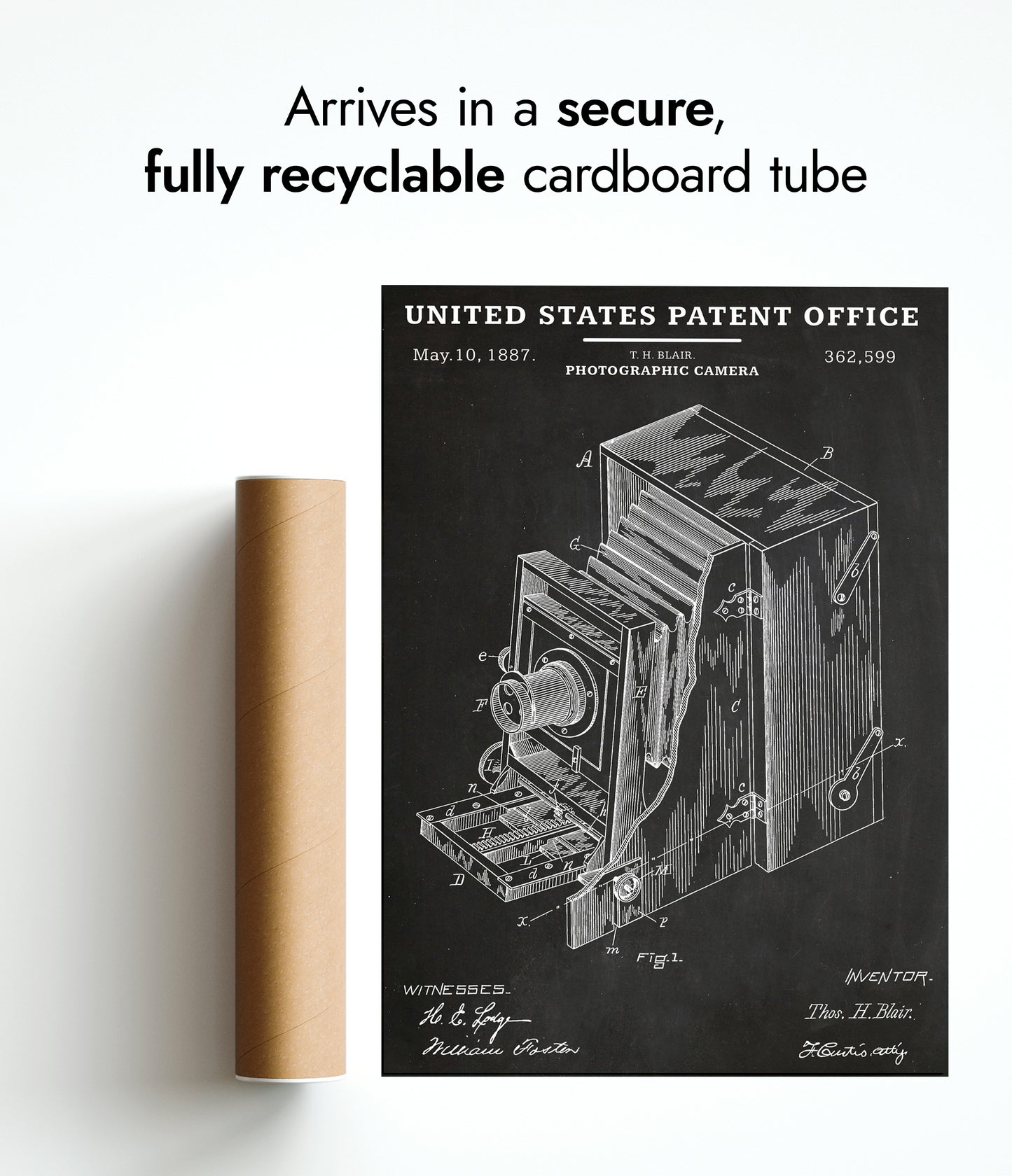 This vintage poster features an 1887 United States patent schematic for a photographic camera. Showcasing detailed line art in black and white, it highlights intricate mechanical elements and technical design notes typical of the era. Ideal for photography enthusiasts and historians, this poster celebrates the ingenuity of early camera technology in an educational and visually striking manner.