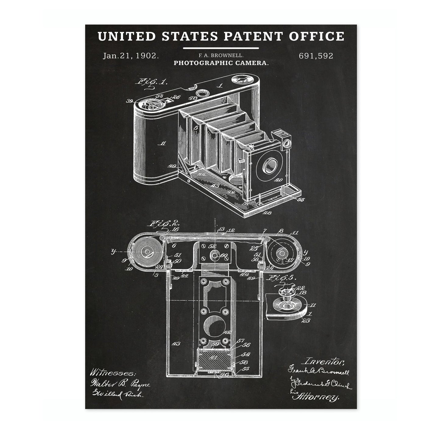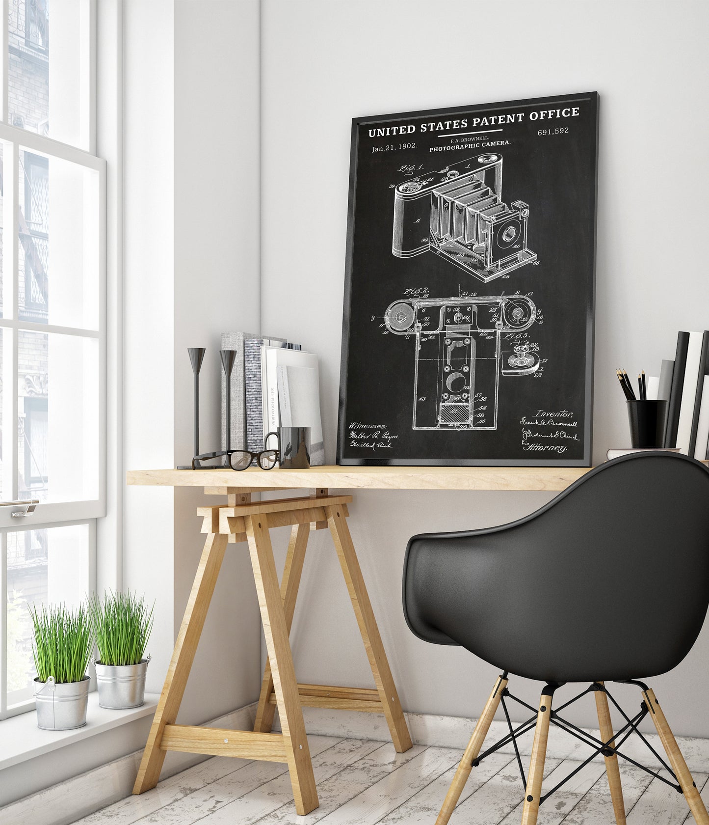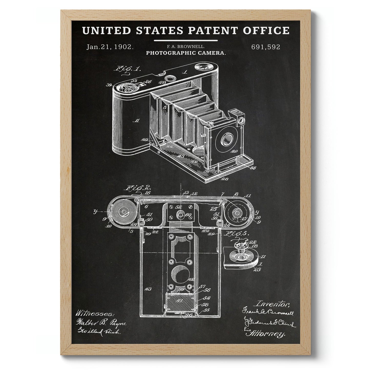 This vintage patent poster features a detailed schematic of an early photographic camera, dated January 21, 1902. The black and white line art showcases intricate parts and mechanical design, highlighting the artistry of early photography technology. Ideal for enthusiasts of vintage cameras and those interested in historical inventions, this poster seamlessly blends art and technical illustration.