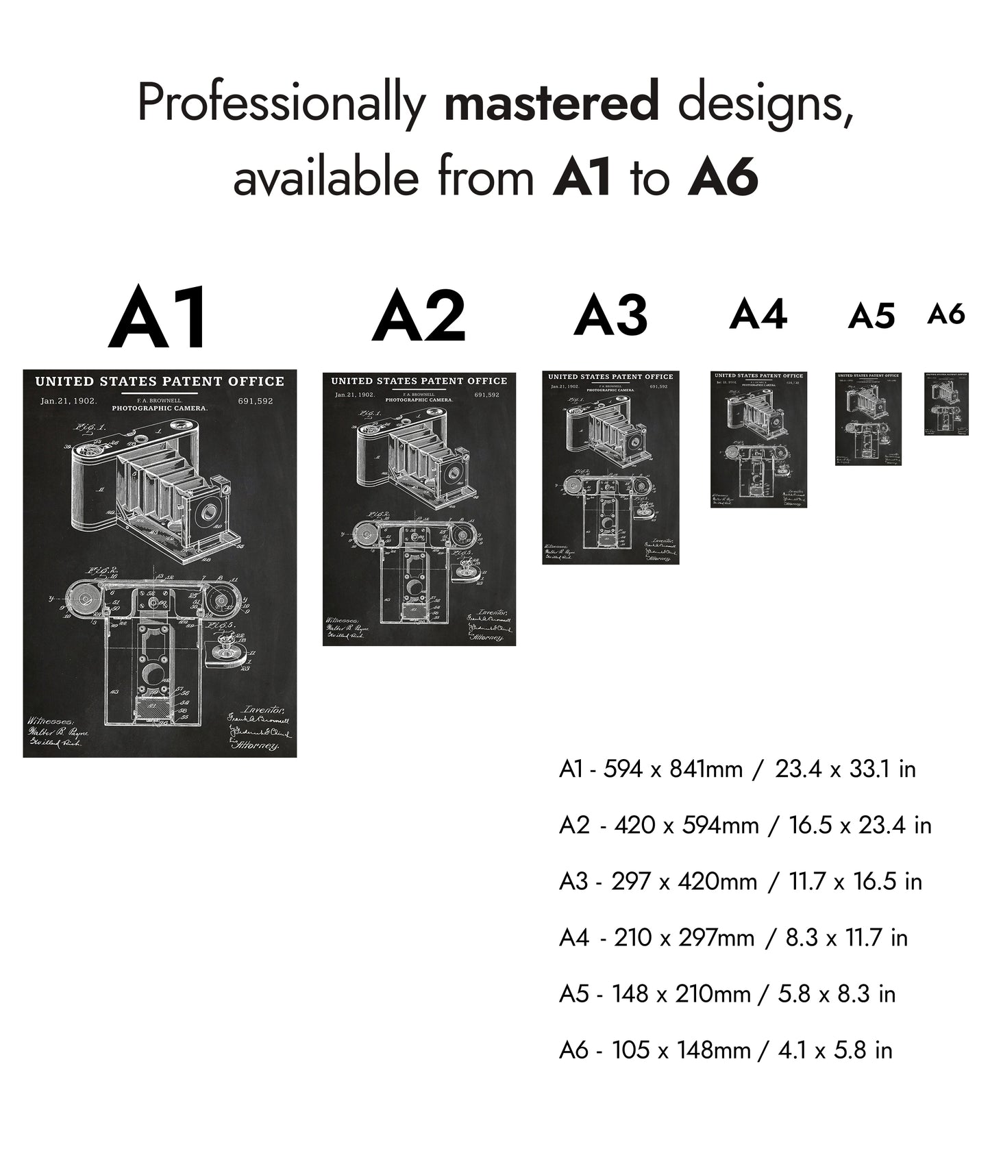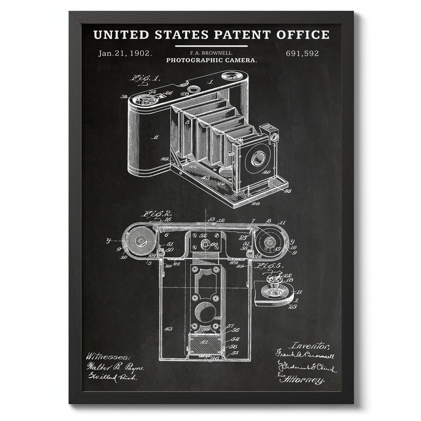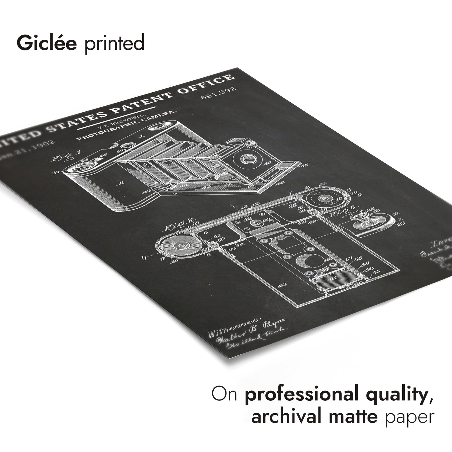 This vintage patent poster features a detailed schematic of an early photographic camera, dated January 21, 1902. The black and white line art showcases intricate parts and mechanical design, highlighting the artistry of early photography technology. Ideal for enthusiasts of vintage cameras and those interested in historical inventions, this poster seamlessly blends art and technical illustration.