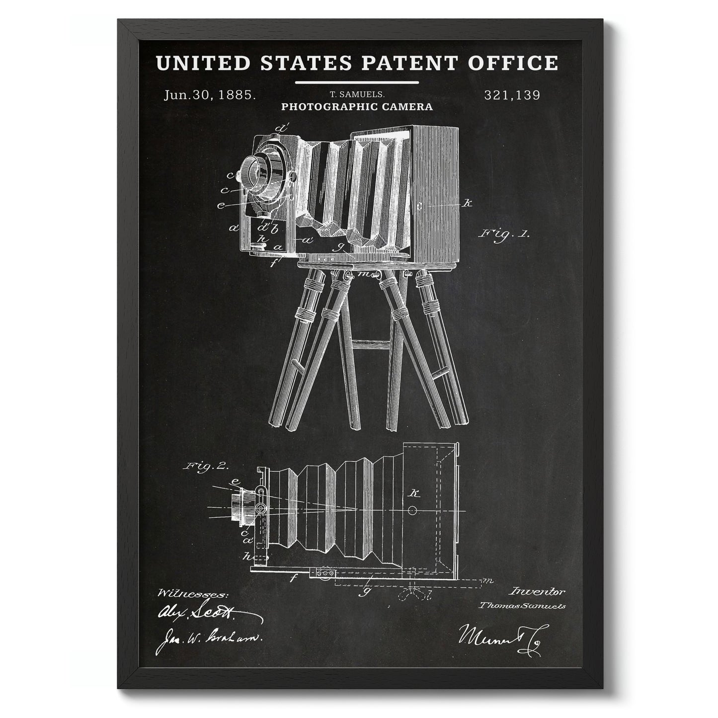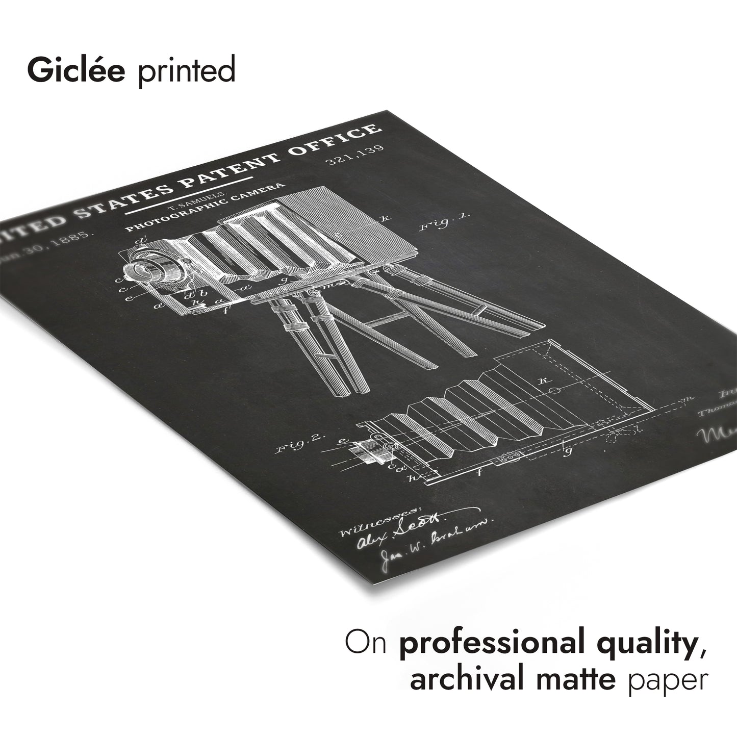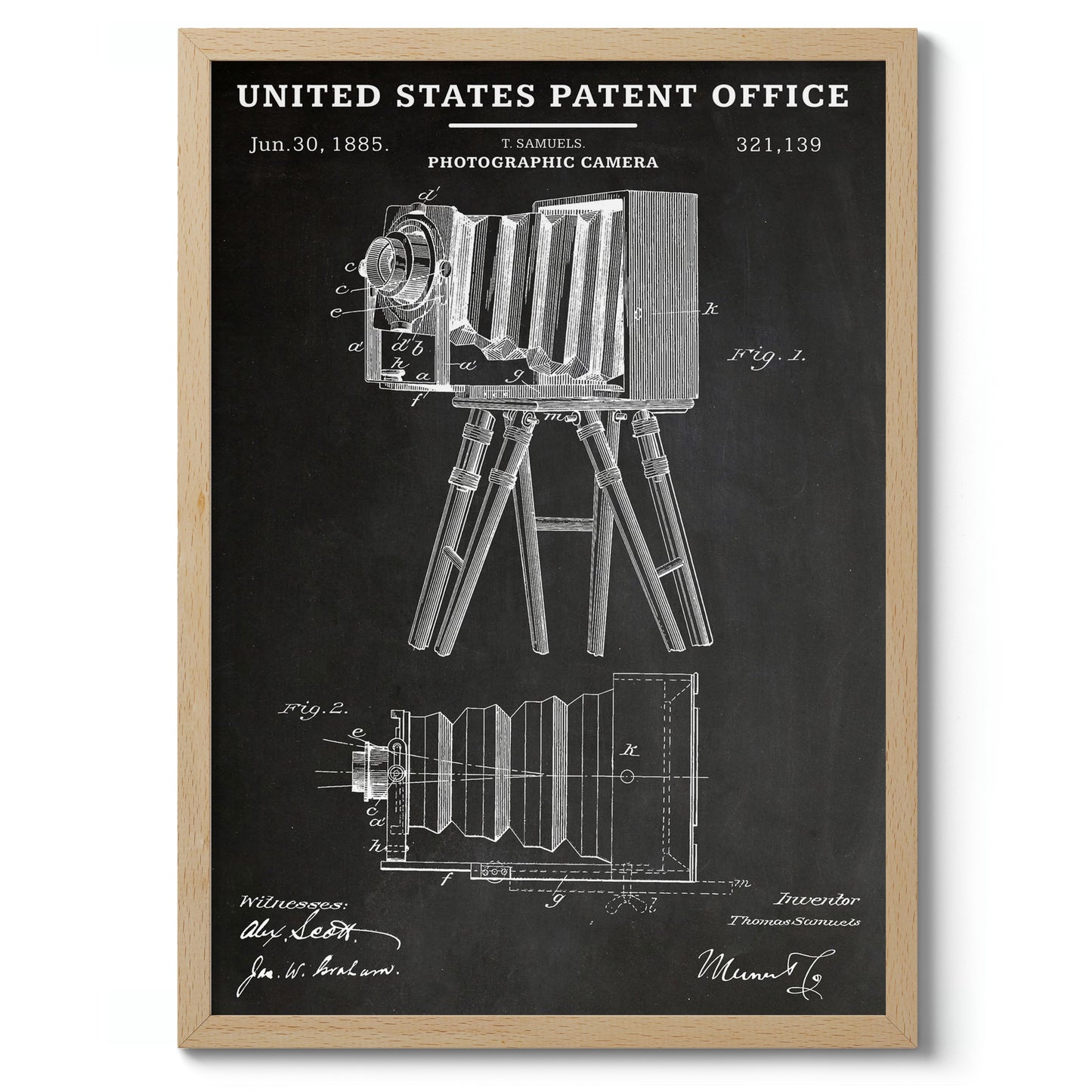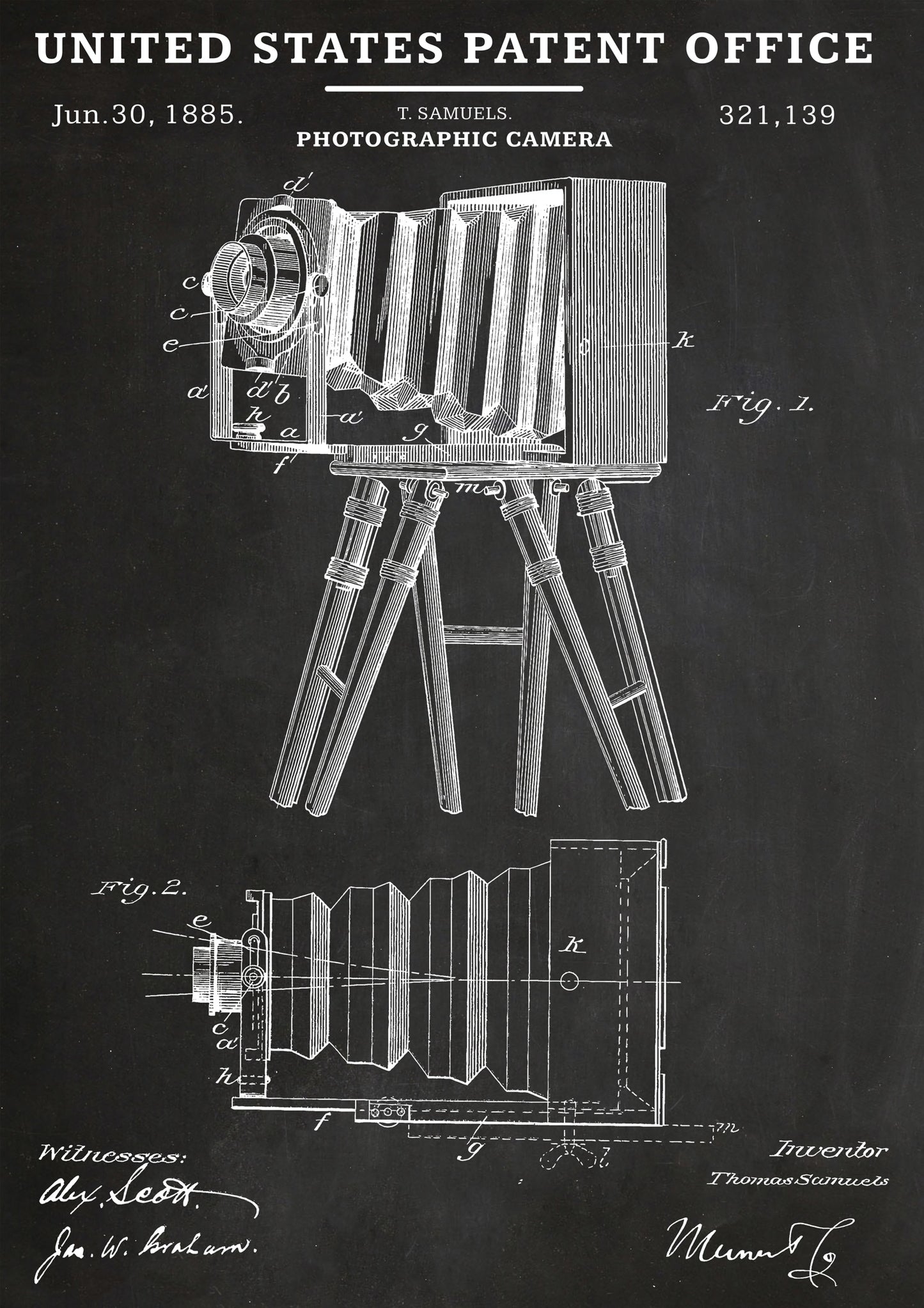 This vintage patent poster depicts the intricate schematics of a 19th-century photographic camera, showcasing detailed line art against a classic black and white backdrop. Ideal for enthusiasts of historical inventions, this illustration from 1885 captures the essence of early photography technology, highlighting meticulous design elements that appeal to both art lovers and technology aficionados. Perfect for adding a historical touch to any space.