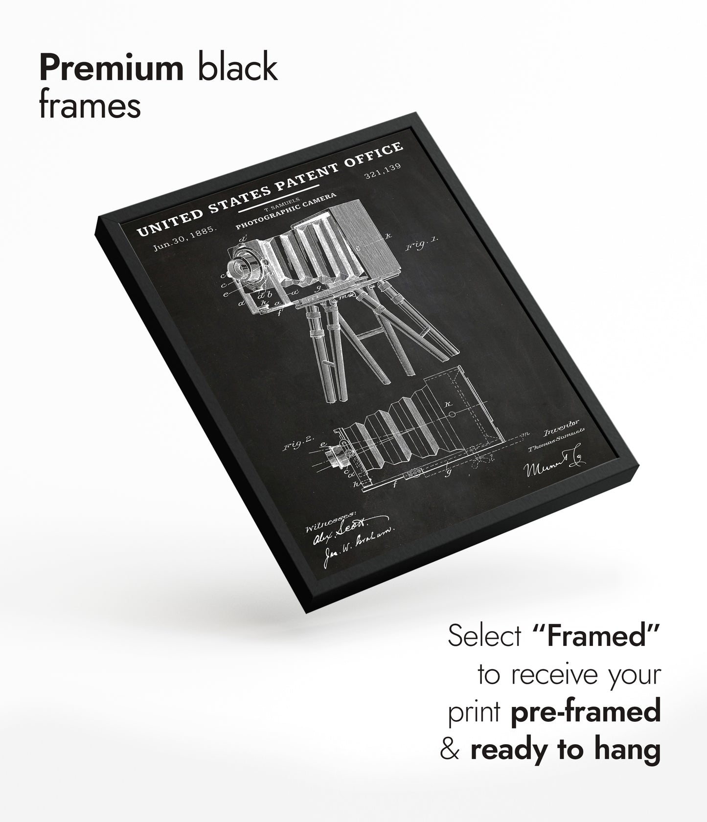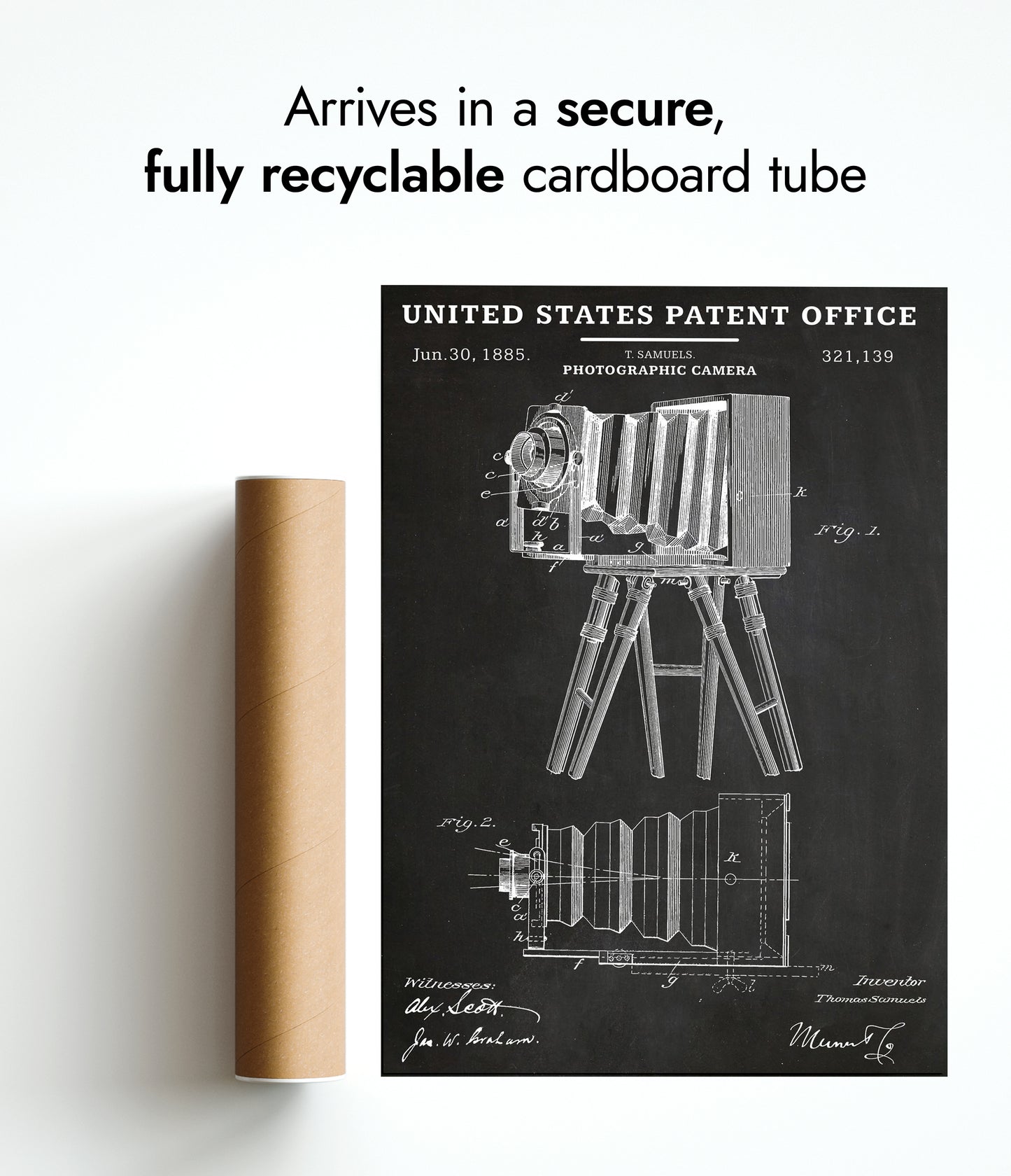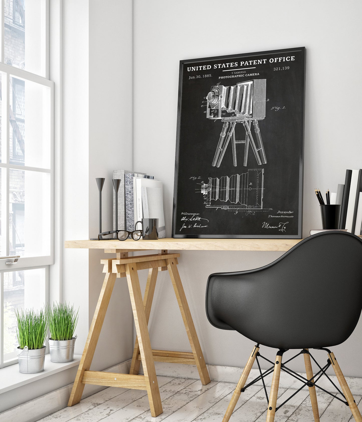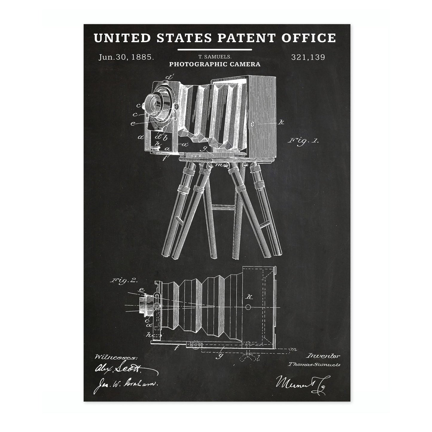This vintage patent poster depicts the intricate schematics of a 19th-century photographic camera, showcasing detailed line art against a classic black and white backdrop. Ideal for enthusiasts of historical inventions, this illustration from 1885 captures the essence of early photography technology, highlighting meticulous design elements that appeal to both art lovers and technology aficionados. Perfect for adding a historical touch to any space.