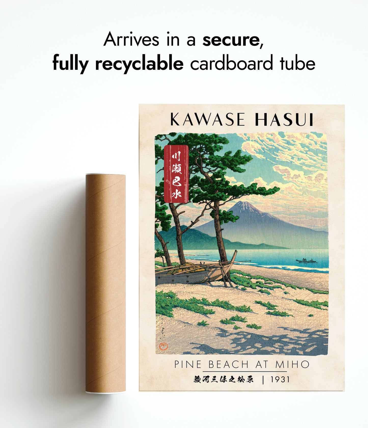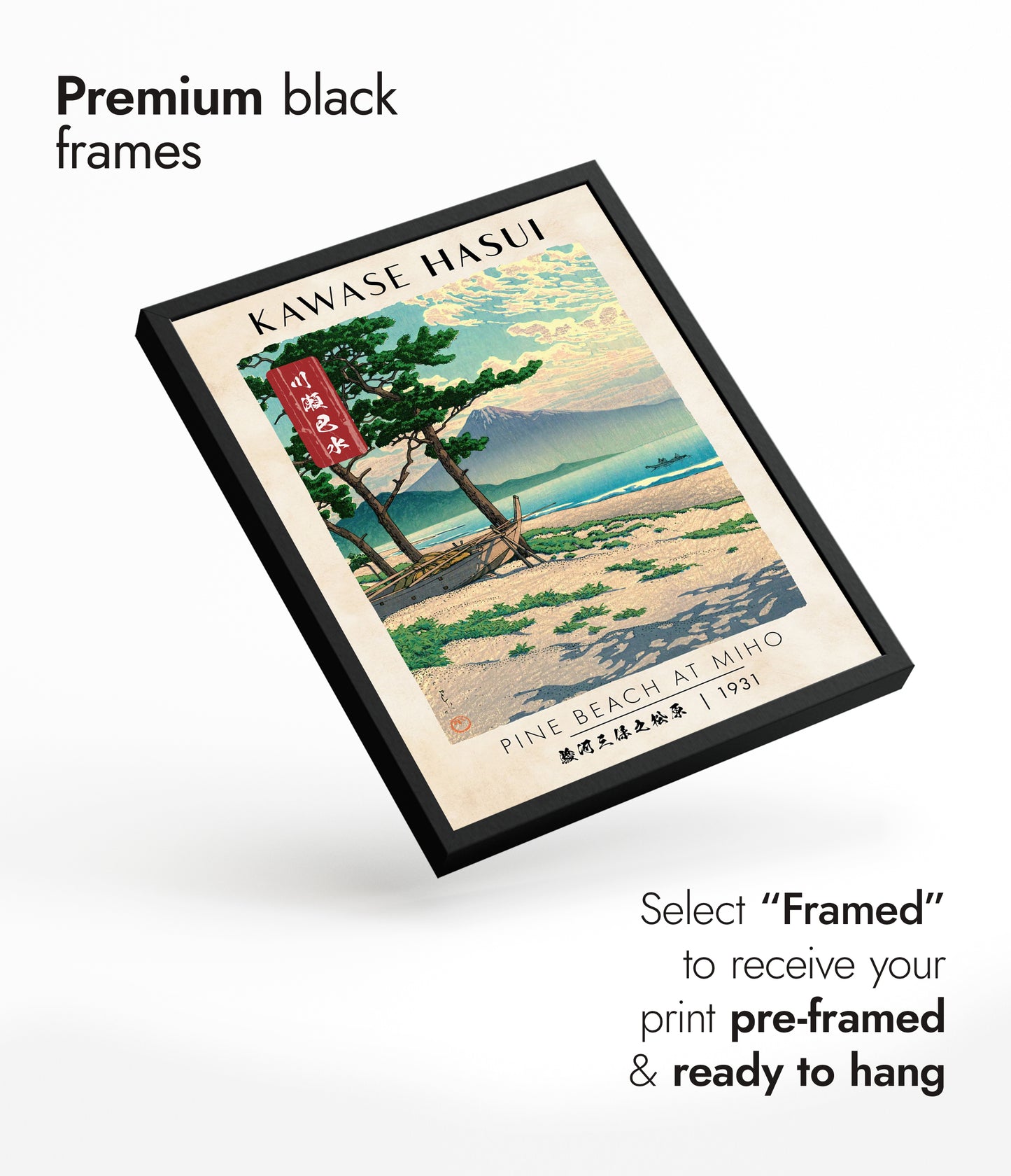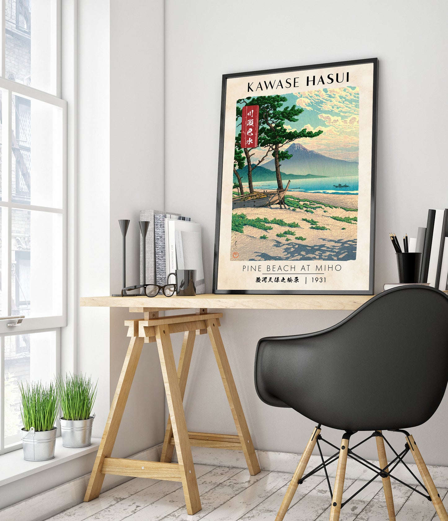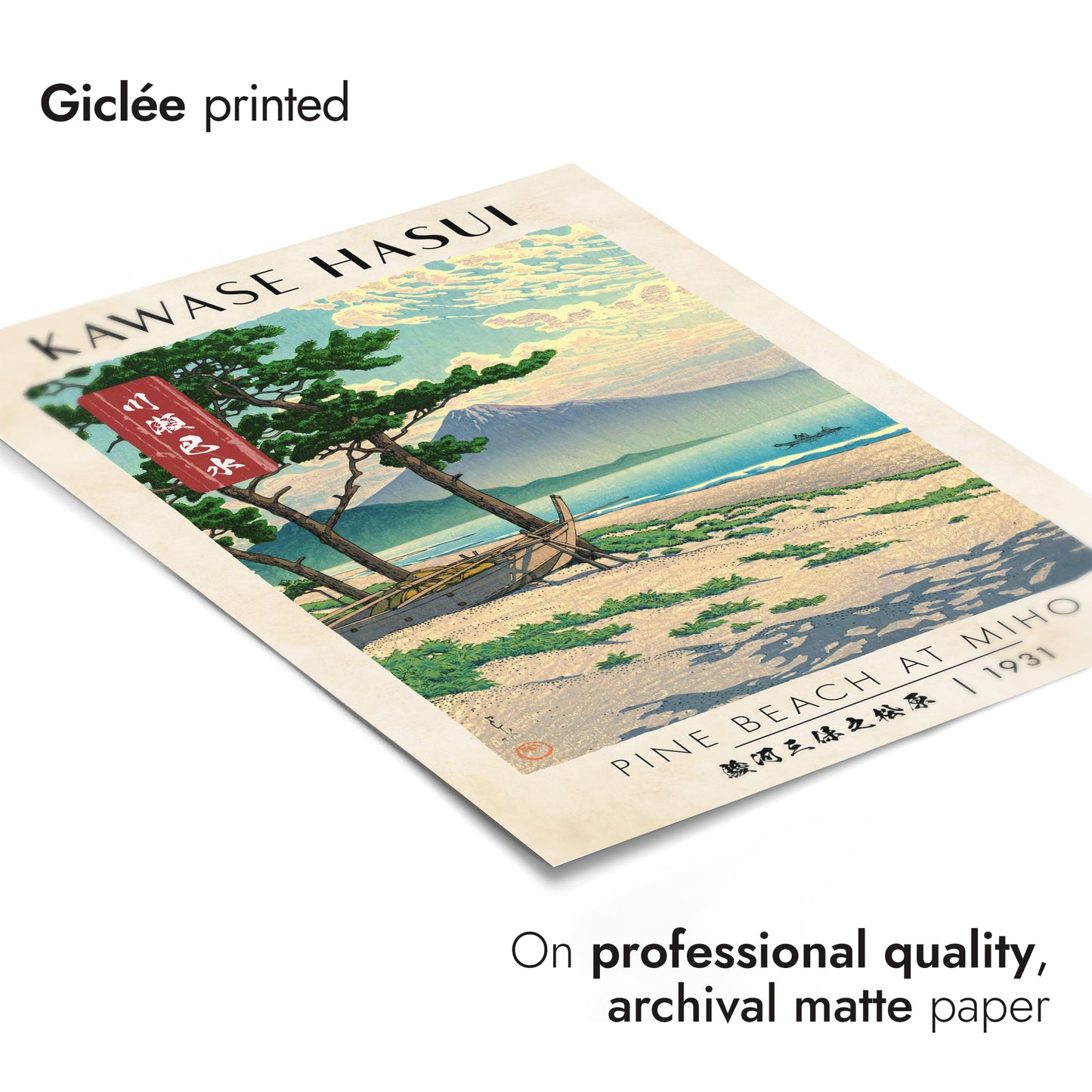 Kawase Hasui's "Pine Beach at Miho" art print captures a serene coastal scene, with harmonious layers of pine trees, a tranquil beach, and the iconic Mount Fuji in the background. This traditional woodblock poster, rich in intricate details and muted colors, reflects the peaceful elegance of Japanese landscapes and showcases Hasui's mastery in depicting natural beauty. Perfect for any art enthusiast.