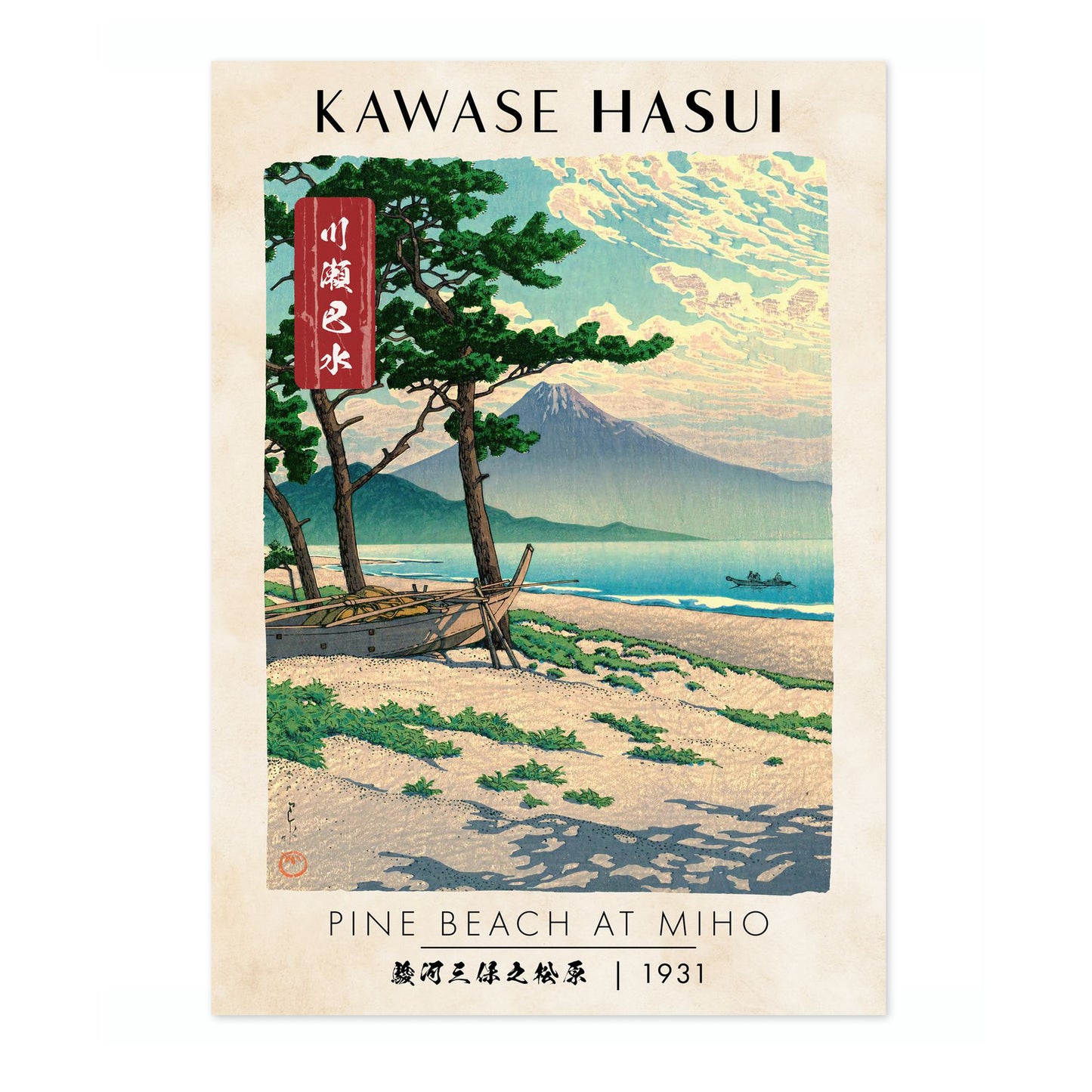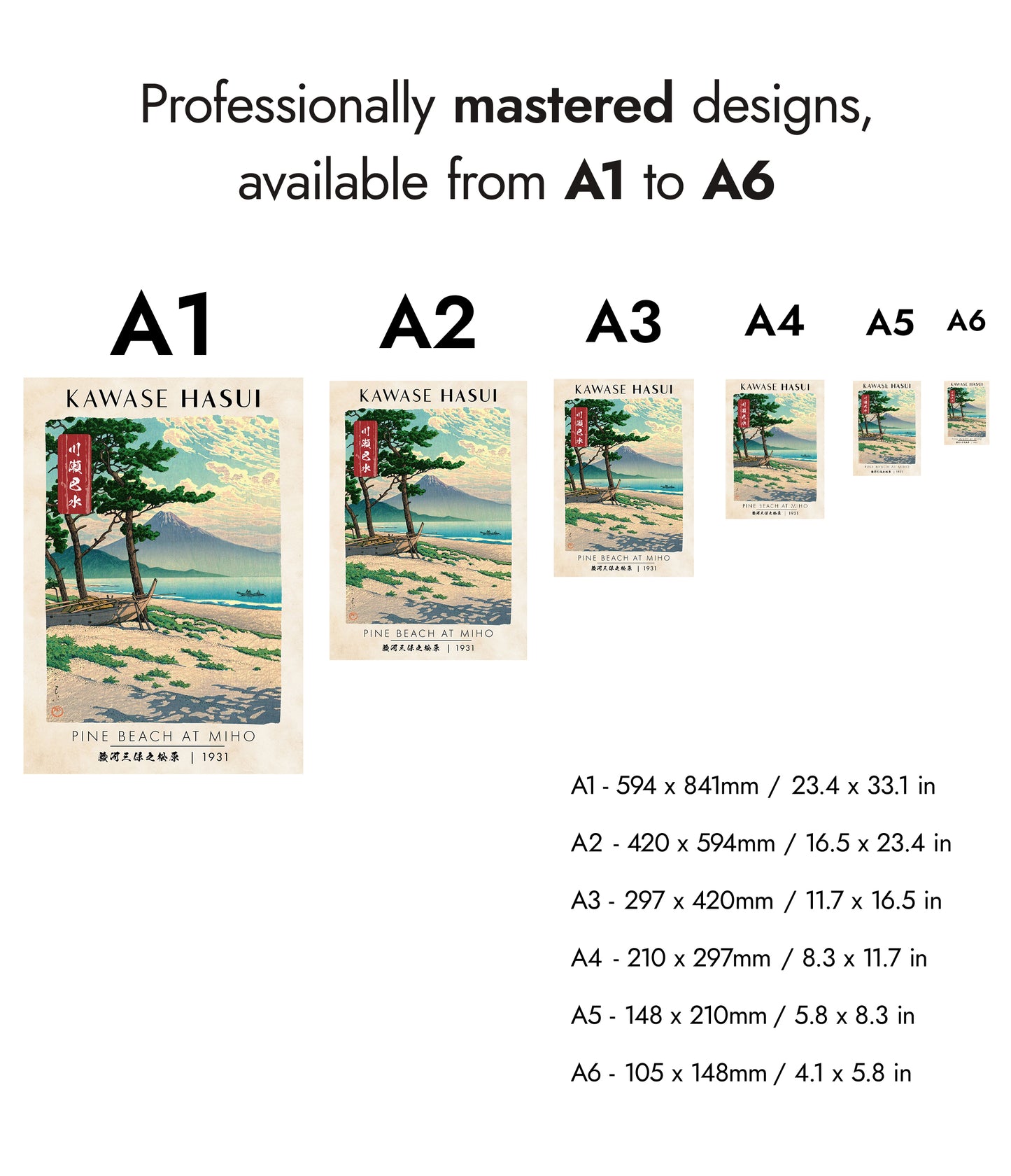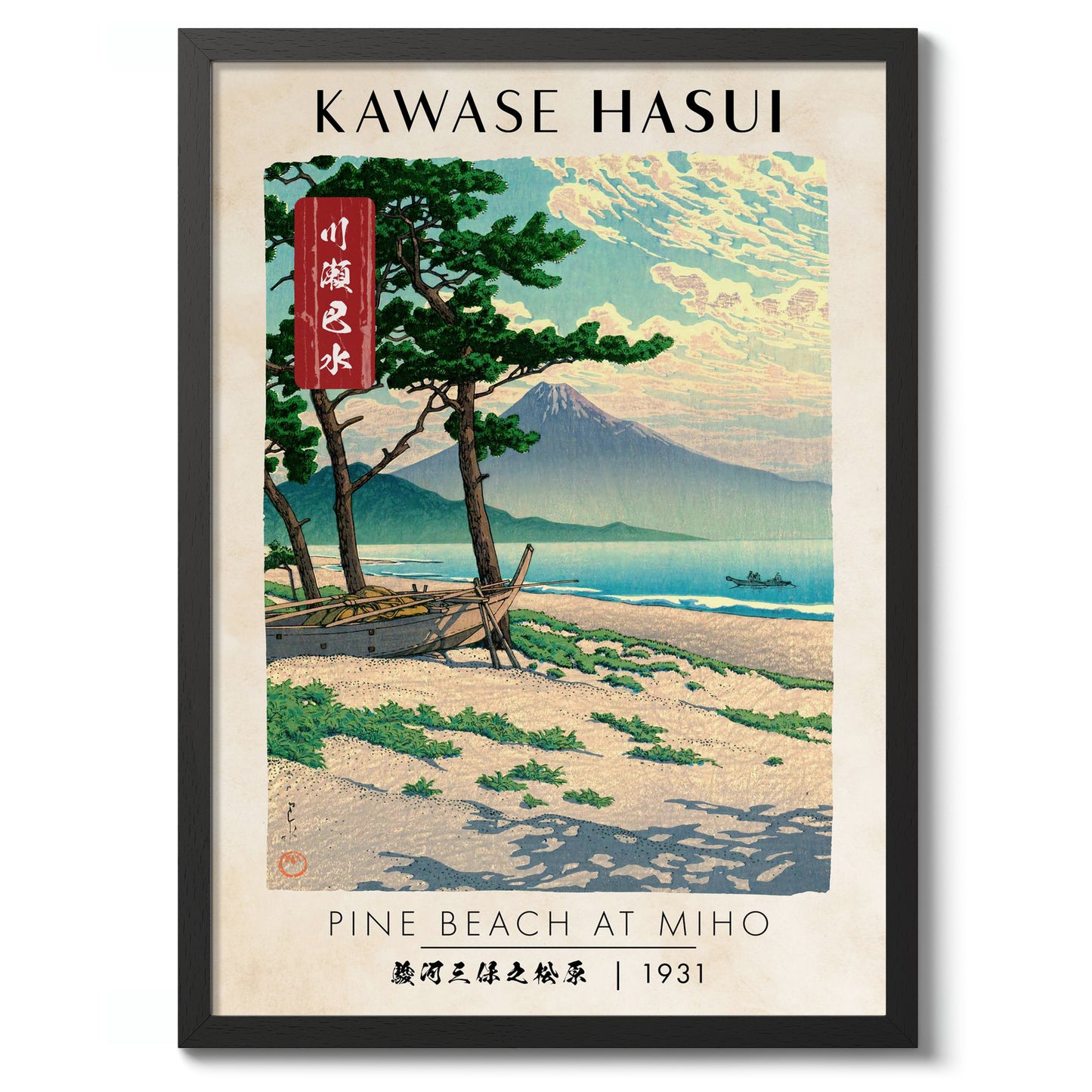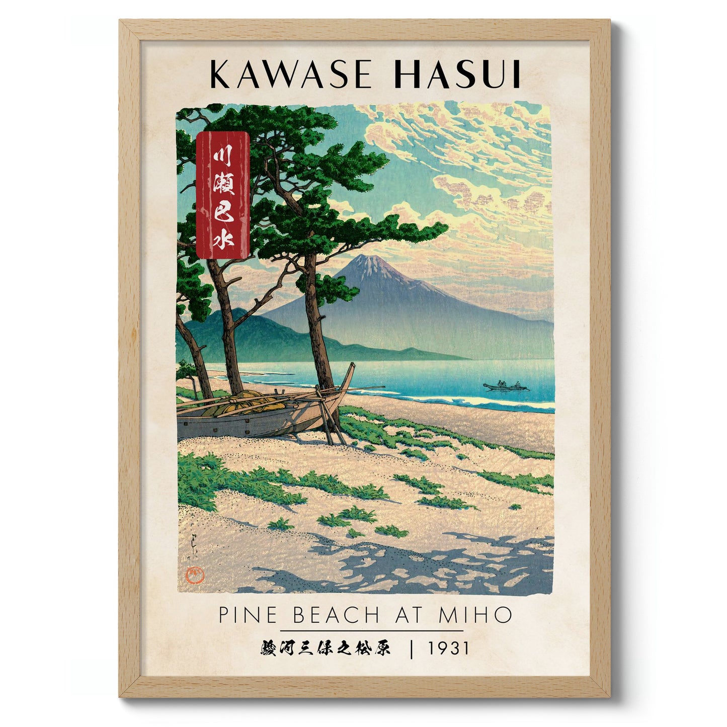 Kawase Hasui's "Pine Beach at Miho" art print captures a serene coastal scene, with harmonious layers of pine trees, a tranquil beach, and the iconic Mount Fuji in the background. This traditional woodblock poster, rich in intricate details and muted colors, reflects the peaceful elegance of Japanese landscapes and showcases Hasui's mastery in depicting natural beauty. Perfect for any art enthusiast.