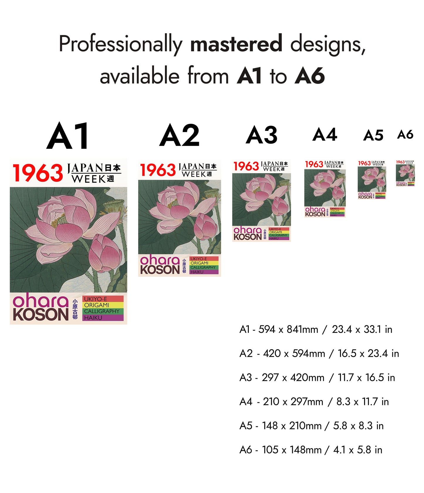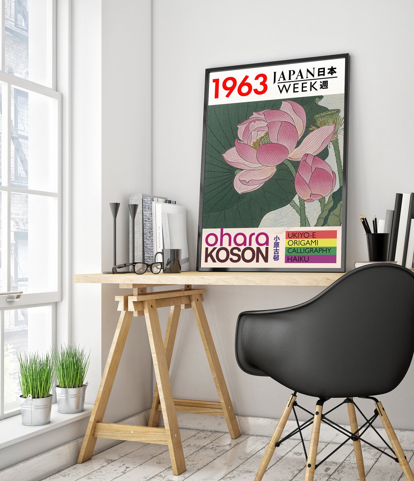 This 1963 Japan Week poster showcases Ohara Koson's serene woodblock illustration of a pink lotus blossom set against lush green leaves. Exemplifying the traditional Ukiyo-E style, the artwork captures the delicate beauty of water lilies, offering a tranquil depiction ideal for those drawn to floral and Japanese themes. Perfect for enhancing spaces with a touch of natural elegance.