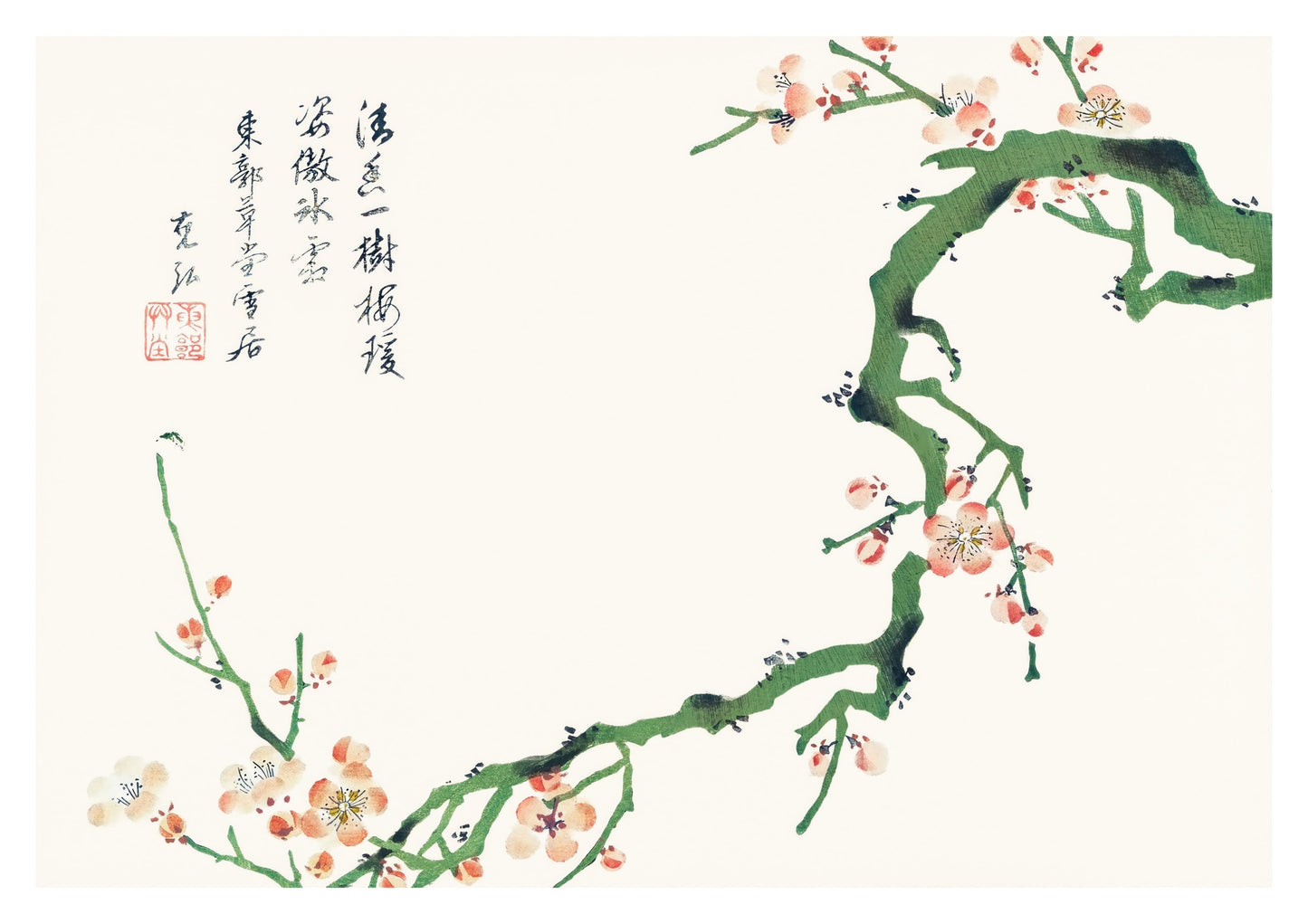 The "Pink Cherry Blossom" poster by Ooka Shunboku features delicate pink cherry blossoms gracing a gnarled green branch, set against a minimalist white background. Traditional Japanese calligraphy enhances the composition, blending nature-inspired beauty and cultural artistry. Ideal for adding a touch of serenity and elegance to any space.