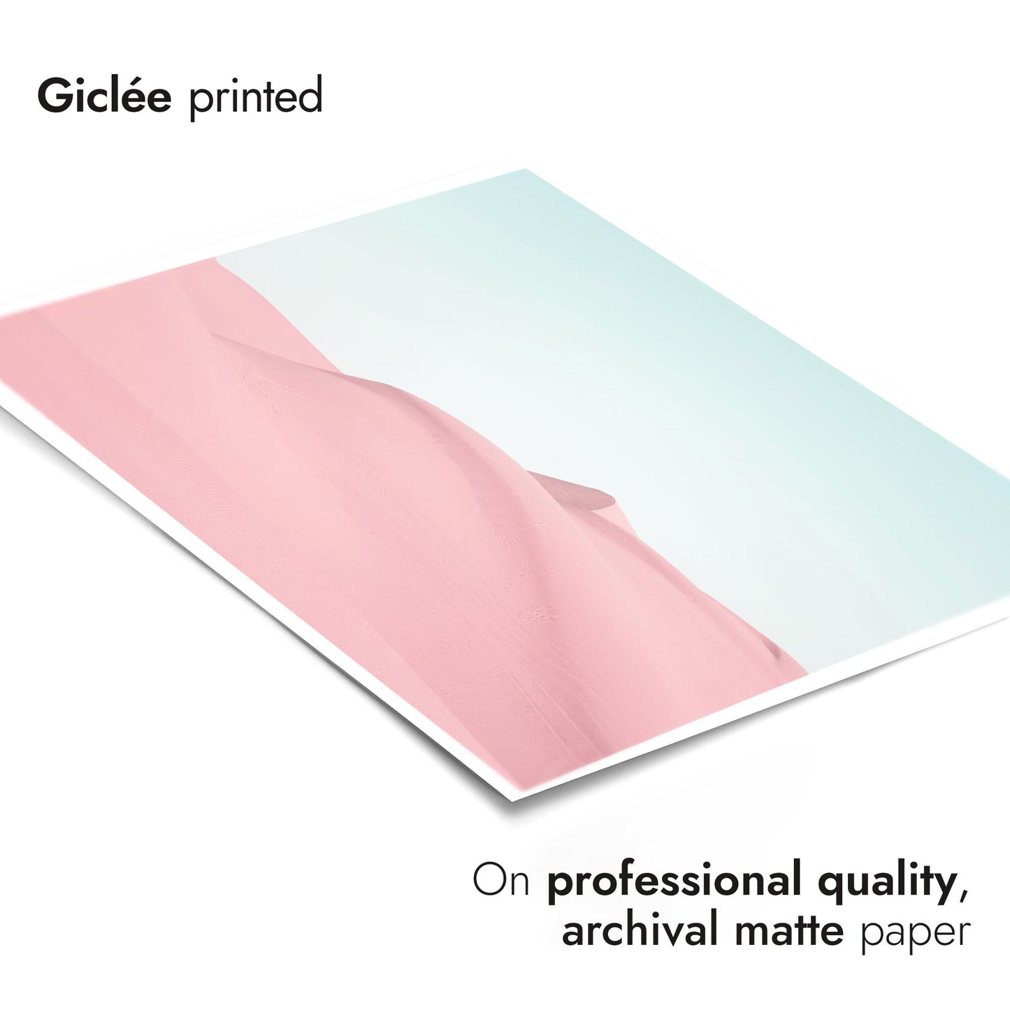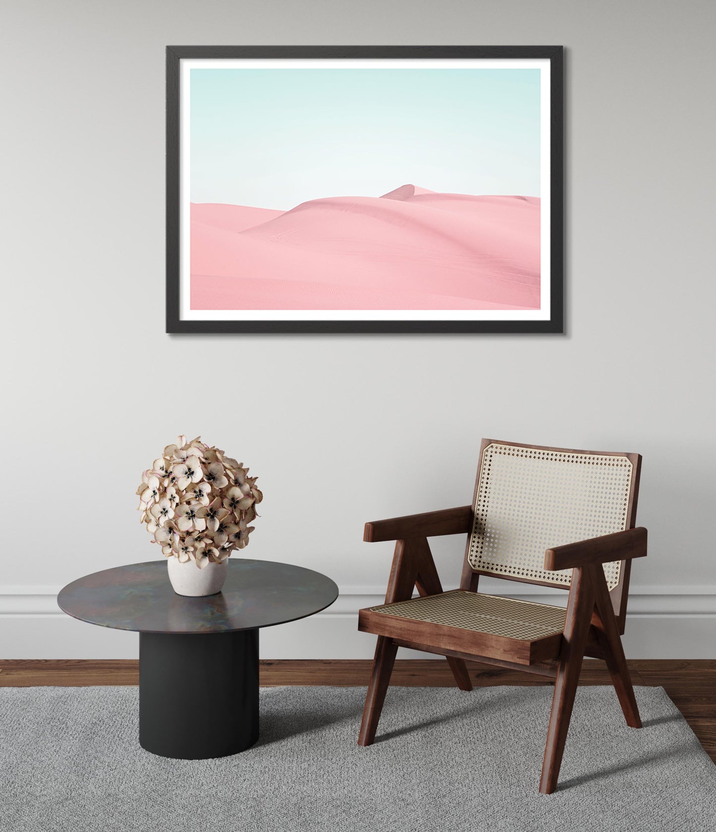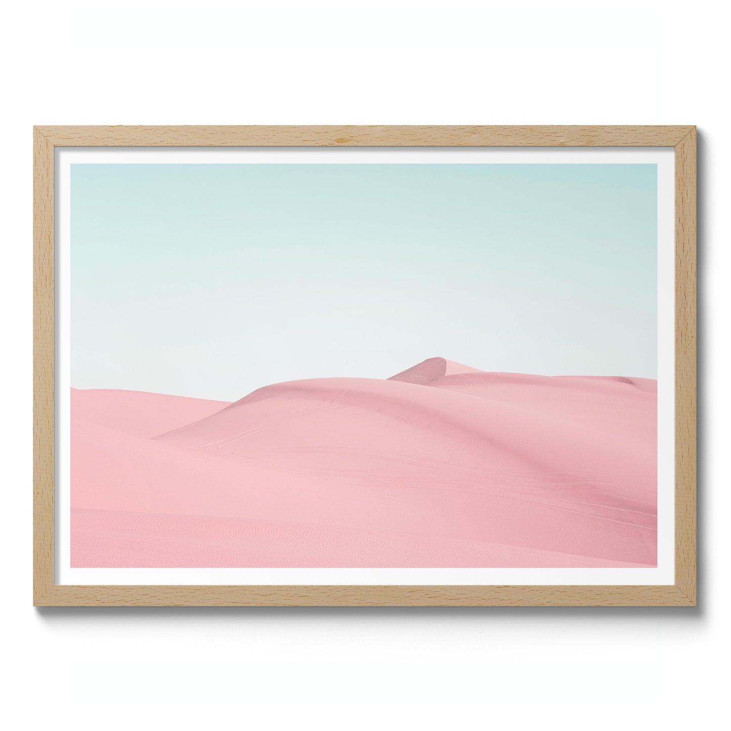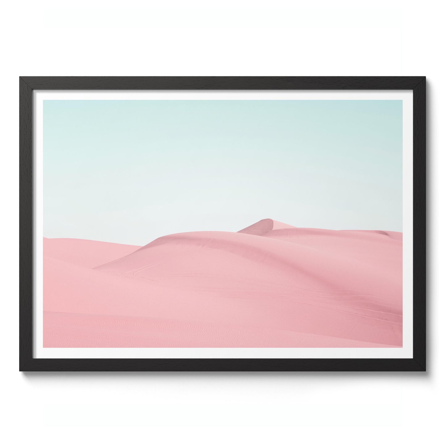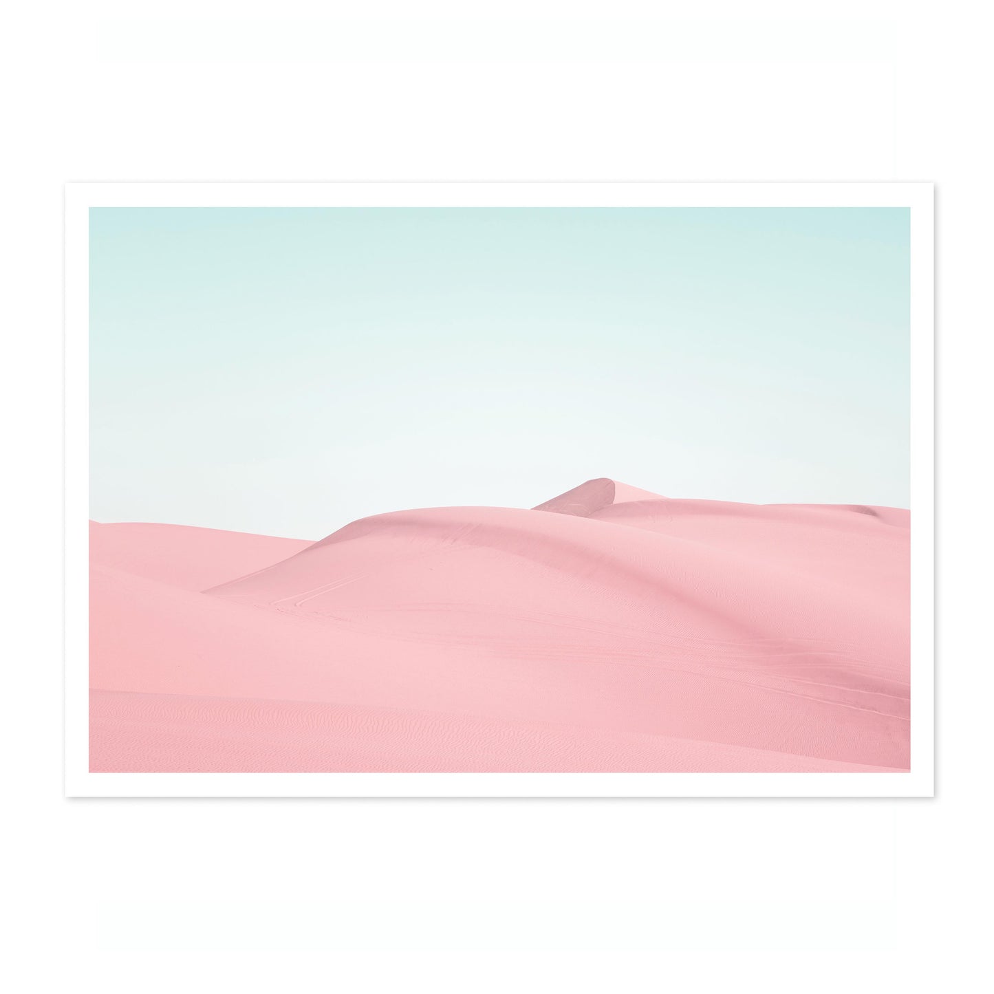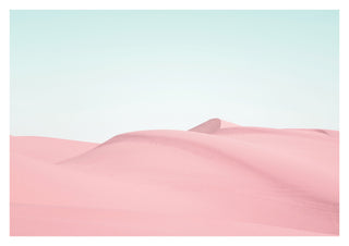 This photographic minimalist poster, "Pink Desert," captures the serene beauty of rolling pink-hued dunes under a pale, ethereal sky. Its modern landscape style brings a tranquil and contemporary touch to any space, perfect for those seeking desert-themed artwork with a unique colour palette. Ideal for modern and minimalist decor.