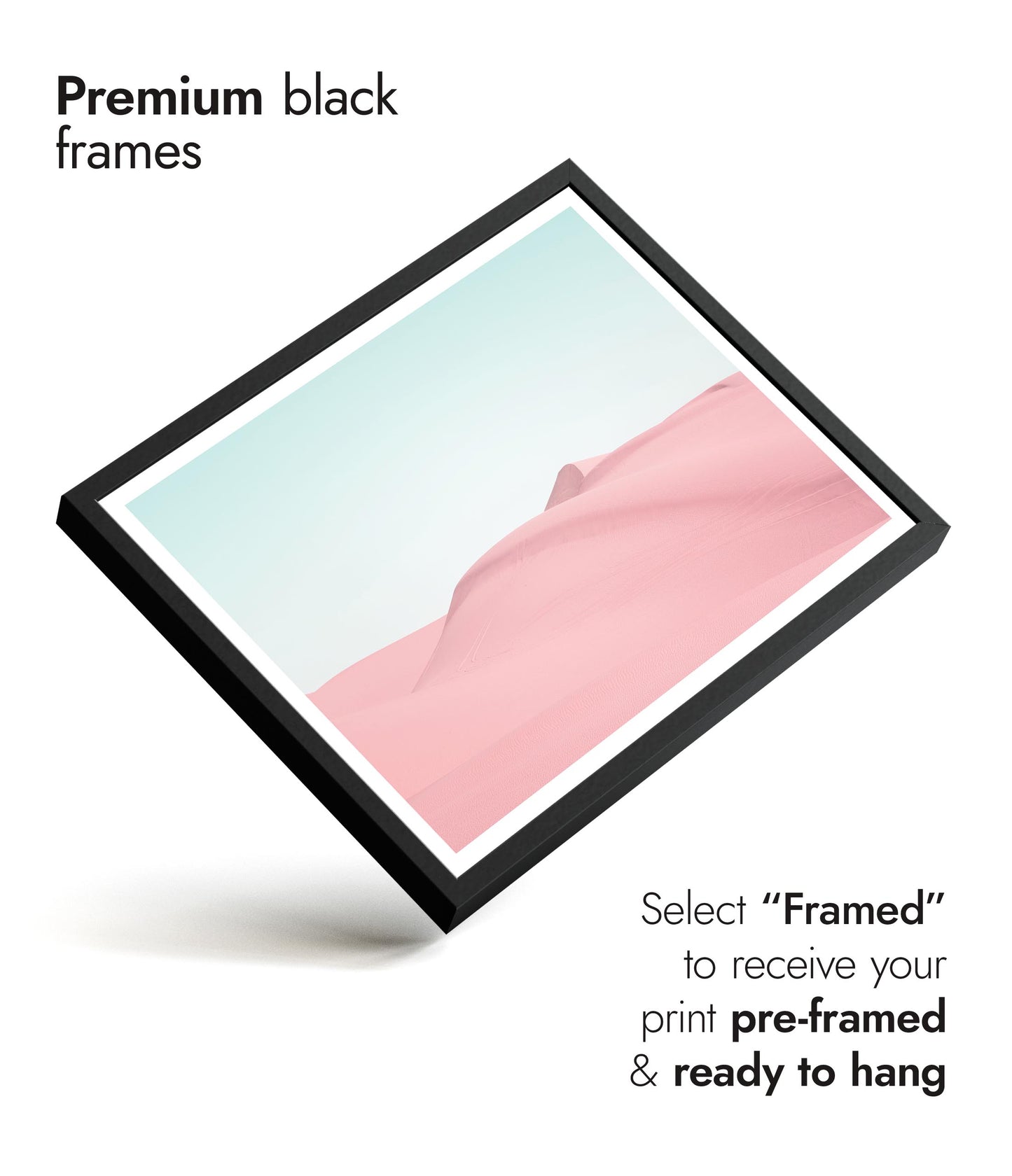 Solid wood frames available in black stained or natural finishes, with UV resistant acrylic glass. Framed orders arrive pre-installed with your choice of print, ready to hang. Available in all print sizes.