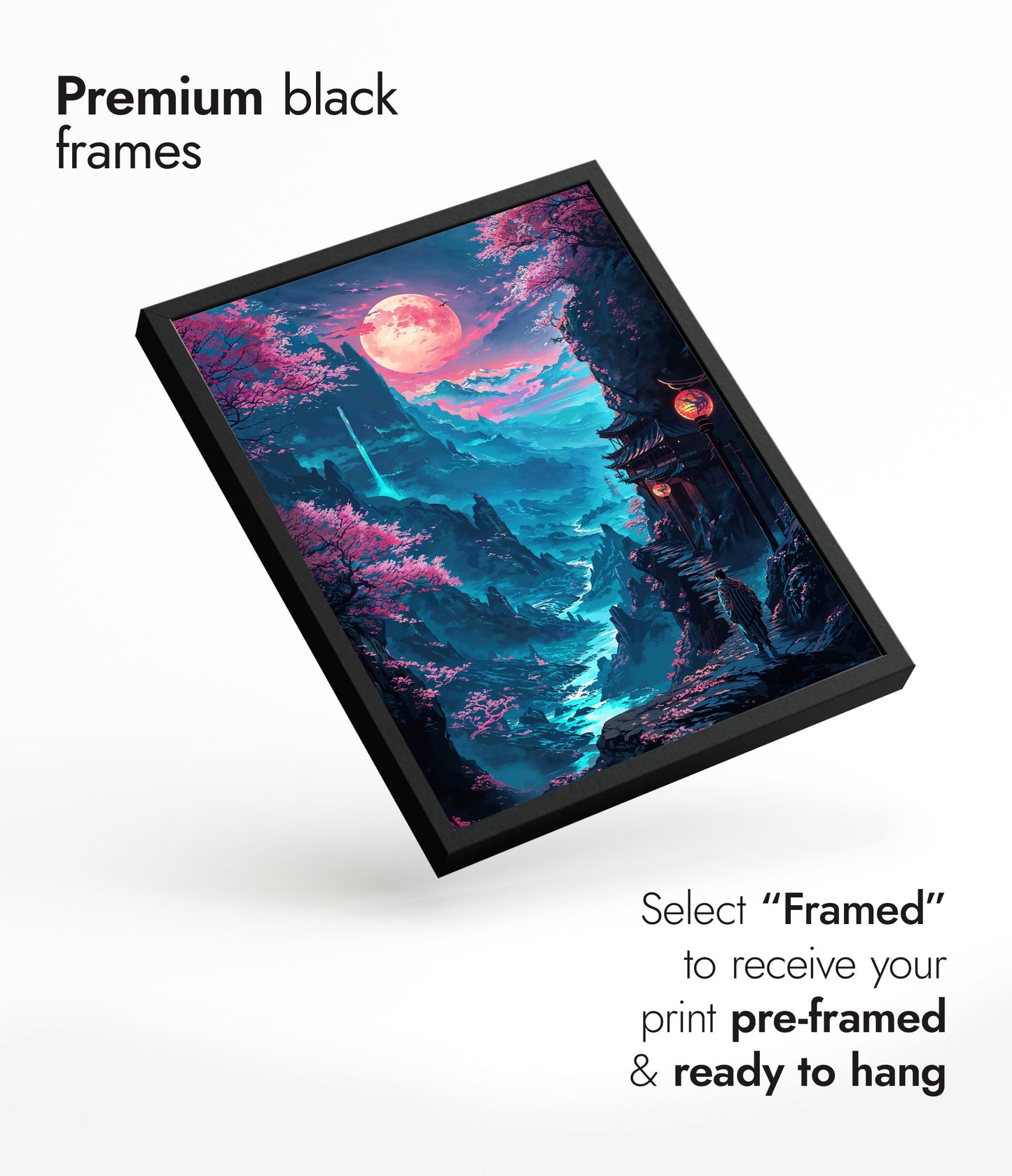 Solid wood frames available in black stained or natural finishes, with UV resistant acrylic glass. Framed orders arrive pre-installed with your choice of print, ready to hang. Available in all print sizes.