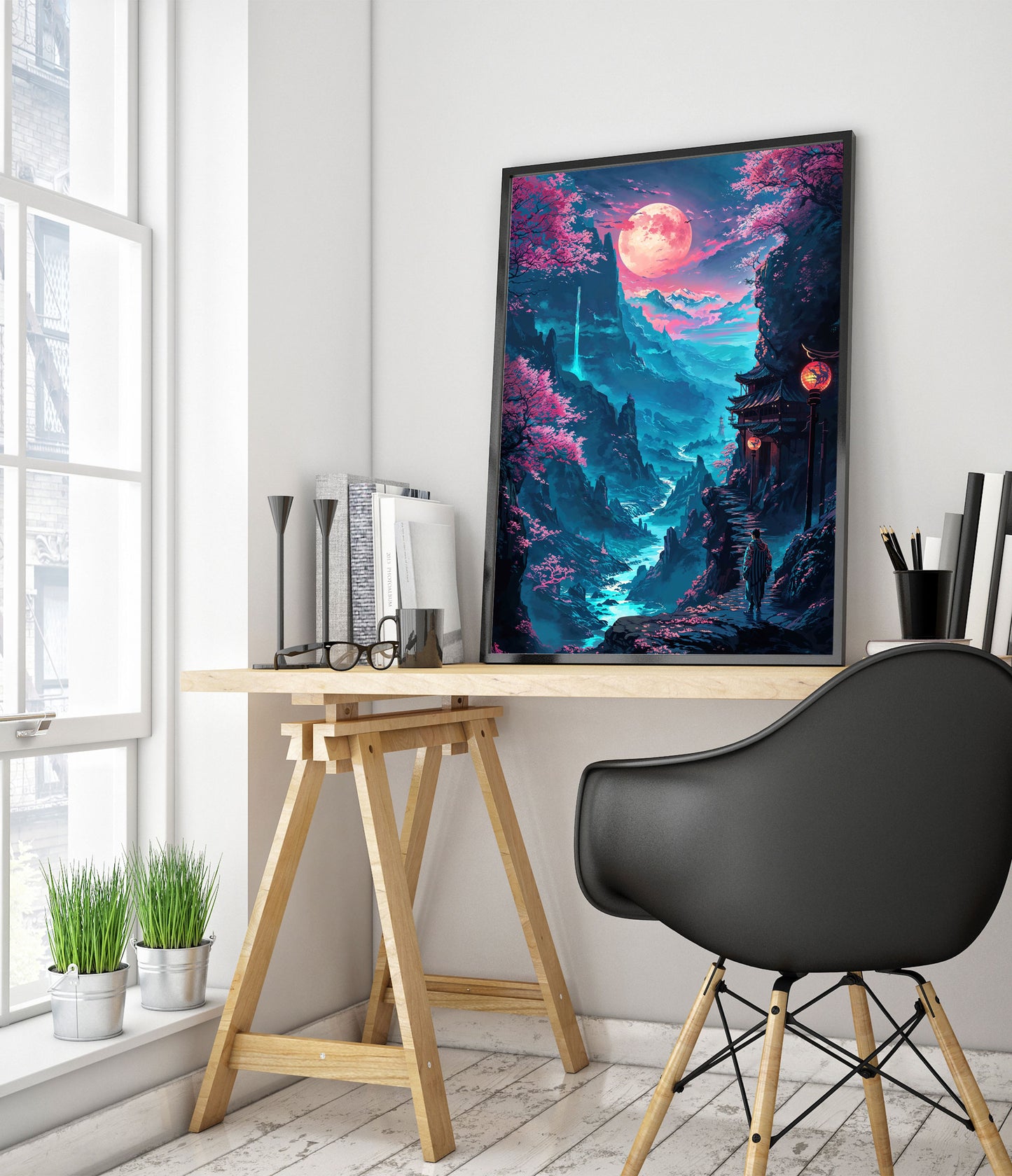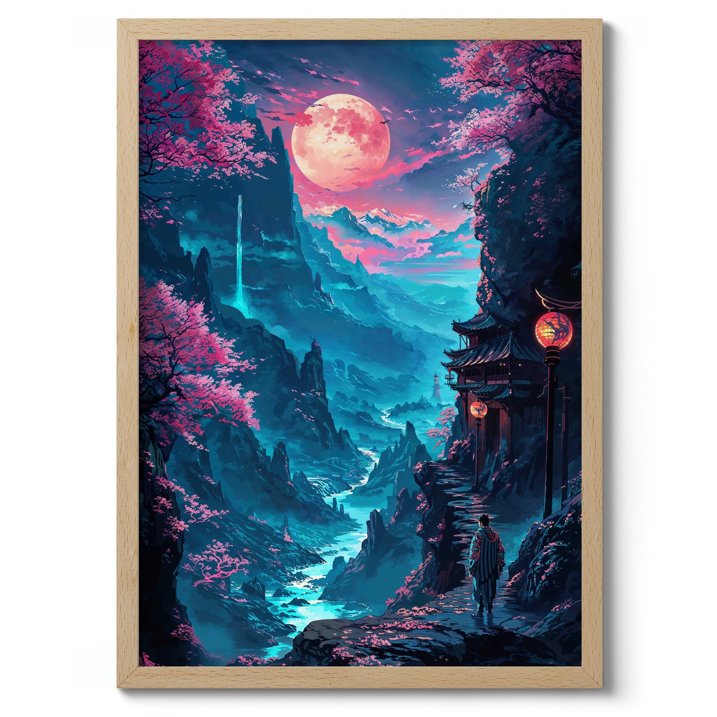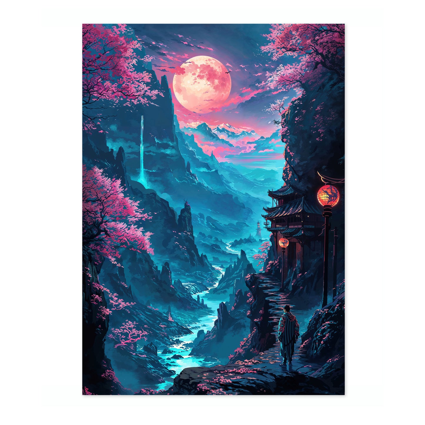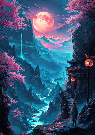 This captivating poster, titled "Pink Mountains 2," showcases an enchanting anime-inspired scene of a serene valley illuminated by a glowing moon. The artwork features surreal, vibrant pink trees set against a backdrop of majestic mountains and a winding river. A lone figure stands near traditional architecture, enriching the modern illustration with a touch of mystique. Perfect for lovers of fantasy and nature themes.