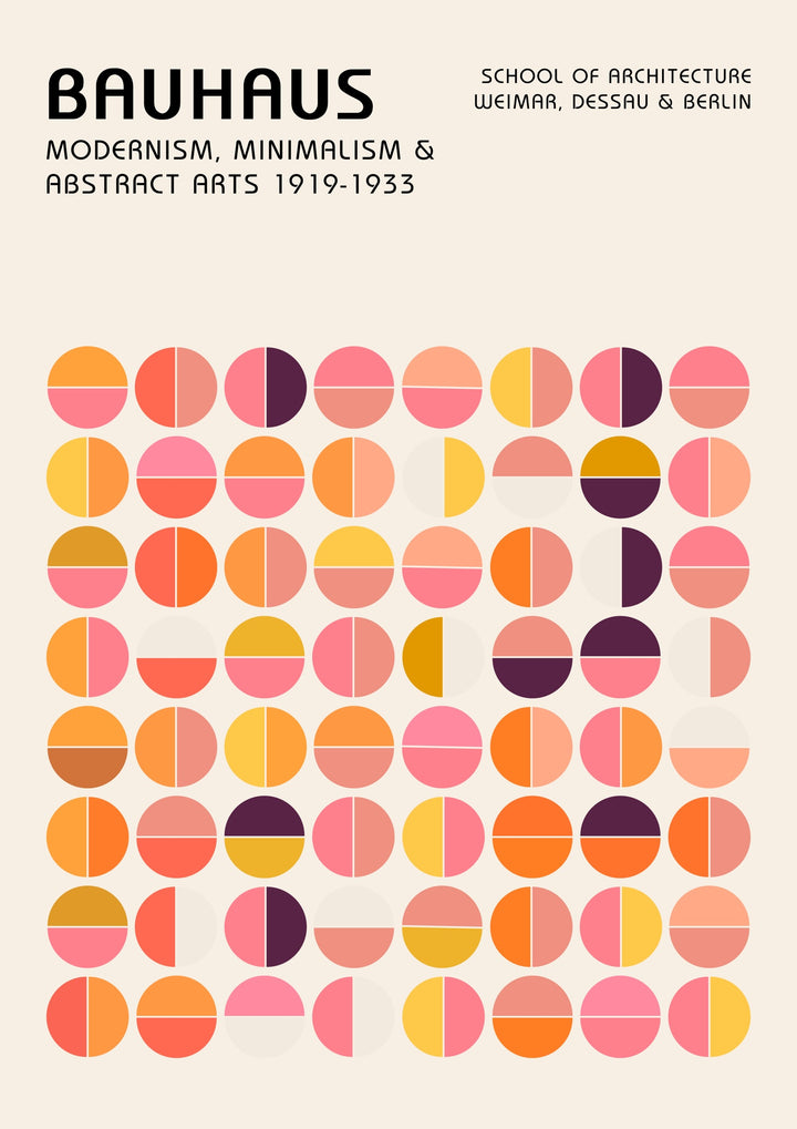 This Bauhaus poster titled "Pink & Orange Circles" features a vibrant and geometric design rooted in mid-century modernism. The artwork showcases a pattern of overlapping pink, orange, and yellow circles, creating a dynamic and abstract aesthetic. Perfect for those who appreciate graphic and minimalist styles, it represents the influential Bauhaus school of architecture and abstract arts.