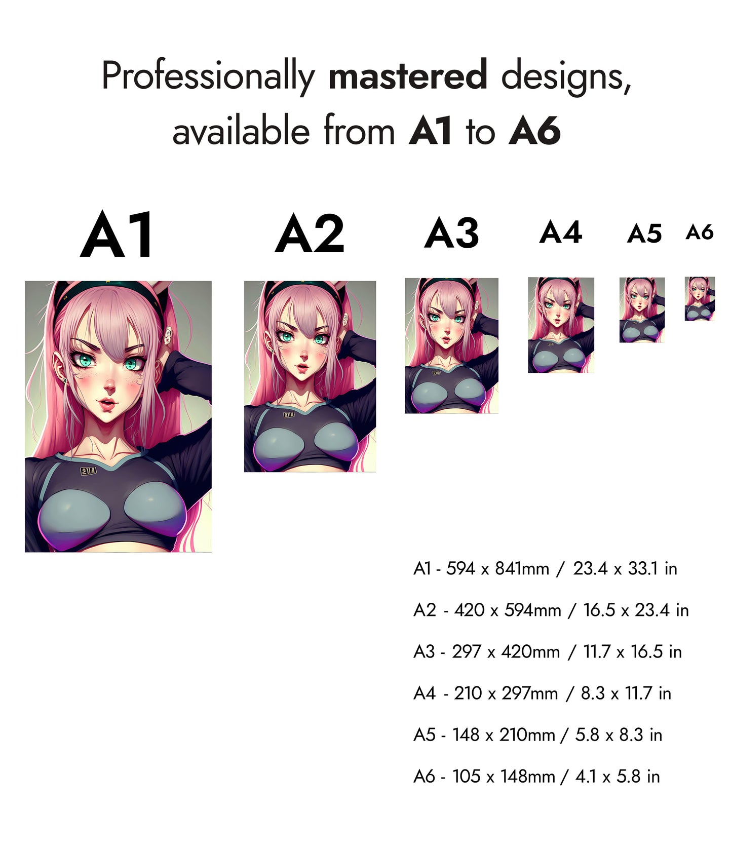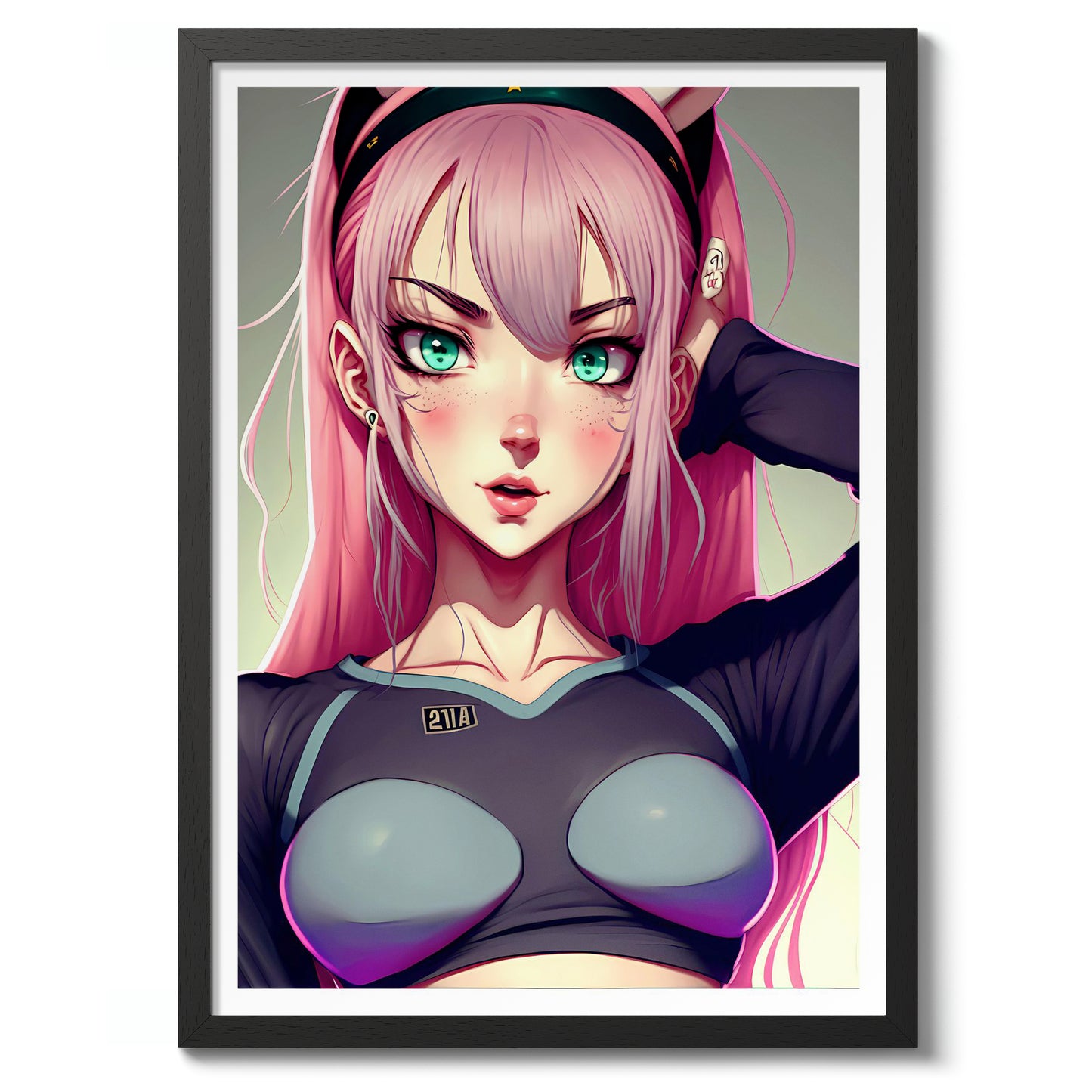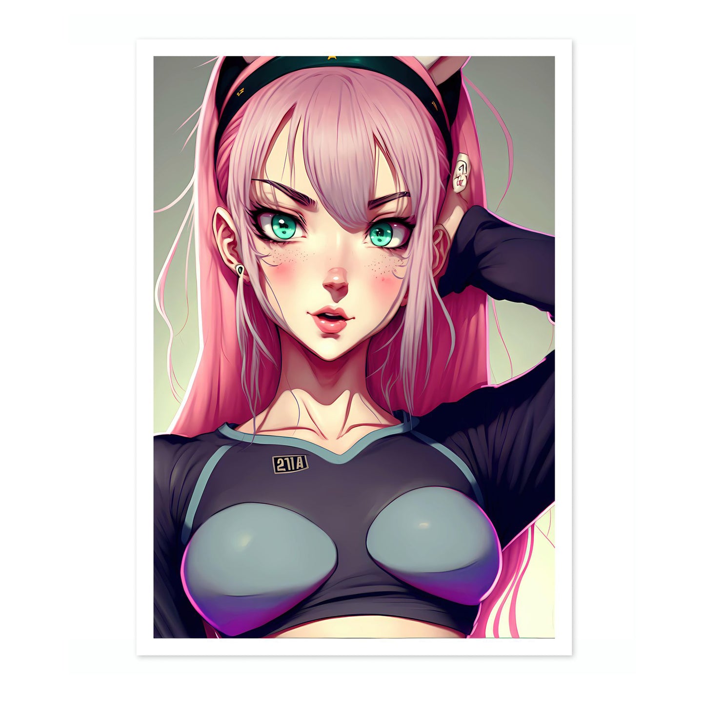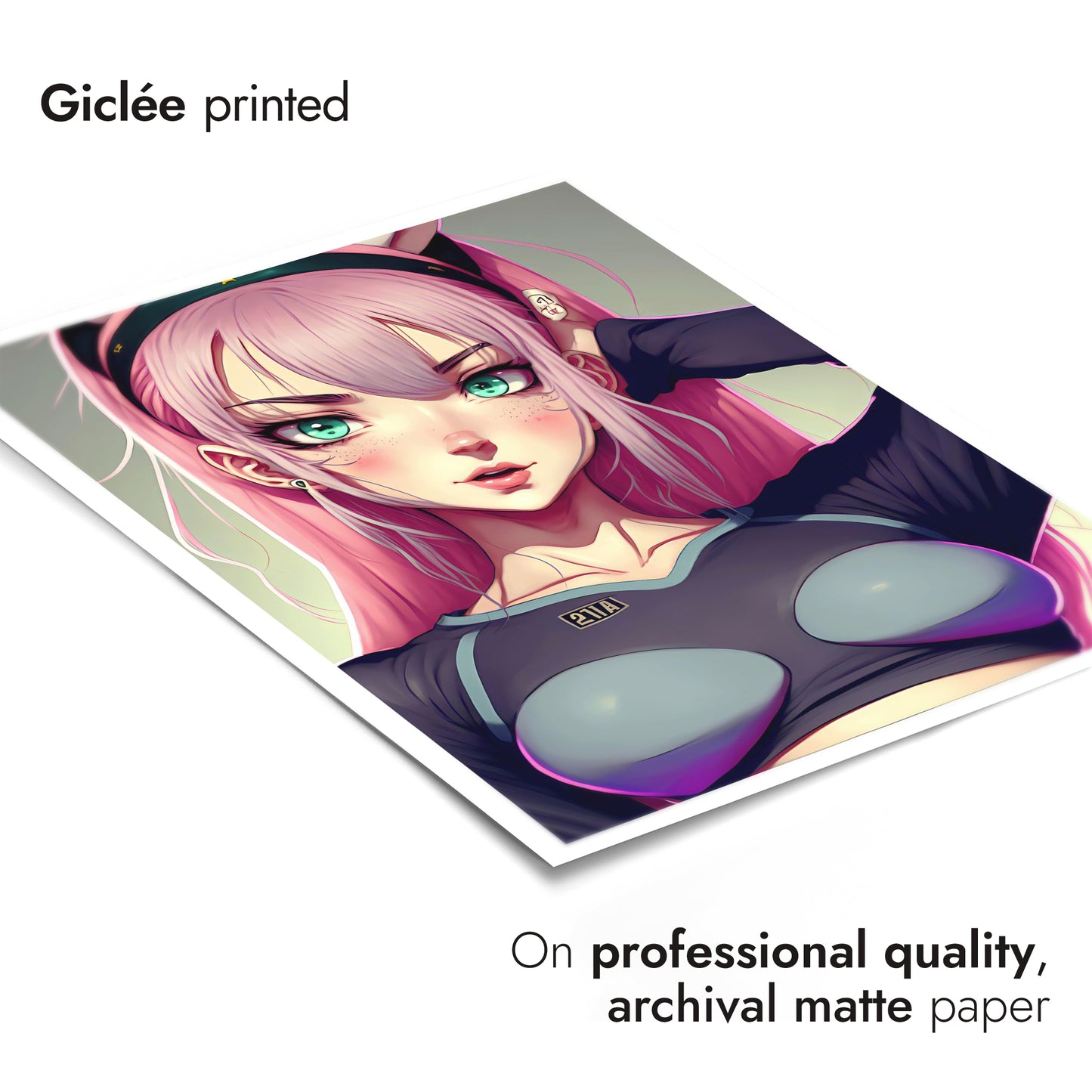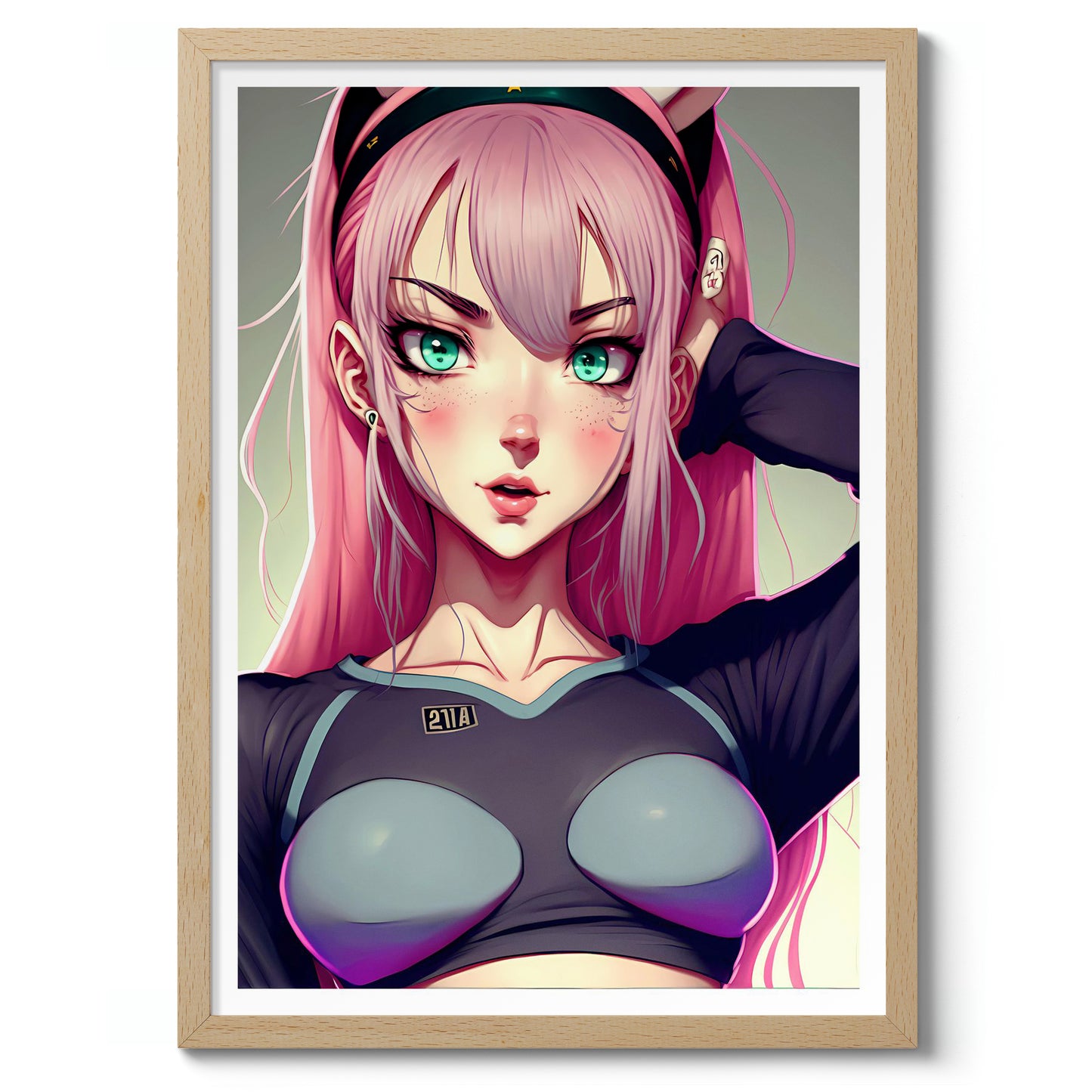 This vibrant anime poster, "Pink Waifu," features a striking pink-haired character set against a subtle gradient background. Her expressive teal eyes and confident pose highlight modern anime illustration style. Perfect for fans of Japanese-inspired artwork, this piece exudes charm and personality, making it a compelling addition to any space celebrating anime culture.