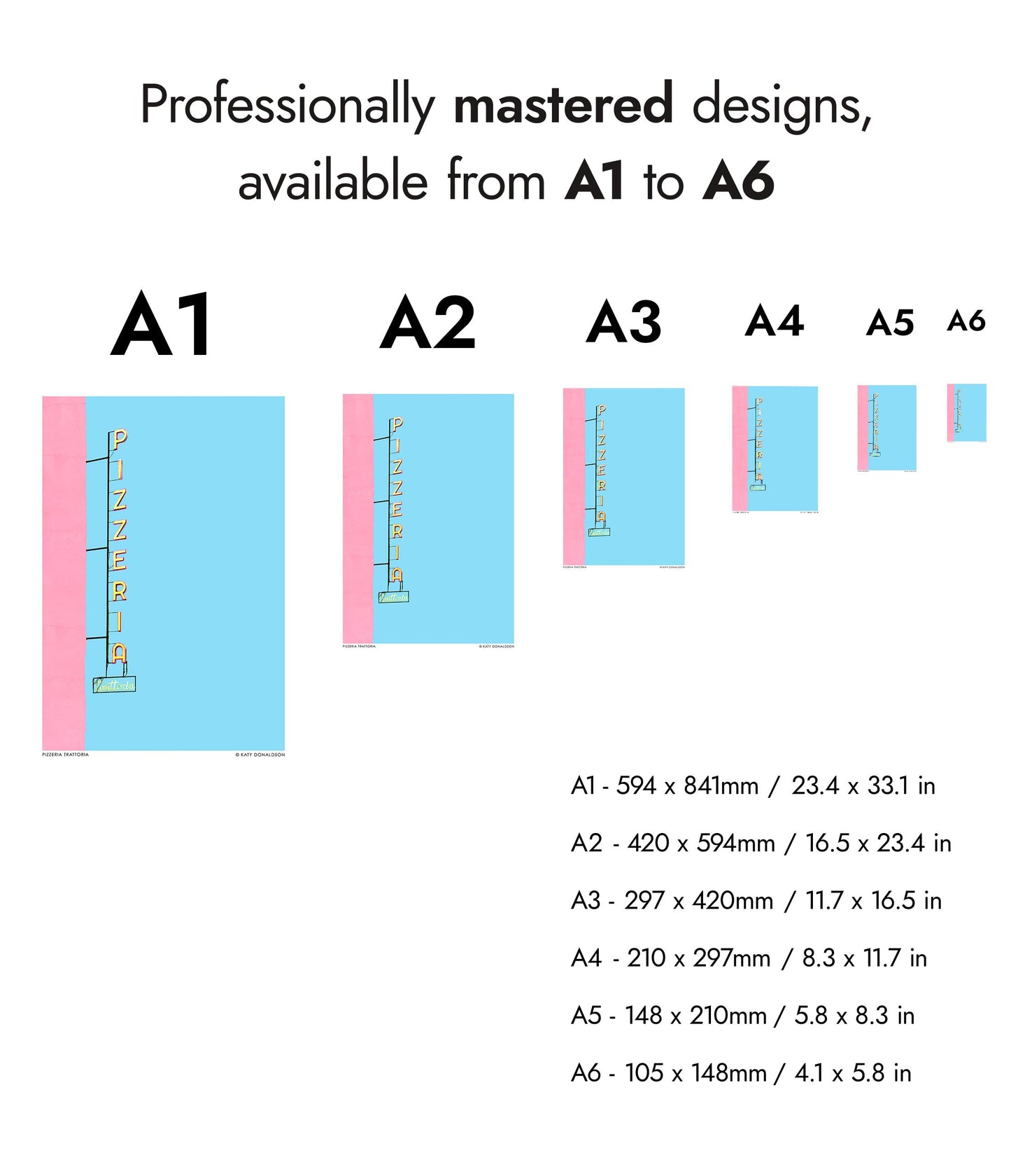 8 colour giclée print process on high-quality 230gsm archival matte paper. All our paper is FSC Certified and prints come with a lifetime fade-resistance guarantee.